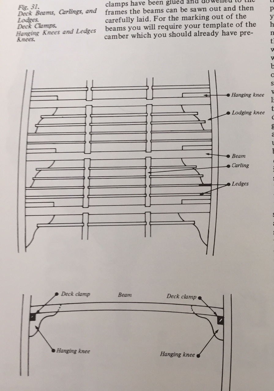 Между верхними частями шпангоутов (тимберсами) вставлены поперечные связи - бимсы, служащие опорой для настила палубы.