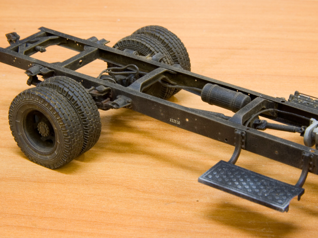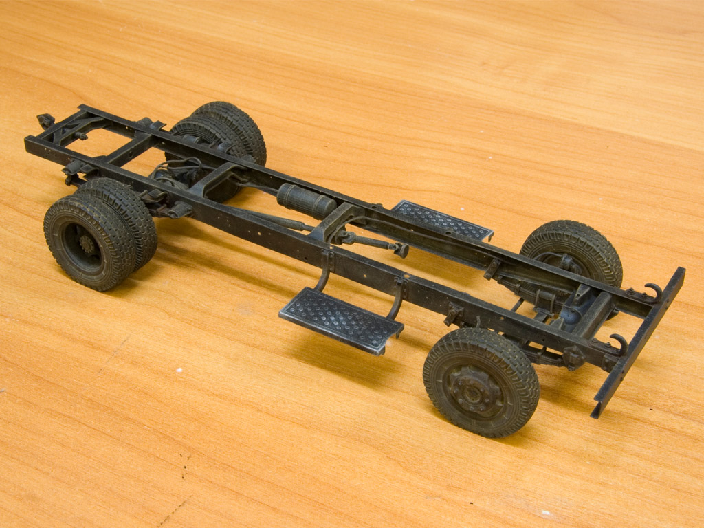 Собрал подвеску. Еще появились ресивер, кардан и подножки. Дальше окраска рамы и постановка на колеса, которые у меня очень кстати уже покрашены (остались от тестовой сборки конверсии на Трумпетер).