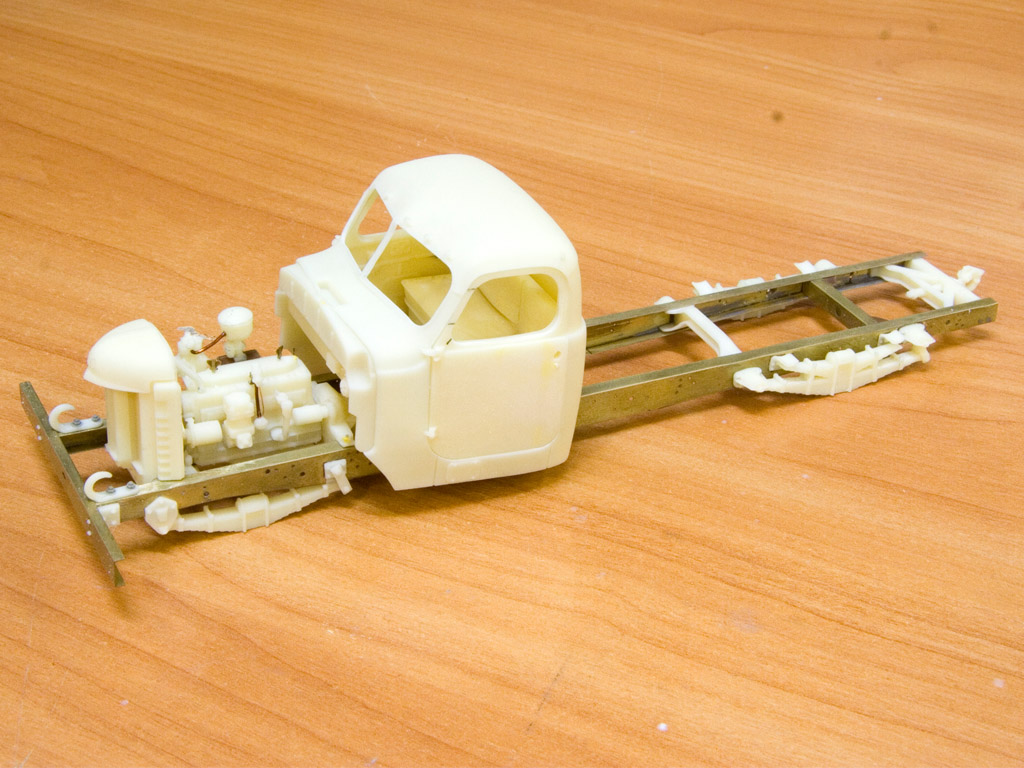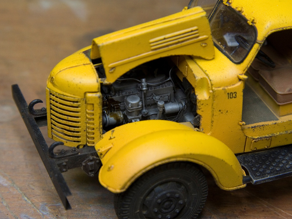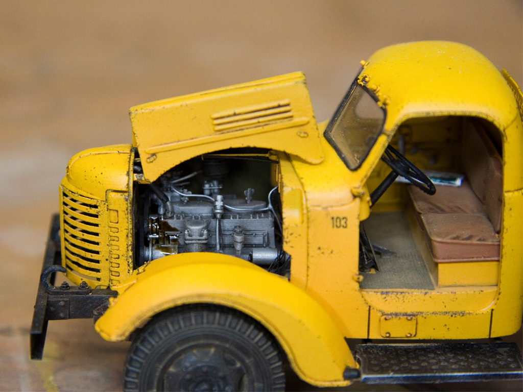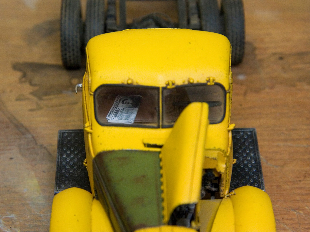 Продолжаем. Посадил кабину на место. Облил движок маслом. По задумке рядом должен встать озадаченный водитель. Еще сделал проводку и видимую часть трубок под капотом. В кабине поселился тов. Сталин в двух вариантах, в газете и на задней стенке. Теперь нужно что-то придумать с топливным баком. Он стоял за кабиной и у него должны быть другие крепления, плюс горловина с торца. В каждом наборе есть свой бак. Наш бак стандартный, горловина на длинной стороне, отлит вместе с креплением. у ZZ бак не похож на настоящий, нет выштамповок, плюс отлит фигово, есть смещение половин и непонятные мне дыры в сварном шве. Зато горловина на торце. Думаю, что бак буду переделывать из нашего.