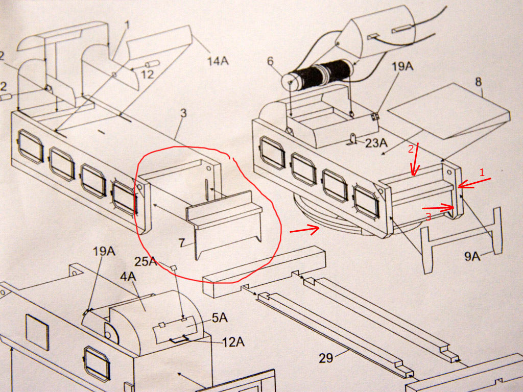 Второе сложно объяснить... Есть сложности с деталью 7, передней стенкой. У нее есть посадочное место, казалось все просто. Но если ставить по инструкции в месте обозначенном "1" будет щель после наклейки травла "7А". Её там быть явно не должно. Так же появляется щель в месте "2" между передней стенкой и крышей установки.