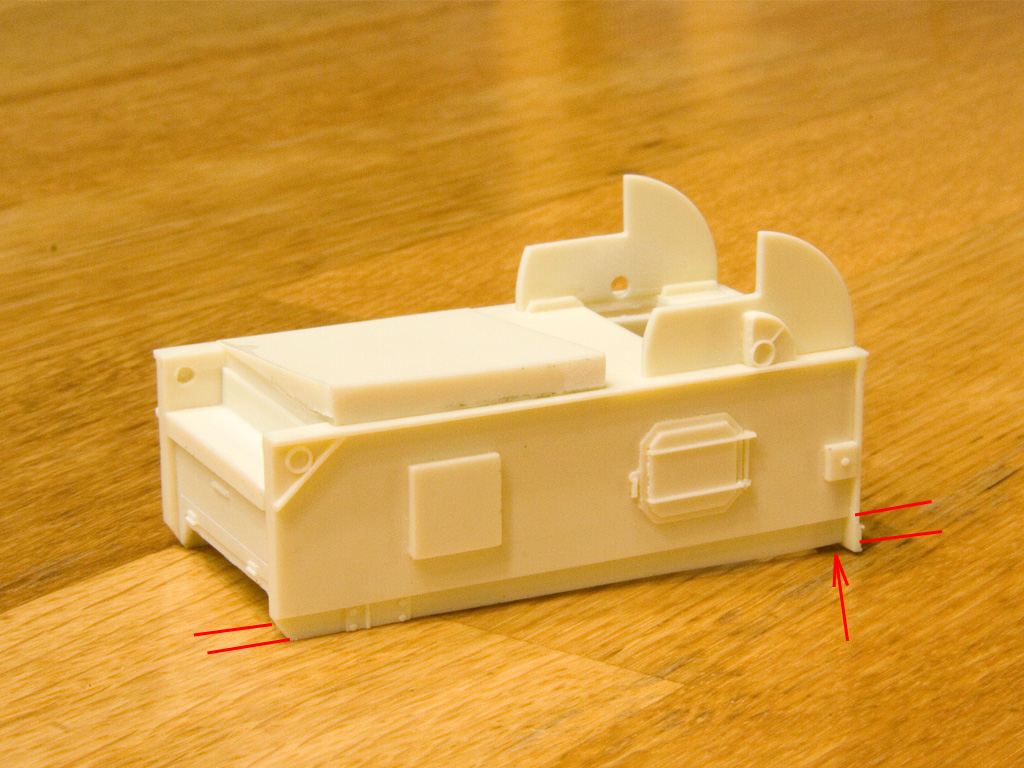 Итак, продолжим. Чтоб фото не перемешались разделю сообщения. Во-первых нижняя часть боковин корпуса в передней части тоньше чем в задней на 1 мм. При этом задняя стенка, которая выполнена отдельной деталью, еще на 0,7 мм вылезает. сточить ее нельзя, т.к. на ней есть ребра. Надо будет наращивать боковины.