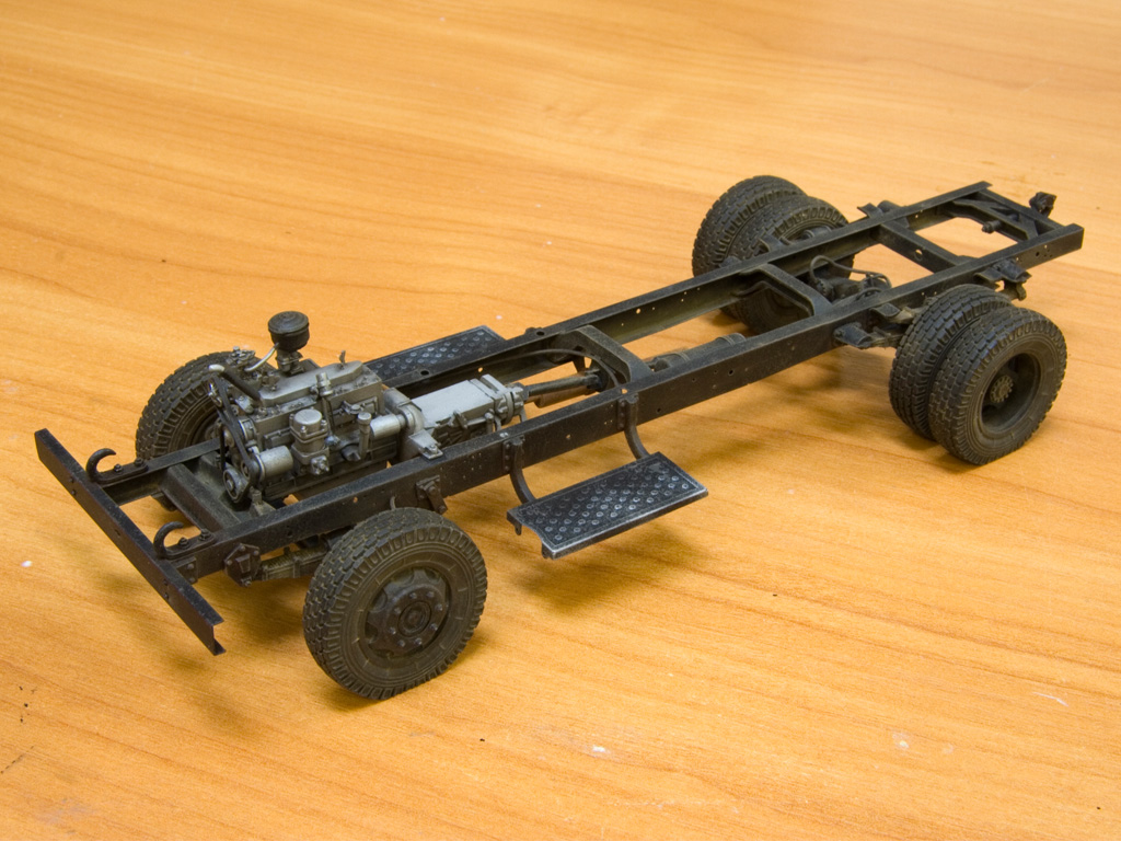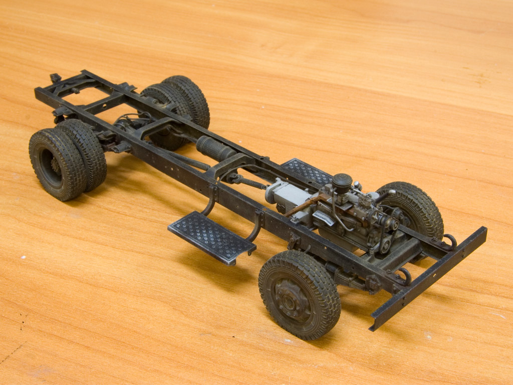 @Velik написал:Собрал подвеску. Еще появились ресивер, кардан и подножки. Дальше окраска рамы и постановка на колеса, которые у меня очень кстати уже покрашены (остались от тестовой сборки конверсии на Трумпетер