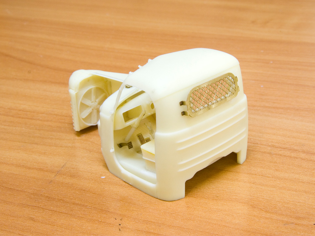 Пришлось исправлять. Добавил номер рамы... По информации от нашего товарища Stivа, он должен быть на правом лонжероне за кабиной, нашел пару фото ЗиЛ-130 в сети. Вроде так, но сомнения остались... Собрал интерьер кабины. Решетку радиатора и защитную сетку на заднем окне решил помять. Еще хочу попробовать открыть левую половину капота. Для этого пришлось срезать левую часть, разделить по линии сгиба и прилично сточить. Теперь нужно сделать крепление капота и можно будет покрасить.