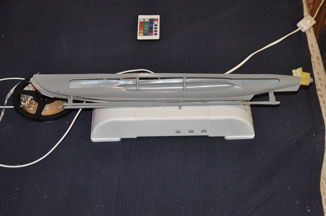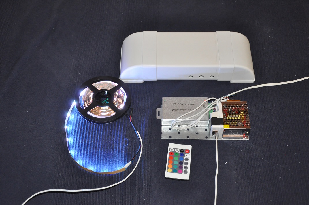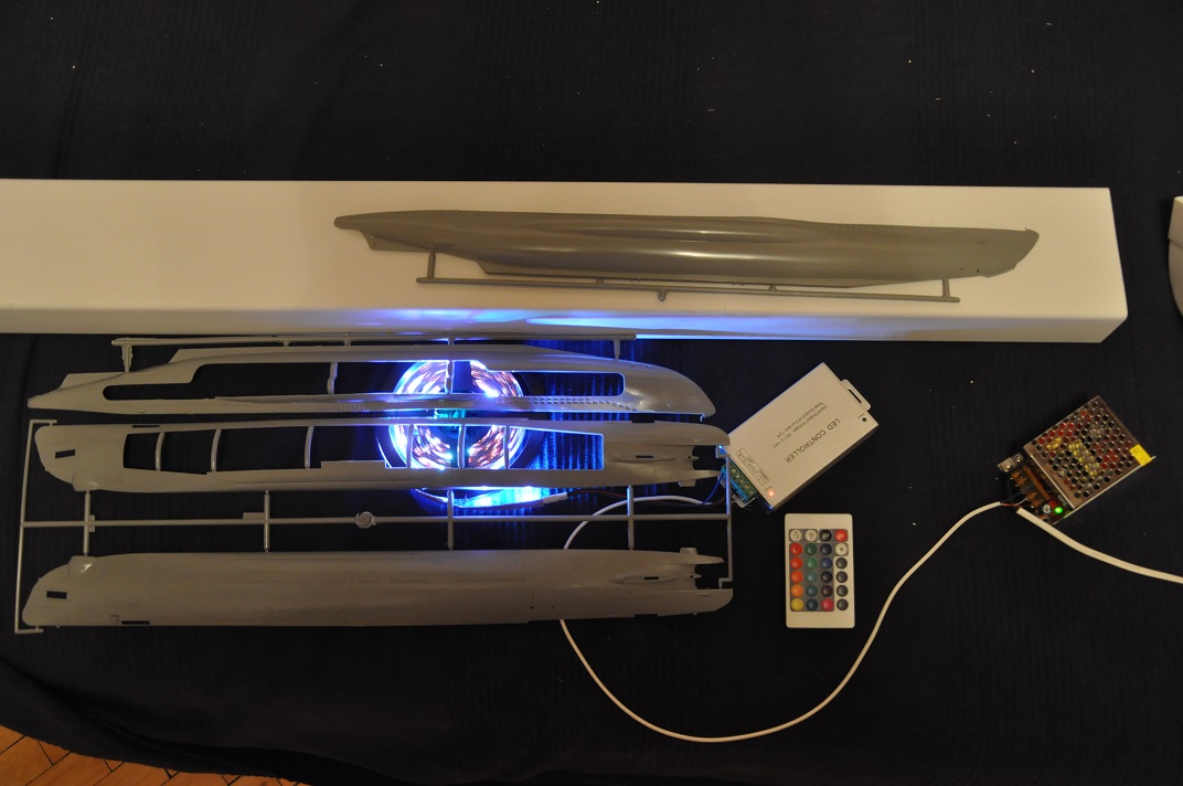 Первое, чем занялся - светотехникой. Про светодиоды не знал ничего, кроме того, что они в природе существуют. Погуглил, почитал статьи, понял, что там не особо сложно самому подсветку собрать - в итоге прикупил цветную светодиодную ленту Gauss (7 ватт/метр) , два блока питания по 30 ватт и два контроллера с пультами управления. Все это хозяйство решил упрятать в подставки лодки - так, чтобы от нее только шнур питания уходил. К сожалению, блок питания показался двольно толстым - и подставка с ним внутри тоже будет толстой. Хорошо, что лодки большие.
