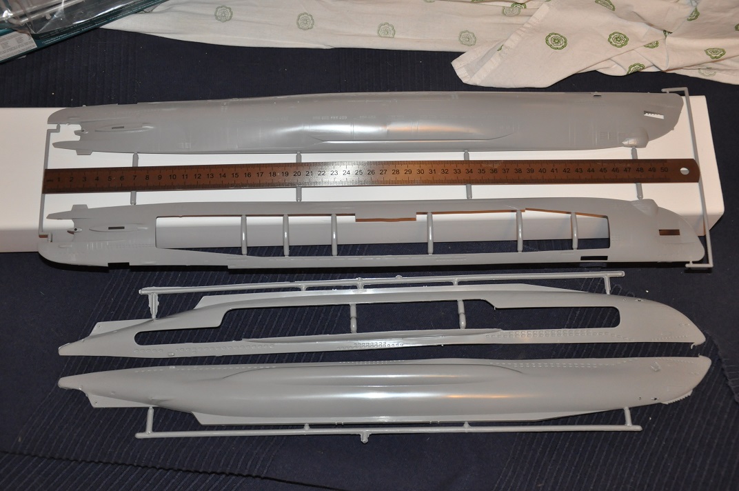 После масштаба 1/350 эти лодки кажется просто огромными. Жалко, что масштаб у них не одинаков - видимо, подгоняли масштаб, чтобы лодка в полметра длины укладывалась. Качество отливок не идеально, кое-где торчит облой, кое-где не хватает деталек (от лееера семерки кусок явно отвалился), но явных косяков я на первый взгляд не увидел. Сборка покажет