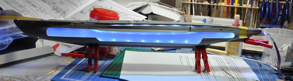 Продолжаю шлифовать детали. Половинки рубки пришлось склеить - иначе не устранить дыры прямо на передней поверхности рубки. Соотвественно придется поменять порядок окраски рубки. Рельсы для торпед приклеил к местам под палубой. Когда схватится - срежу вместе с крепелениями, потом приклею обратно на подсветку. Сделал часть электропроводки - тонкие провода протянул по низу лодки от середины и прихватил СА клеем. Сделал ввод питающего провода - через киль лодки