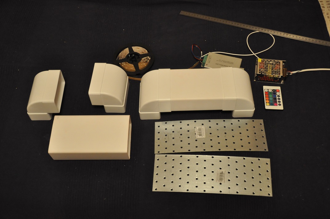 Съездил в строительный магазин, там по месту подобрал все запчасти. В качестве основы вполне себе подошла пластиковая труба прямоугольного сечения для вентиляции. Единственное, чего опасаюсь - что при долгой работе блока питания он пластик может перегреть и тот потечь. Поэтому часами подстветка гореть не будет - включили, посмотрели, выключили. Из этого понимания были куплены: