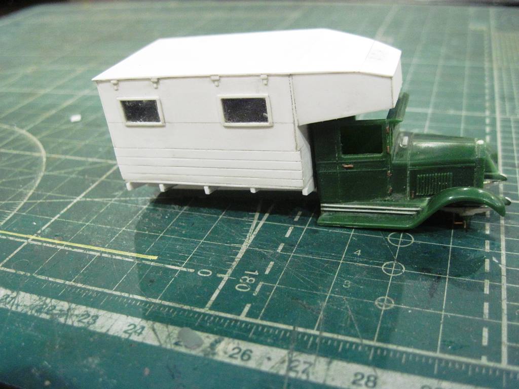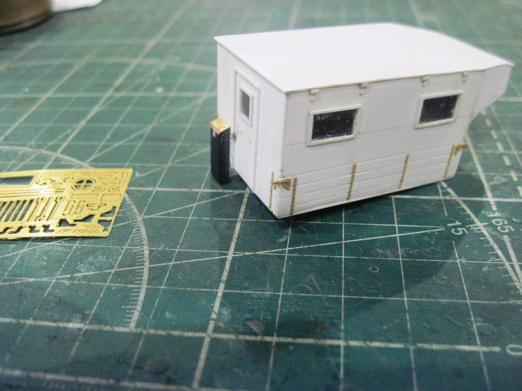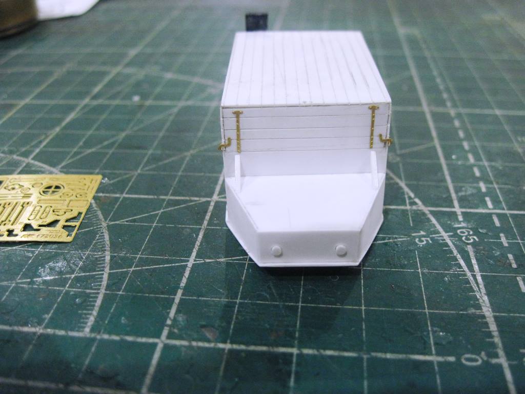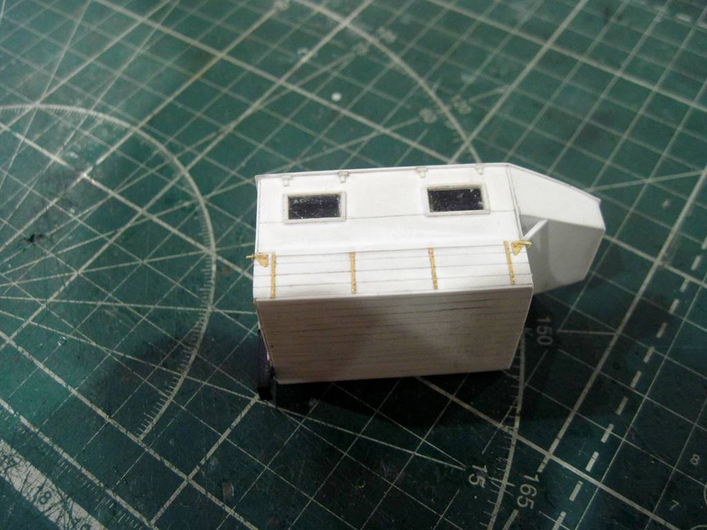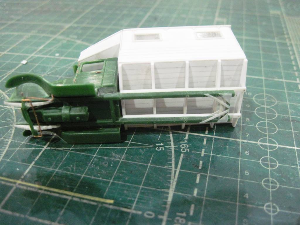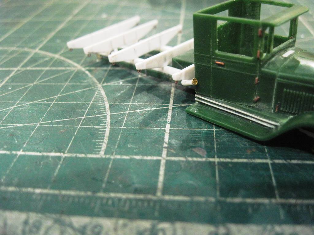 Склеил кунг.. На боковых откидных бортах (верхних) имитировал механизм открывания. Петля - тянутый литник 0,4 мм, сама петля - сточенный квадратный пруток 0,5 мм.