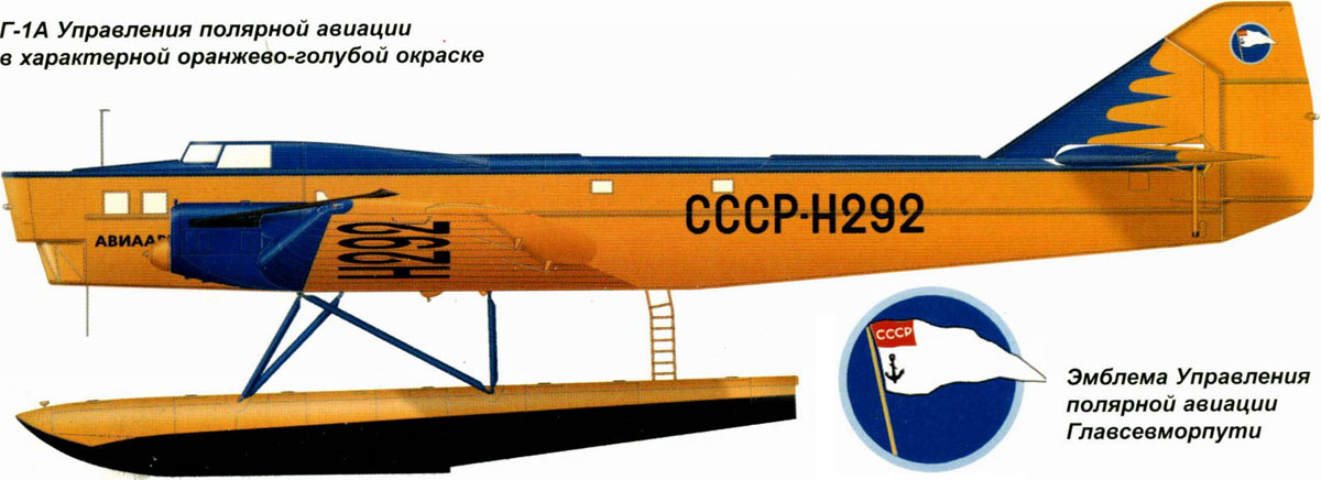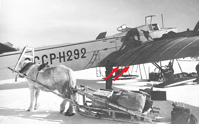 На "Полярной Почте" есть ещё такое фото, утверждается, что на заднем плане Н292. Снимок оставляет, конечно, желать лучшего... Но даже на таком фото именно поверхность перед кабиной и окантовка лобовых стекол выглядит темнее, чем остальной самолет. Т.е. всё-таки может были окрашены в синий цвет. А вот темной (синей) передней кромки крыла не заметно, значит не накрашивалась снизу (посему возможно, что передняя кромка не выделялась синим цветом и сверху, были только "перья" вокруг мотогондол). Но при этом законцовка крыла выглядит темнее. Можно предположить, что покрашена синей краской.