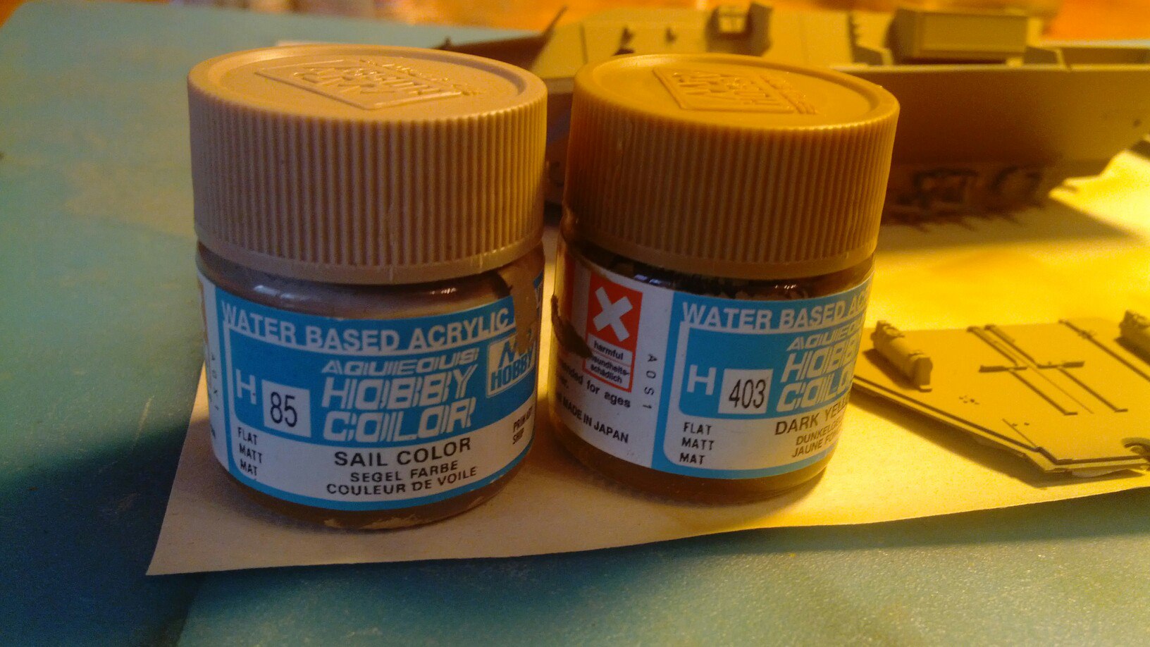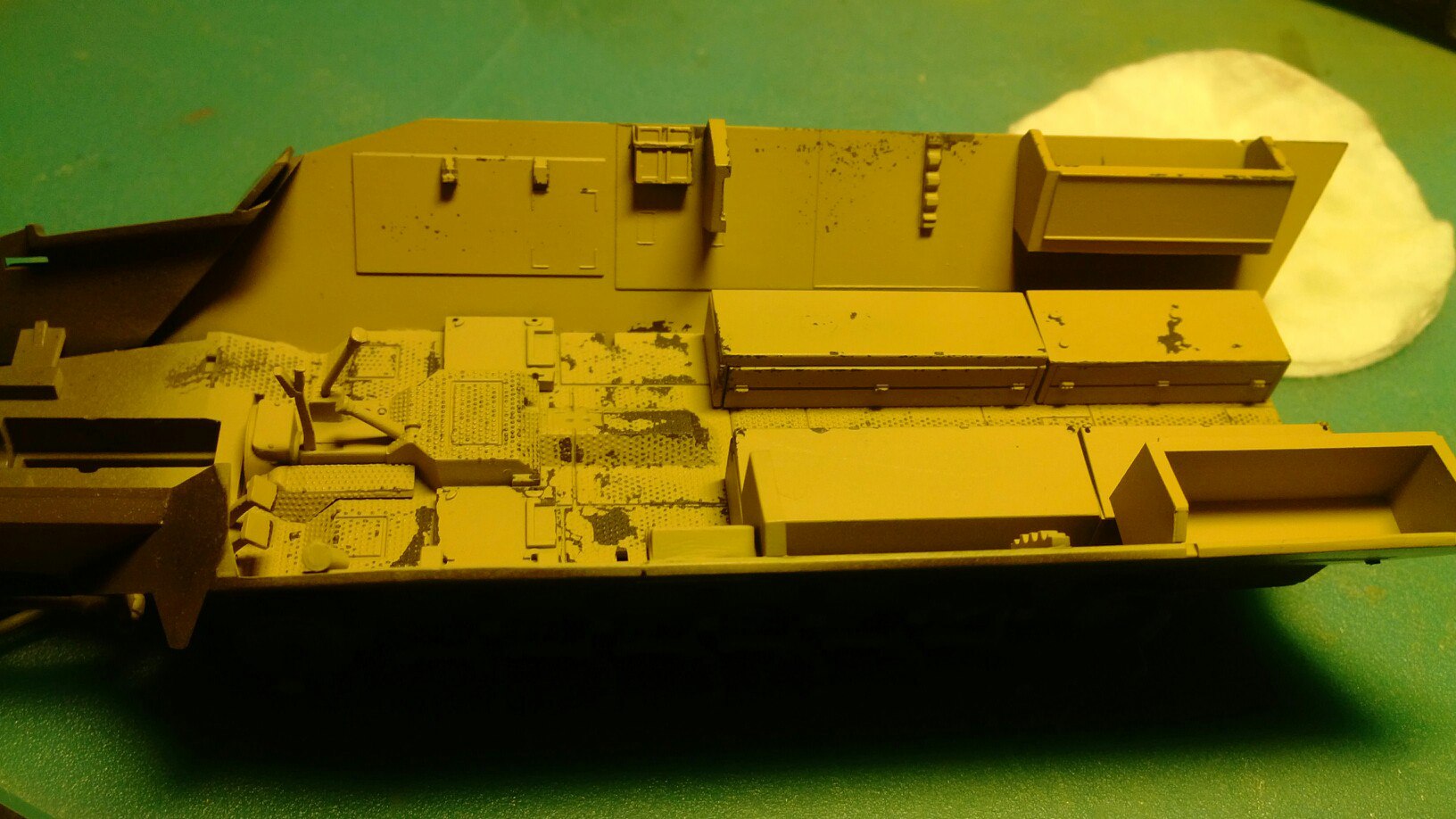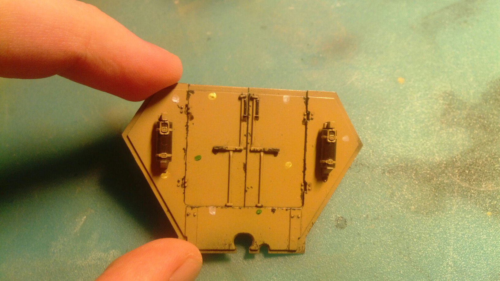 Итак, задул дункель поверх лака и сделал первые сколы. Дункель намешал из двух цветов - тот цвет, что ганза называет дункельгельбом, на мой взгляд, слишком темный и отдает в сиену - больше подходит для пустынной техники. Результат понравился, цвет получился прям такой как надо.