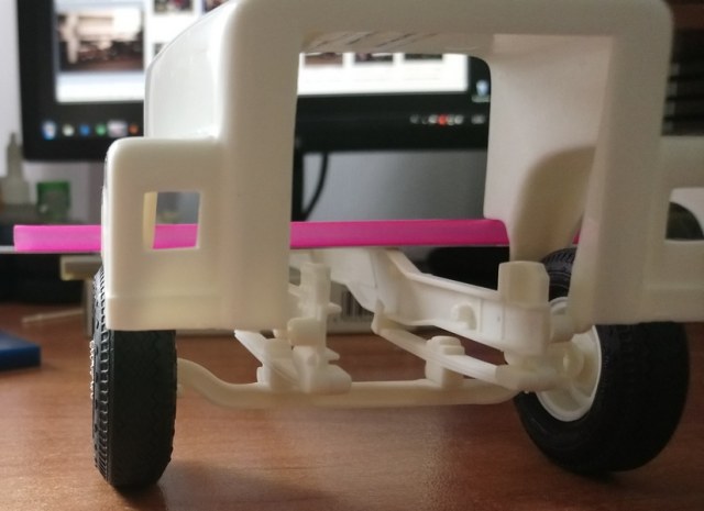 Приветствую. Как я и ожидал, колея передних колёс широковата, надо резать. Где вот только балку резать, по бокам что ли...