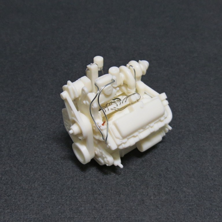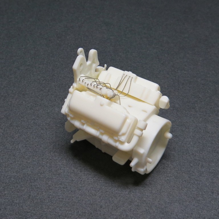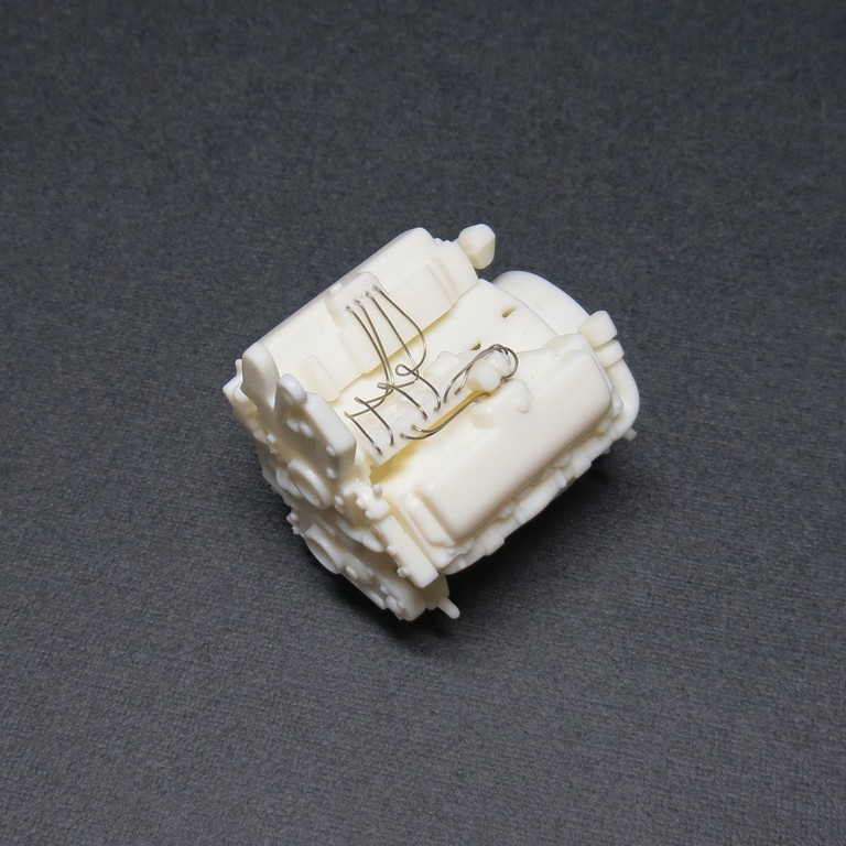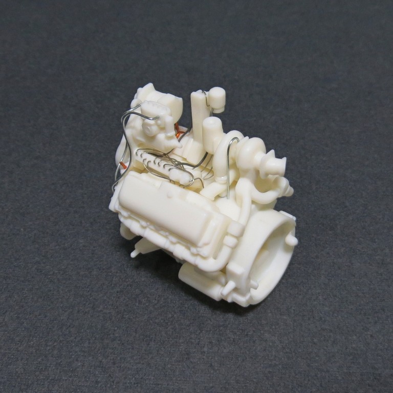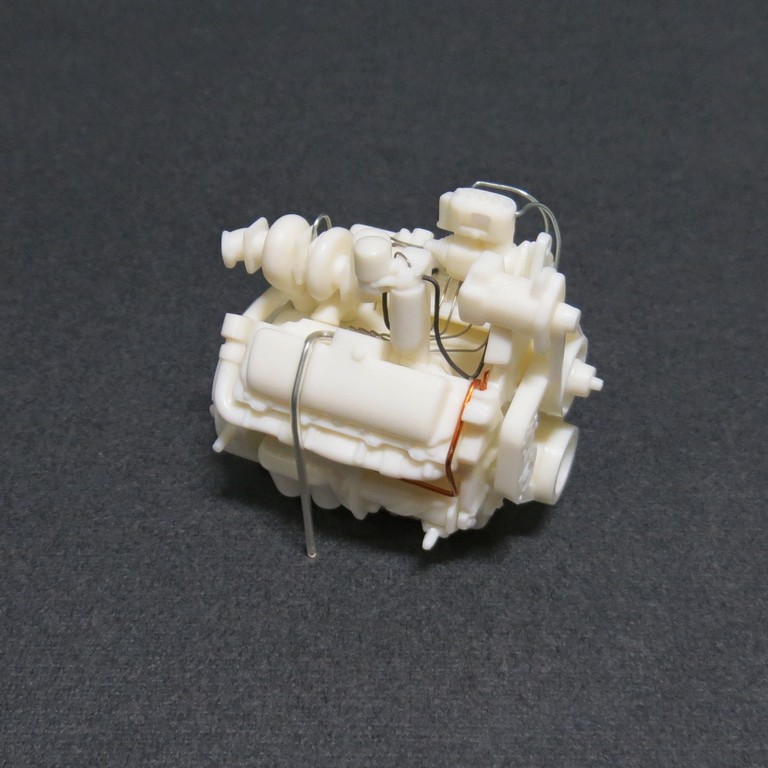 Двигатель всё равно будет краситься в один цвет, затем отдельные элементы доведу кистью. К тому же проволока крепится на супер-клей, белёсый налёт был бы неизбежен.
