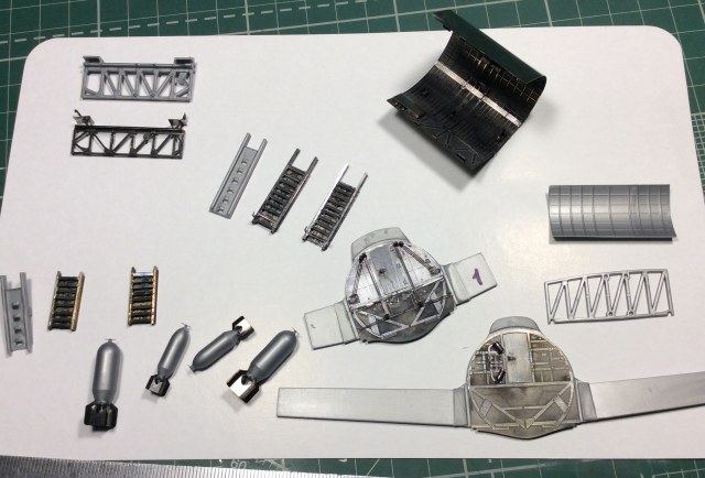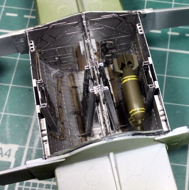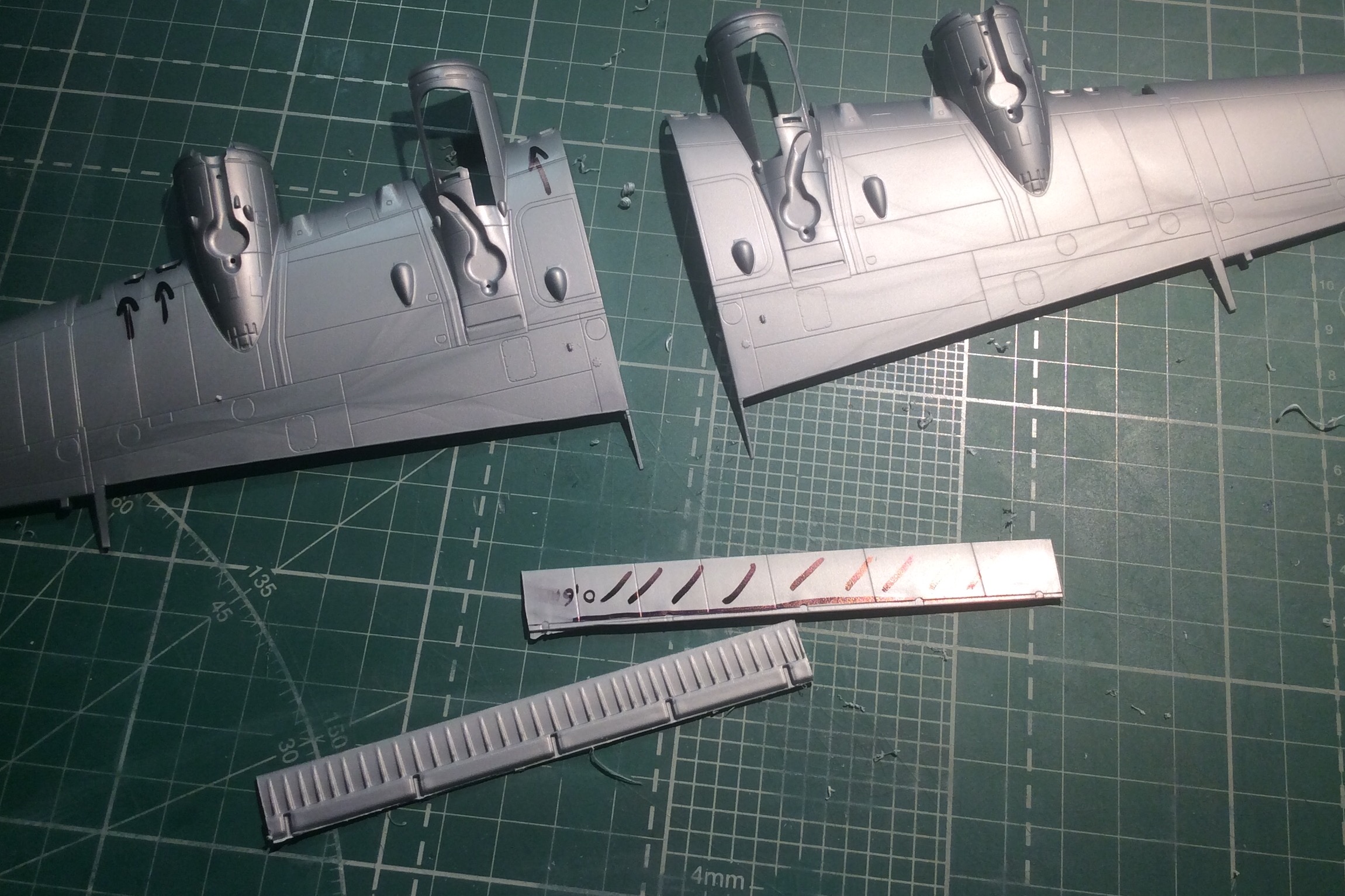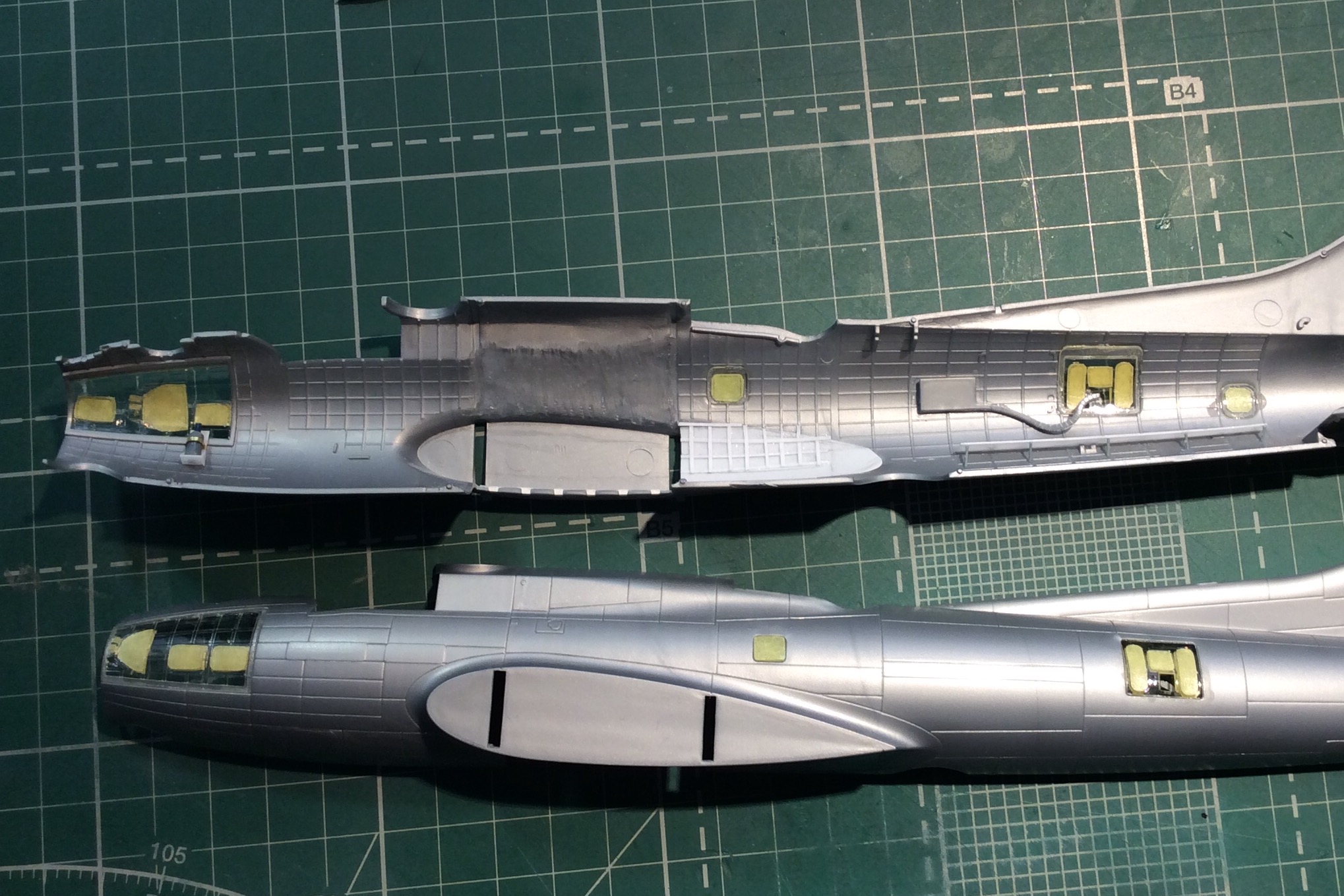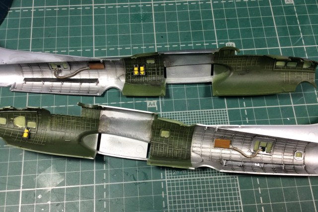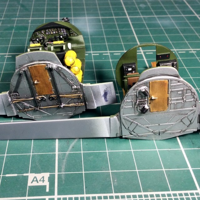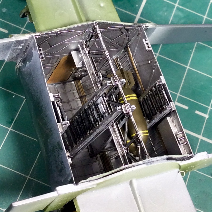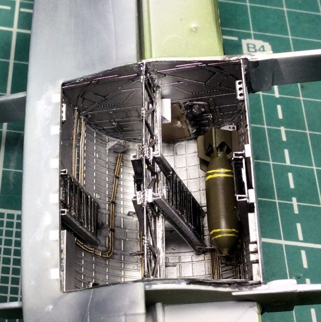 Сегодня продолжил работу . Занялся крыльями и наполнением ниш шасси . Так же оформил створки бомболюка травлением . Снял все остекление и подготовил к купанию в гаузе. Кто подскажет по остеклению : верхнее стекло над радистом и переднее -какой вариант ?