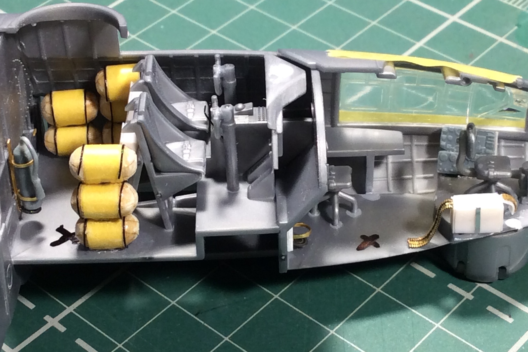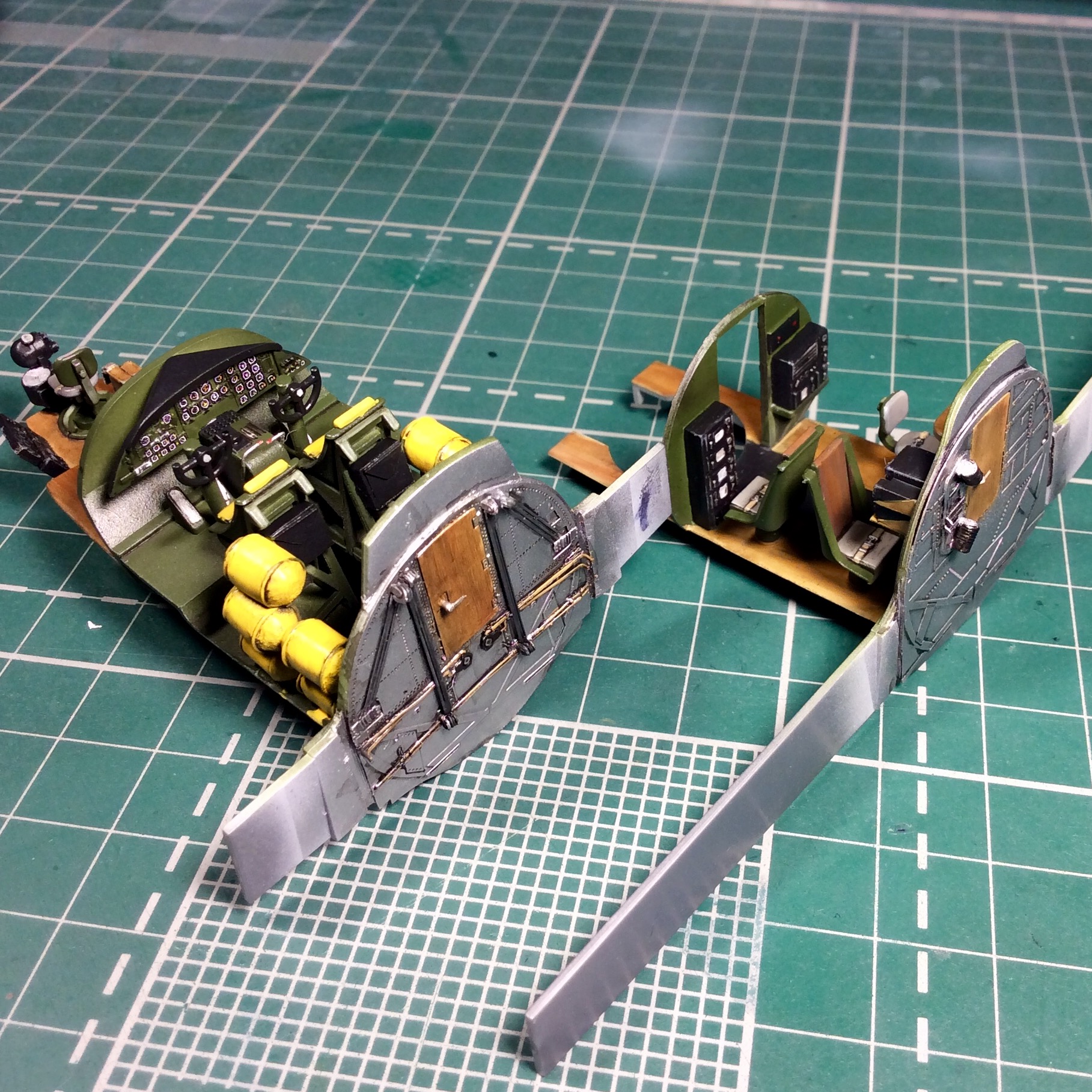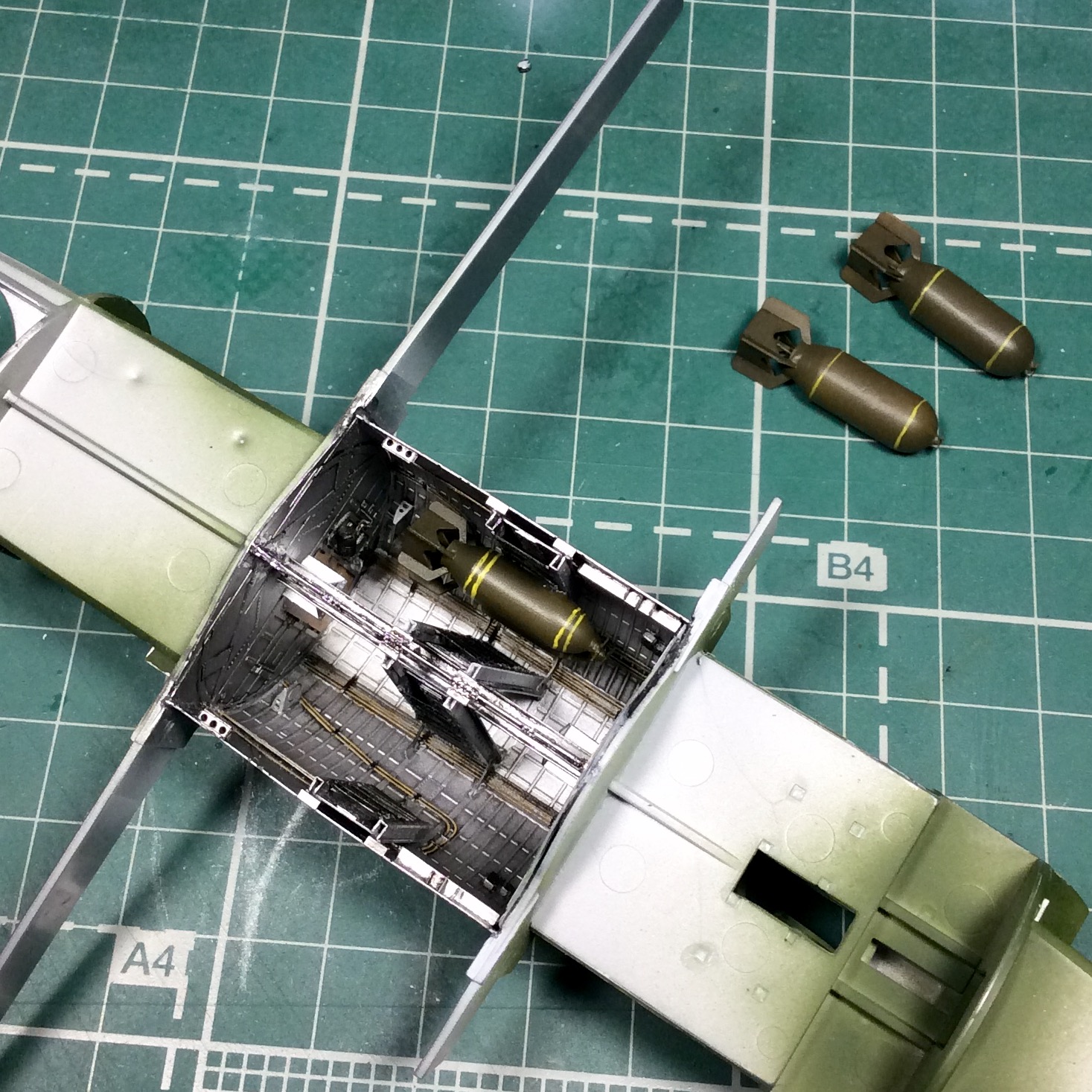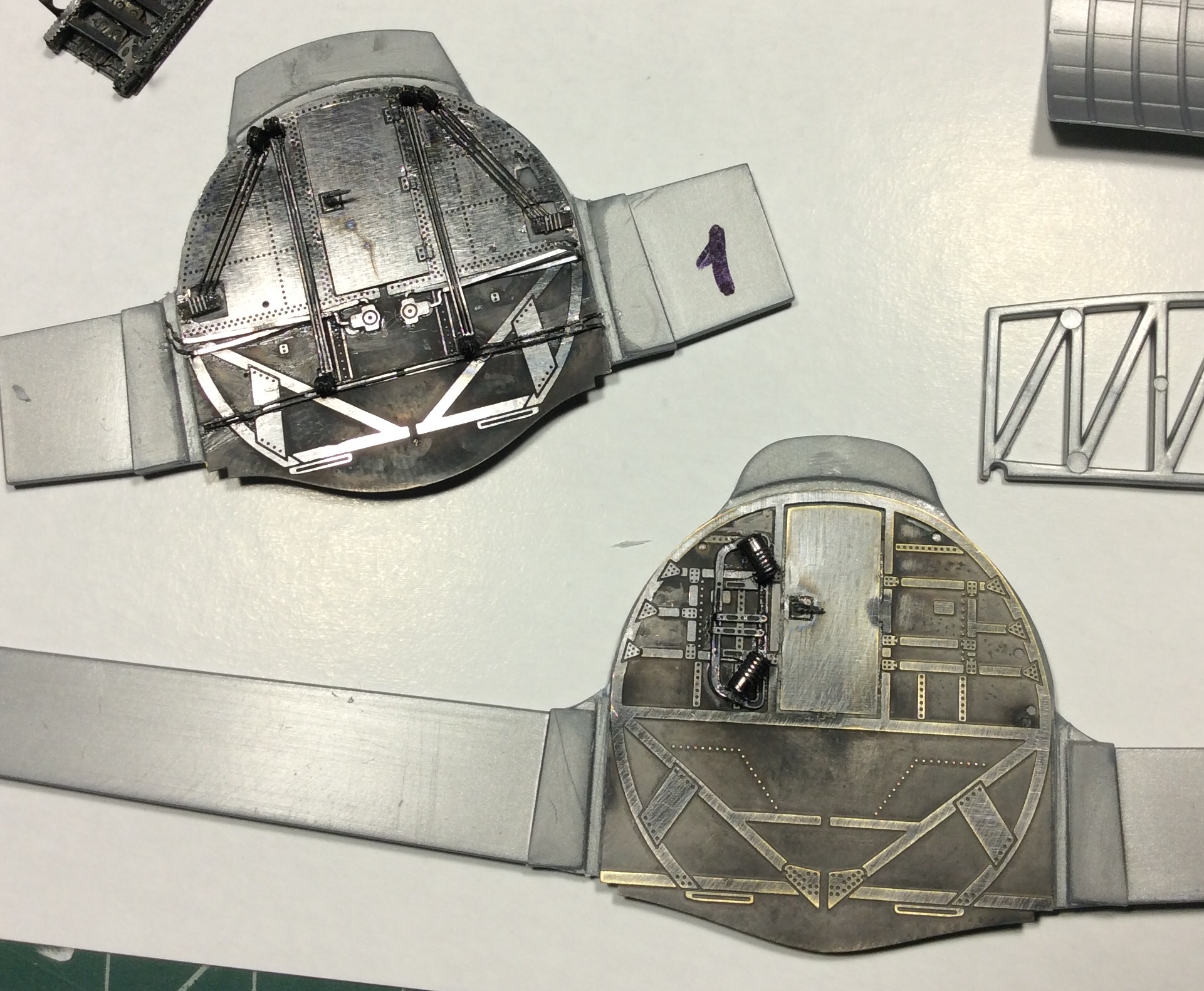 Сегодня продолжил работу . Занялся крыльями и наполнением ниш шасси . Так же оформил створки бомболюка травлением . Снял все остекление и подготовил к купанию в гаузе. Кто подскажет по остеклению : верхнее стекло над радистом и переднее -какой вариант ?