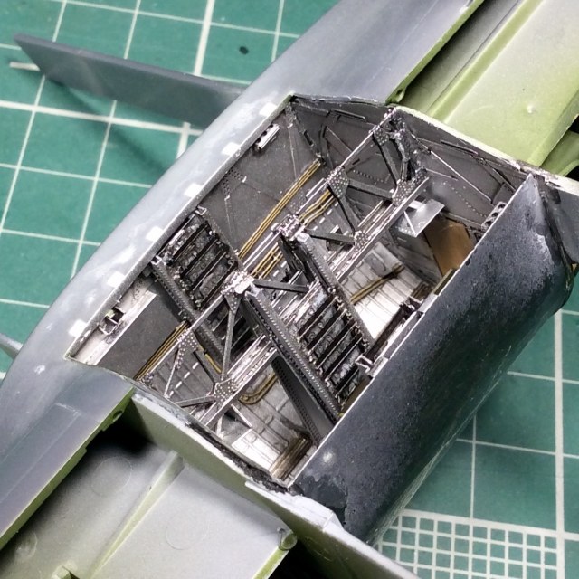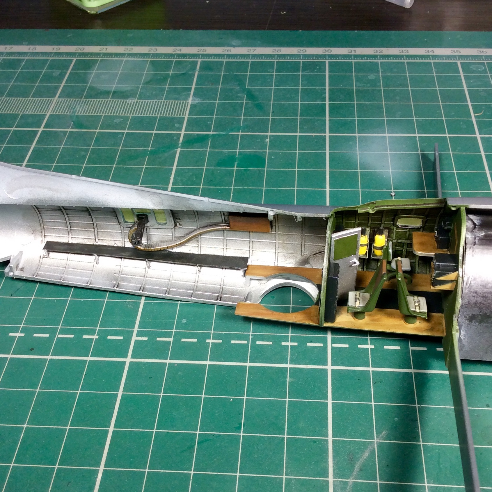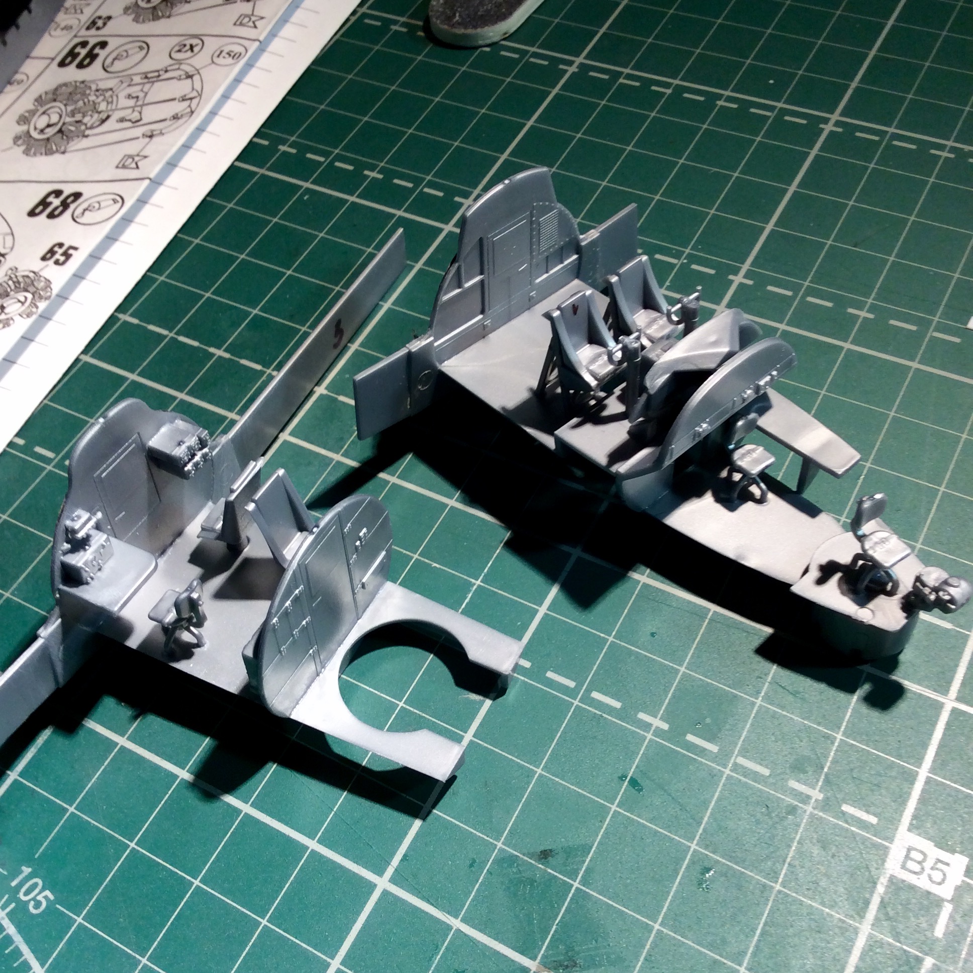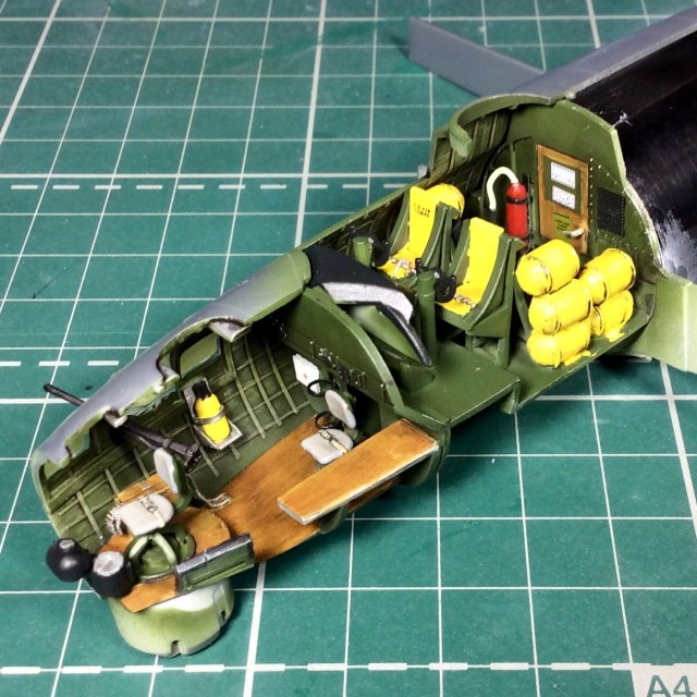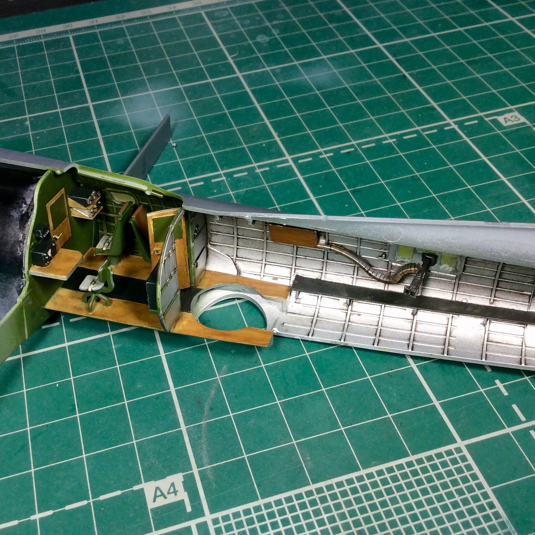 Сегодня продолжил работу . Занялся крыльями и наполнением ниш шасси . Так же оформил створки бомболюка травлением . Снял все остекление и подготовил к купанию в гаузе. Кто подскажет по остеклению : верхнее стекло над радистом и переднее -какой вариант ?