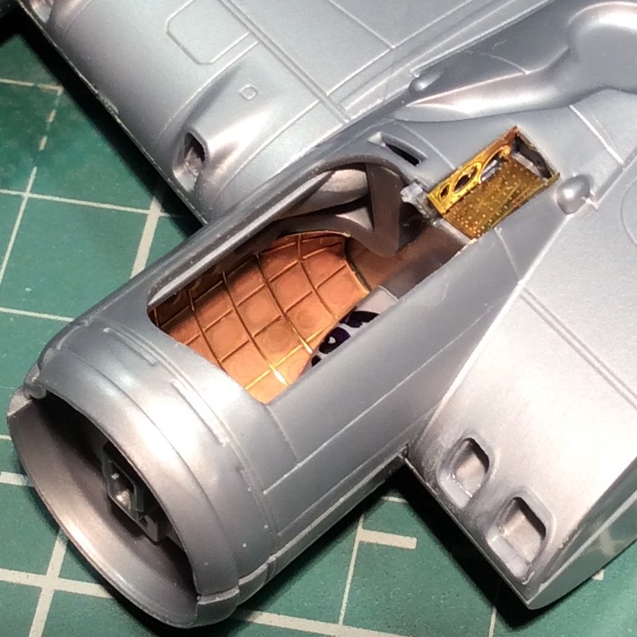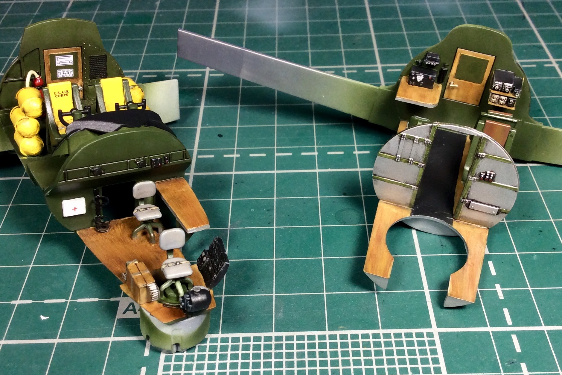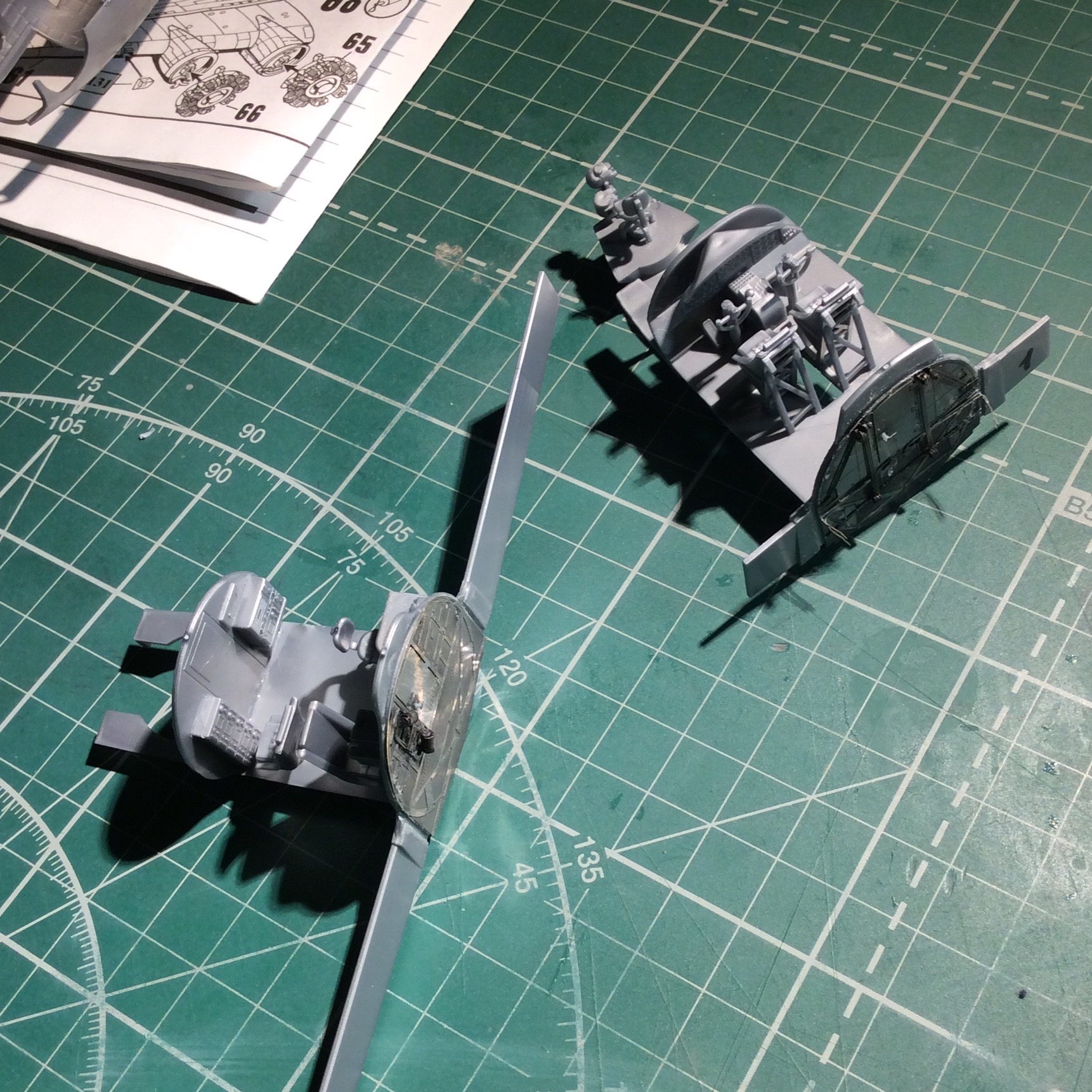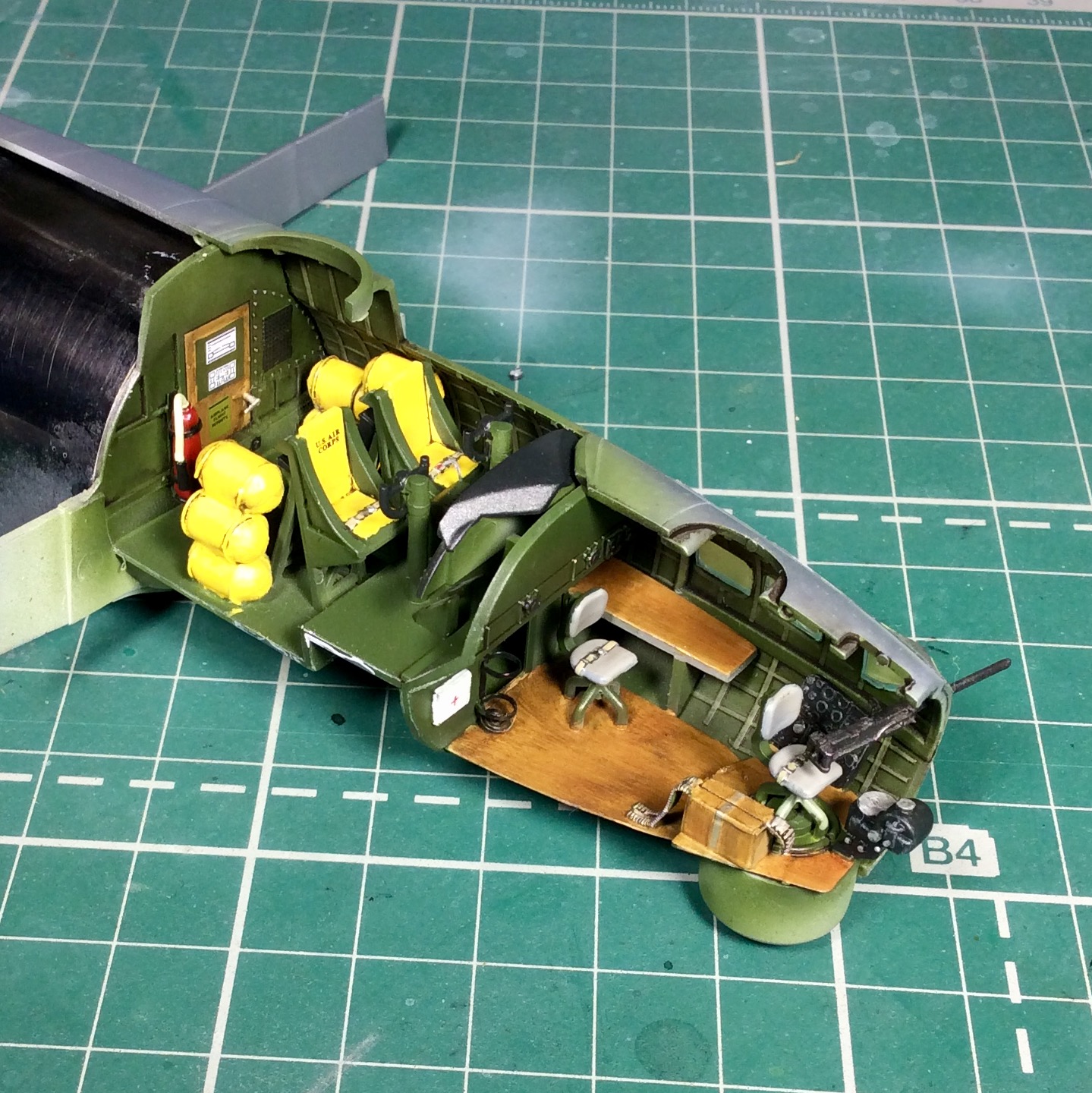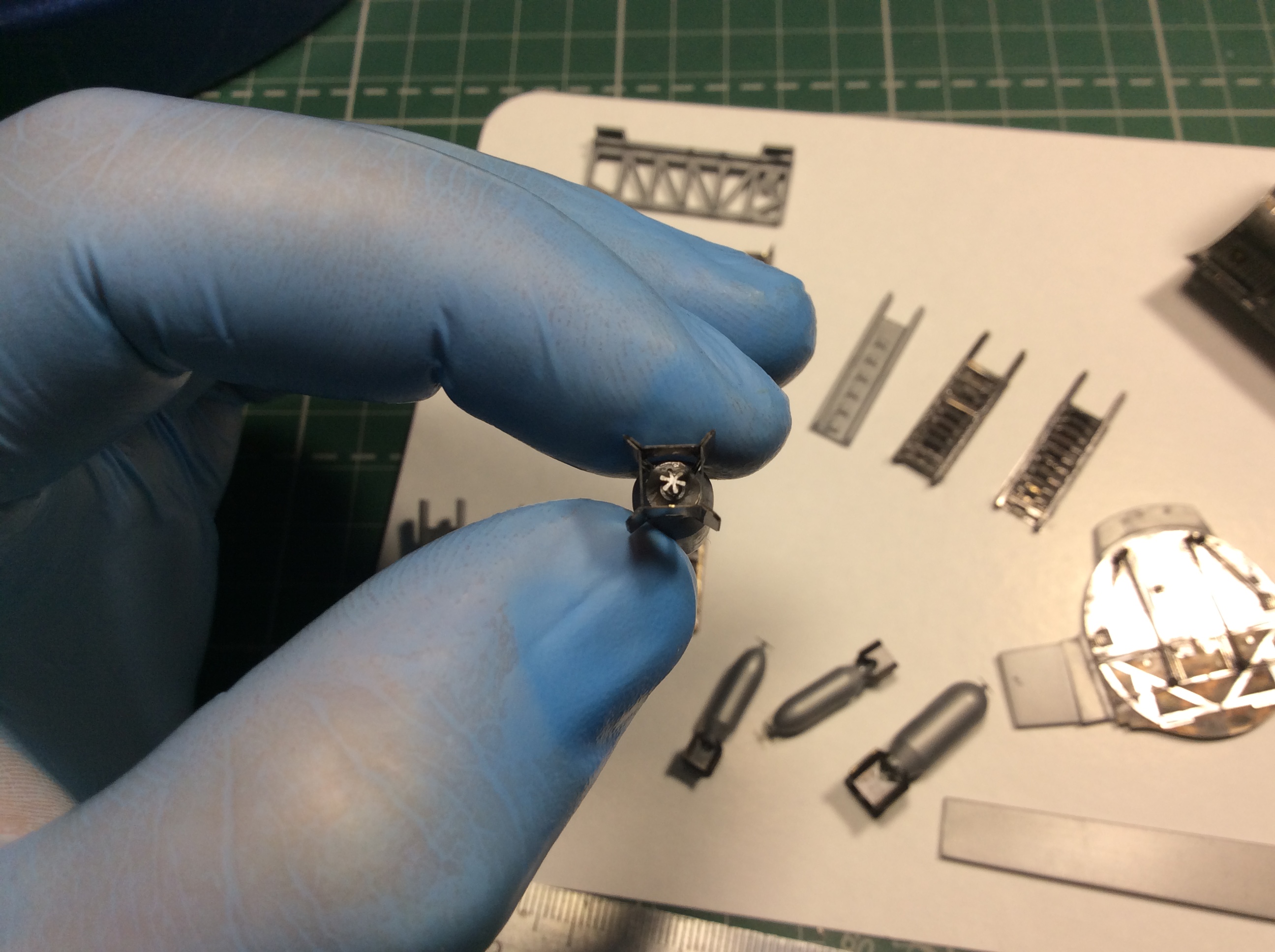 Сегодня продолжил работу . Занялся крыльями и наполнением ниш шасси . Так же оформил створки бомболюка травлением . Снял все остекление и подготовил к купанию в гаузе. Кто подскажет по остеклению : верхнее стекло над радистом и переднее -какой вариант ?