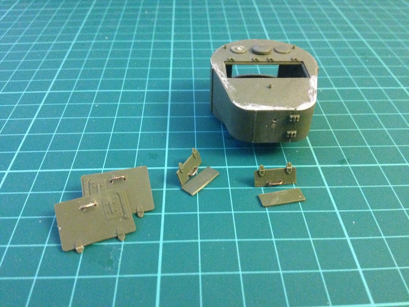 Разделил люки моторного отделения на 2 створки, сделал ручки. На башне сделал пистолетные порты по бокам и сместил задний.