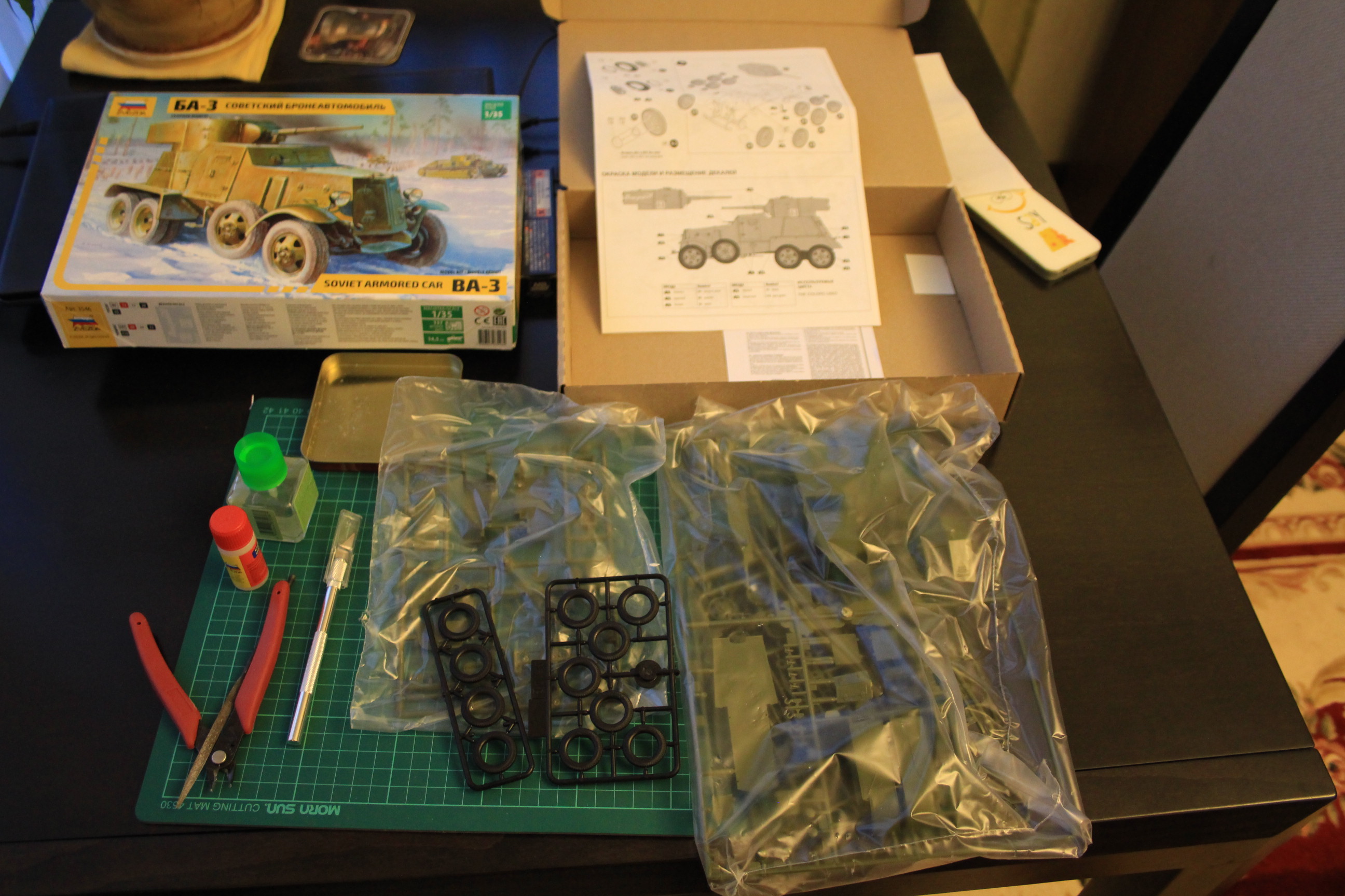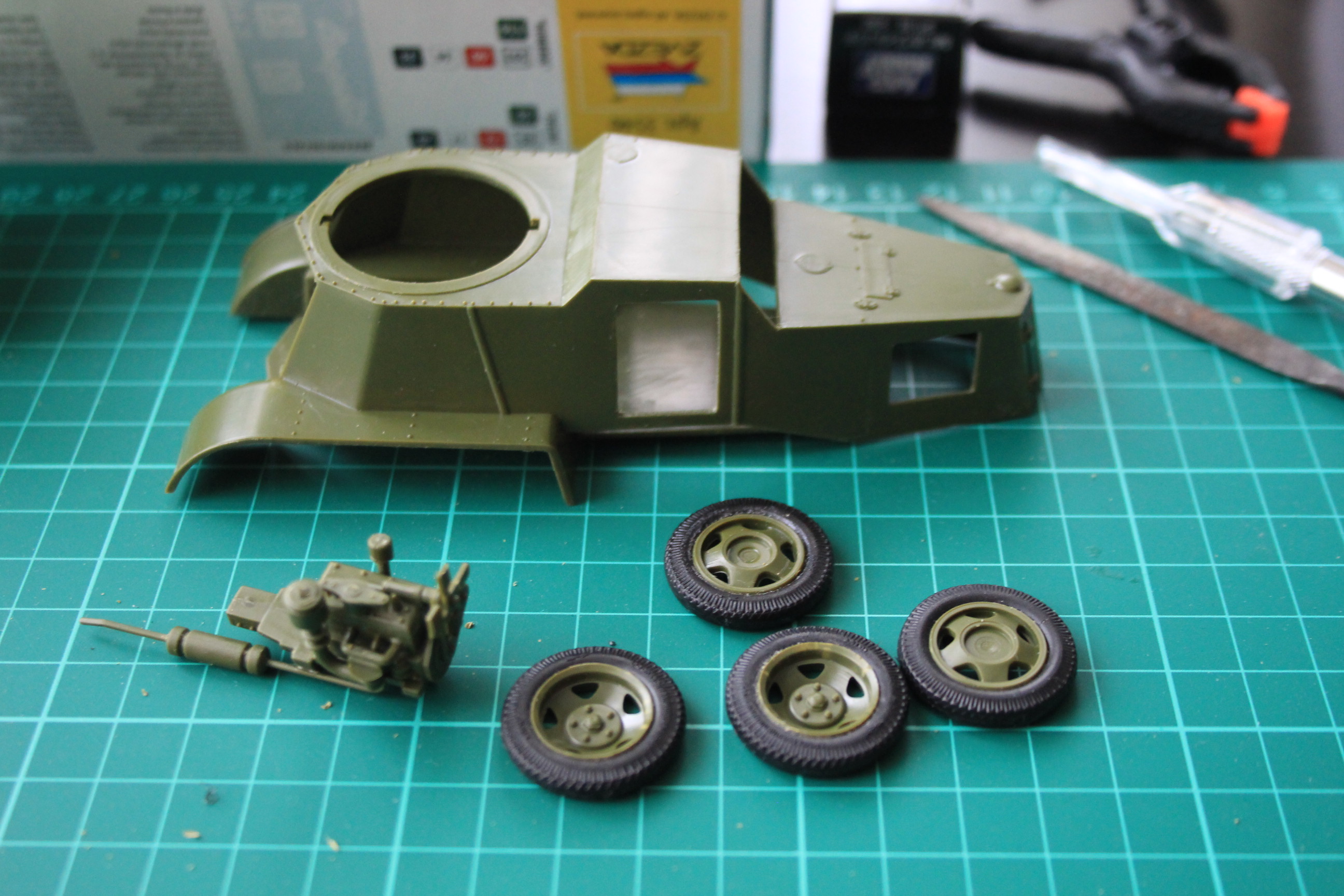 Начать решил с модельки попроще, заодно буду на ней тренироваться в покраске, работе с аэром и всяческим приемам - БА-3 от звезды. Очень хочется делать модели полностью историчными, в память о наших дедах и прадедах.
