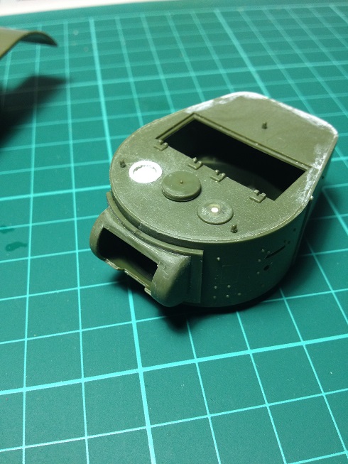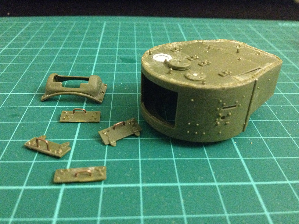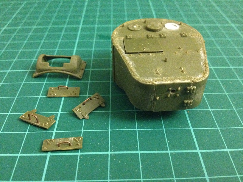 Почти доделал башню, сделал швы и тянутого литника (в основном те, что сверху, боковые я так понял были аля планки приваренные, особо швов не видно), клёпок налепил, кольца сделаны из проволоки но не приклеивал пока (поэтому их на фото нет). Сделал один люк (командирский) с небольшой щелью (зазор, закрыт типа не плотно) , маску орудия получше подточил под штампованную.