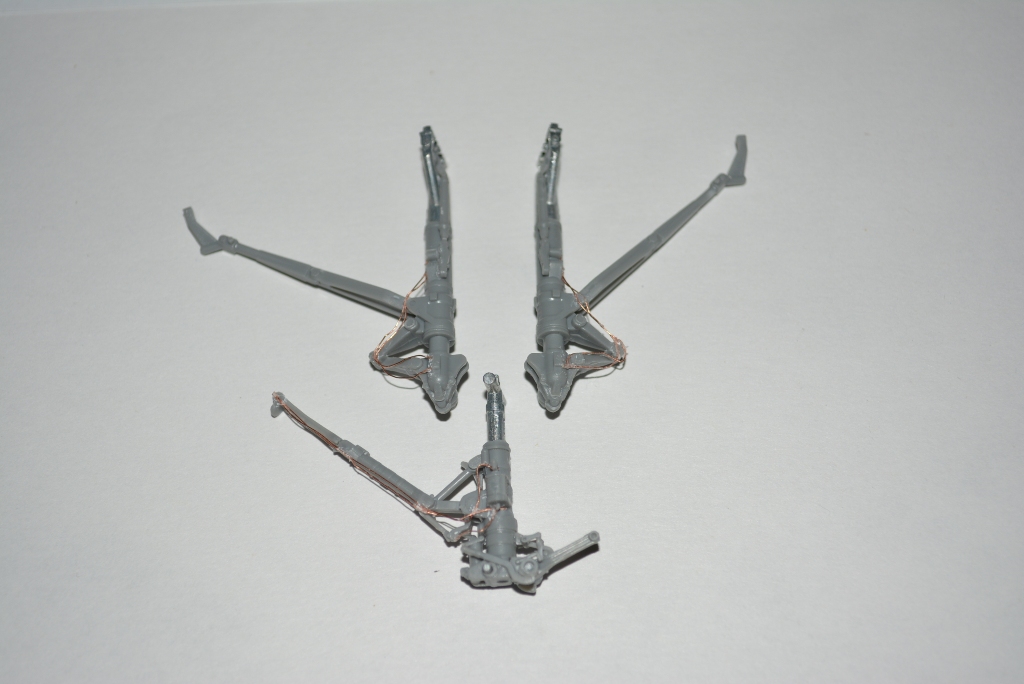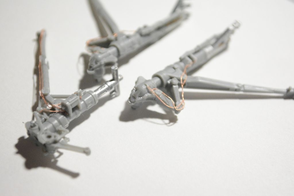 От кокпита пока решил отдохнуть, чтоб глаз не замыливался и вернуться к доработкам позже. Пока собрал шасси и совсем чуть-чуть добавил проводки, хотя то что из коробки идет итак давольно-таки самодостаточный пластик и имеет сложную форму, рельеф и детализацию.