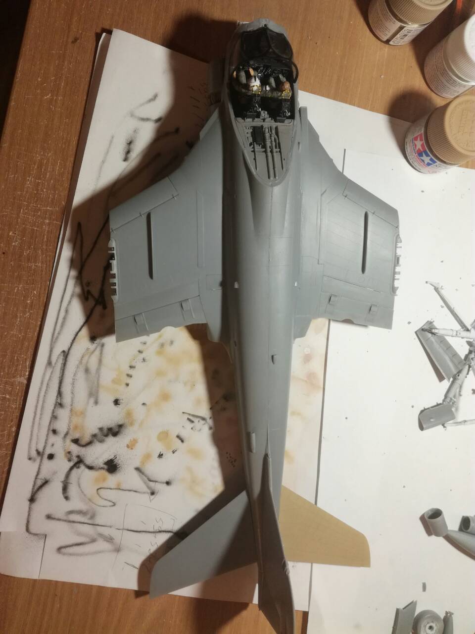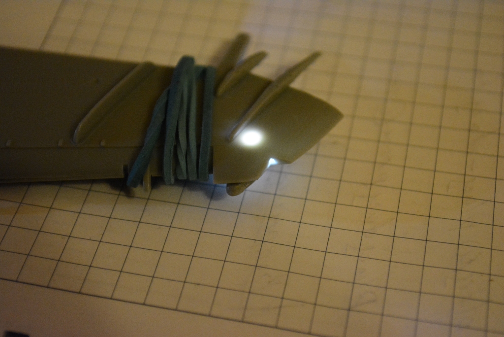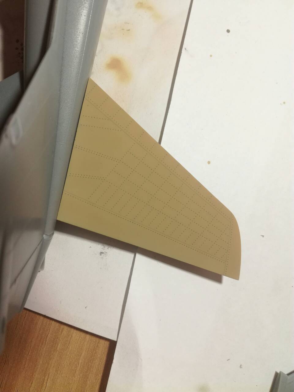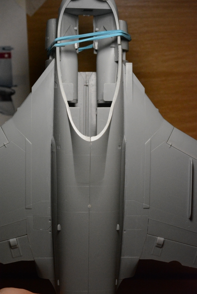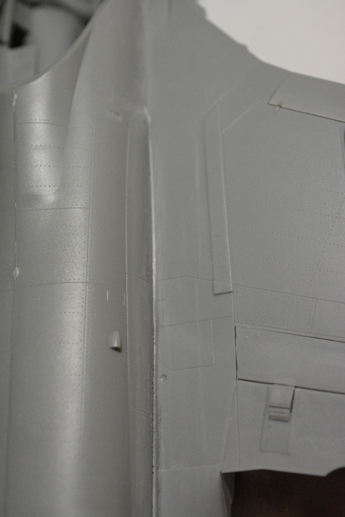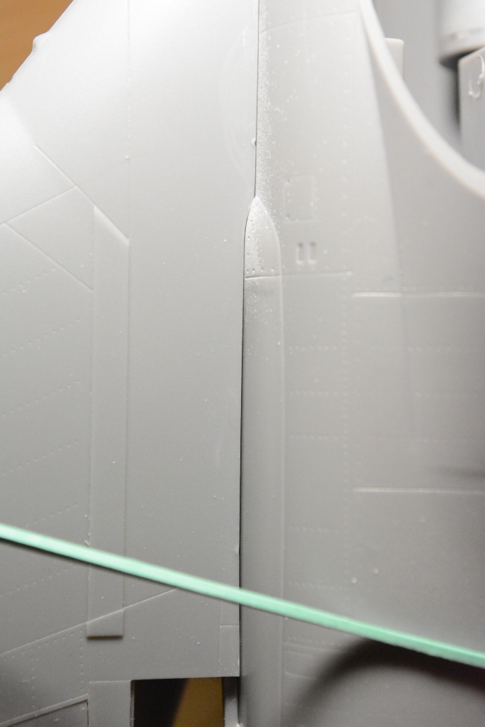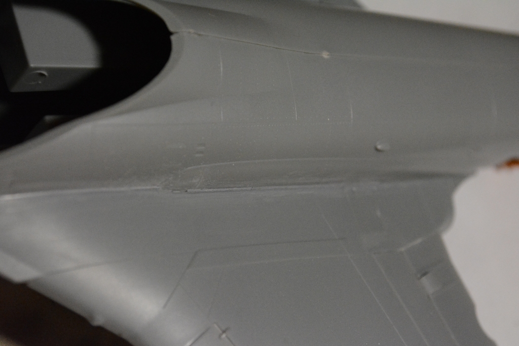 более мене зашпаклевал все щели, можно дальше работать с фюзеляжем. Пробно сделал прешейдинг на заднее крыло и задул в базу.