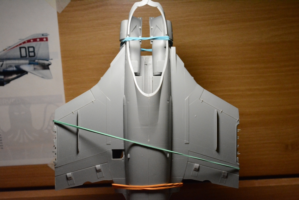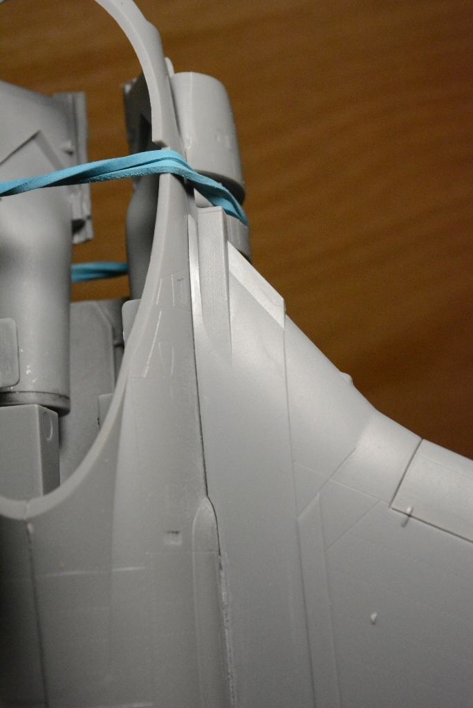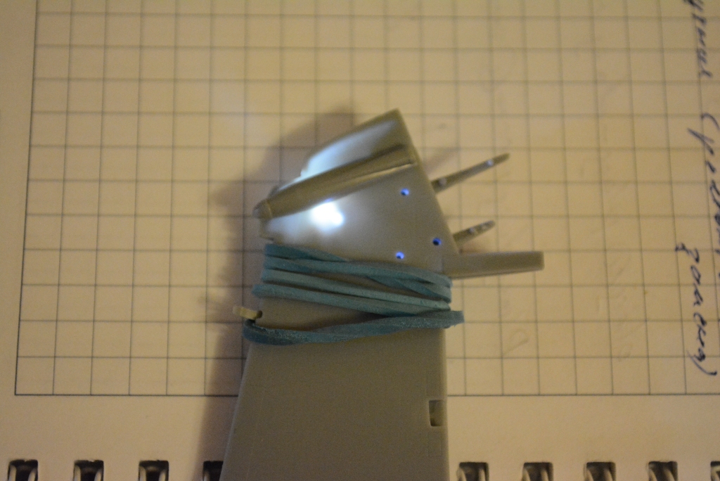 Мне кажется я давно так не залипал на стадии сборки, но что есть то есть... Сначала была неудача попытка приклеить левое крыло. В процессе работы намазал все клеем, а крыло встать как надо отказалось и клеи как назло схватился почти сразу же, в один момент я даже стал бояться что сломаю фюзеляж к чертям пока пытался вытащить крыло обратно. Вообщем с грехом пополам крылья воткнул, но щели оказались адовые!!! Дальше больше - чтоб хоть как-то минимизировать щели я промазывал их клеем и держал минут по 15-20 в стянутом положении. Все вроде бы ничего в каких т оместах щели пропадали, но спустя 1-2ч (мб и больше) все мои стяжки под упругостью жесткого пластика расходились обратно. Итак с клеем пока отложил попытки и начинаю заделывать щели шпаклевкой. Промазываем, ждем когда подсохнет, убираем лишнее и шлифуем... процесс видимо немного затянется, пока не удастся свести щели к нулю!