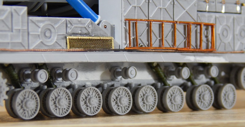 Из литературы: Гусеничная ходовая часть имеет по 8 опорных катков с торсионной подвеской с каждого борта¸ взятых от тяжелого танка Т-10М. Для плавности хода передние три и задние два катка имеют гидроамортизаторы.