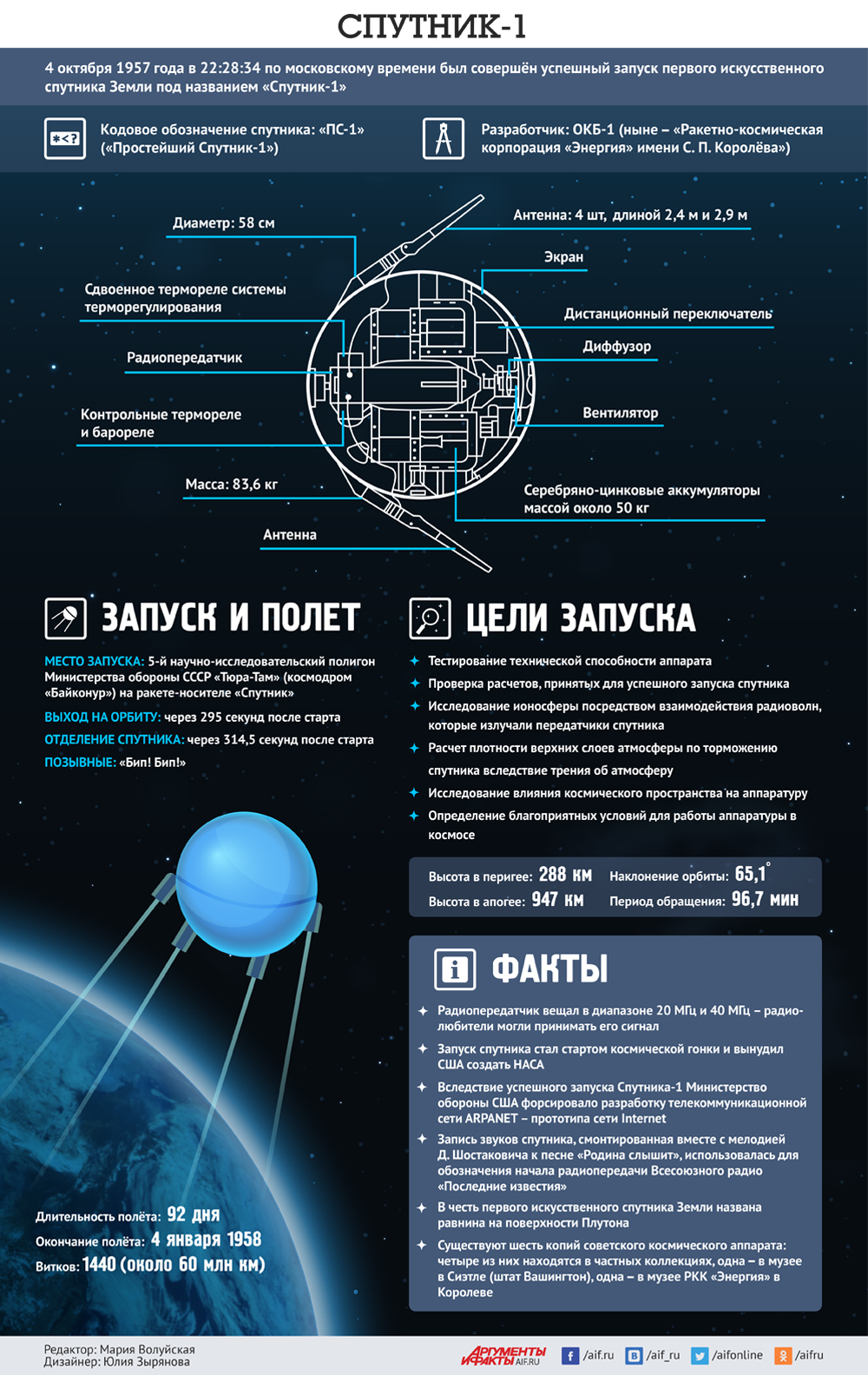 Спутник под кодовым названием «ПС-1» («Простейший Спутник-1») создавался группой советских ученых во главе с основоположником практической космонавтики Сергеем Павловичем Королевым. Аппарат, получивший название «Спутник-1», был запущен 4 октября 1957 в 22:28:34 по московскому времени года с 5-го Научно-исследовательского испытательного полигона Минобороны СССР «Тюра-Там» (впоследствии — космодром «Байконур») с помощью переоборудованной ракеты Р-7. Уже на первом витке полета «Спутника-1» информагентство ТАСС сообщило об успешном запуске первого в мире искусственного спутника Земли.