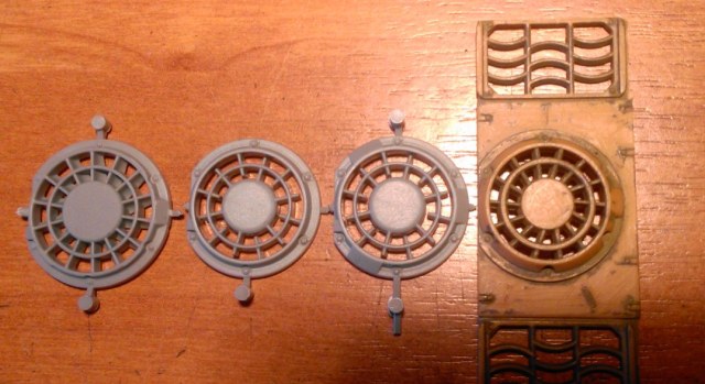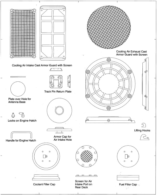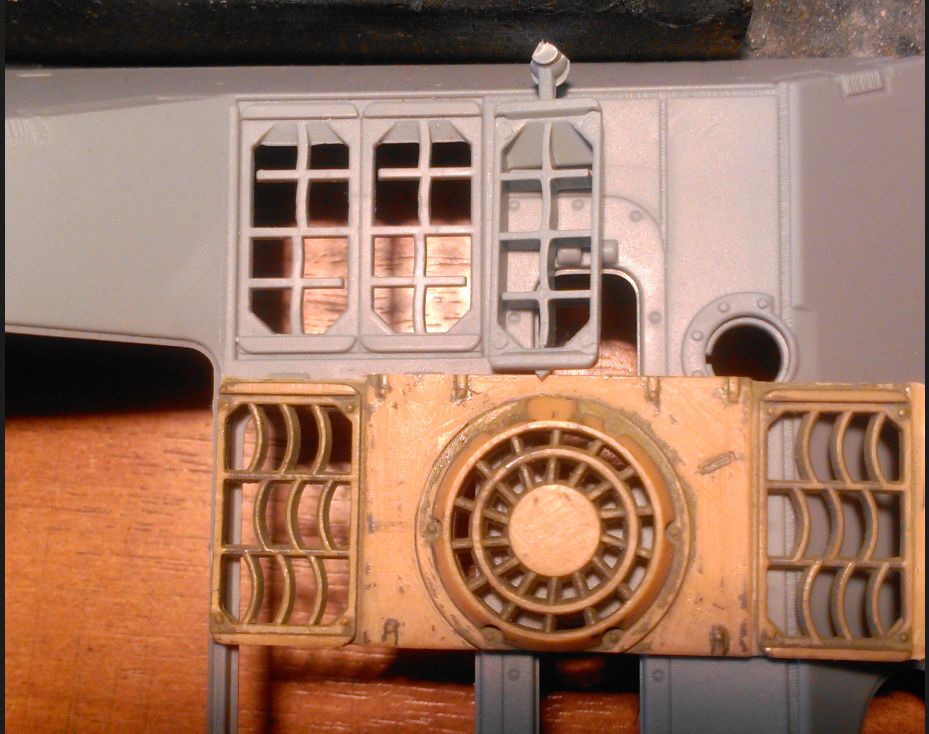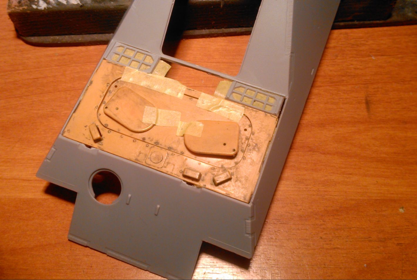 Правда, в таком случае я бы уже однозначно отказался от этих решёток, не целесообразно вообще ставить их две сразу в центре (тем более они ещё и литые...) проще прикрыть это место обычной металлической решёткой, навроде тех, что были на "Элефантах/Фердинандах" над двигателем.