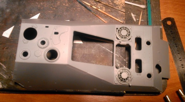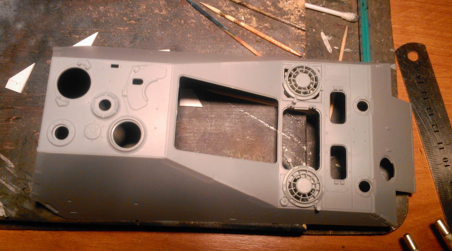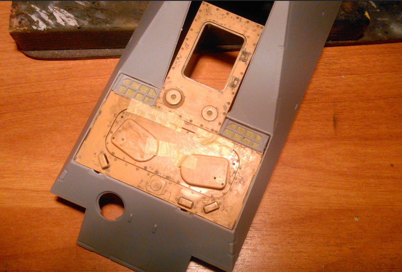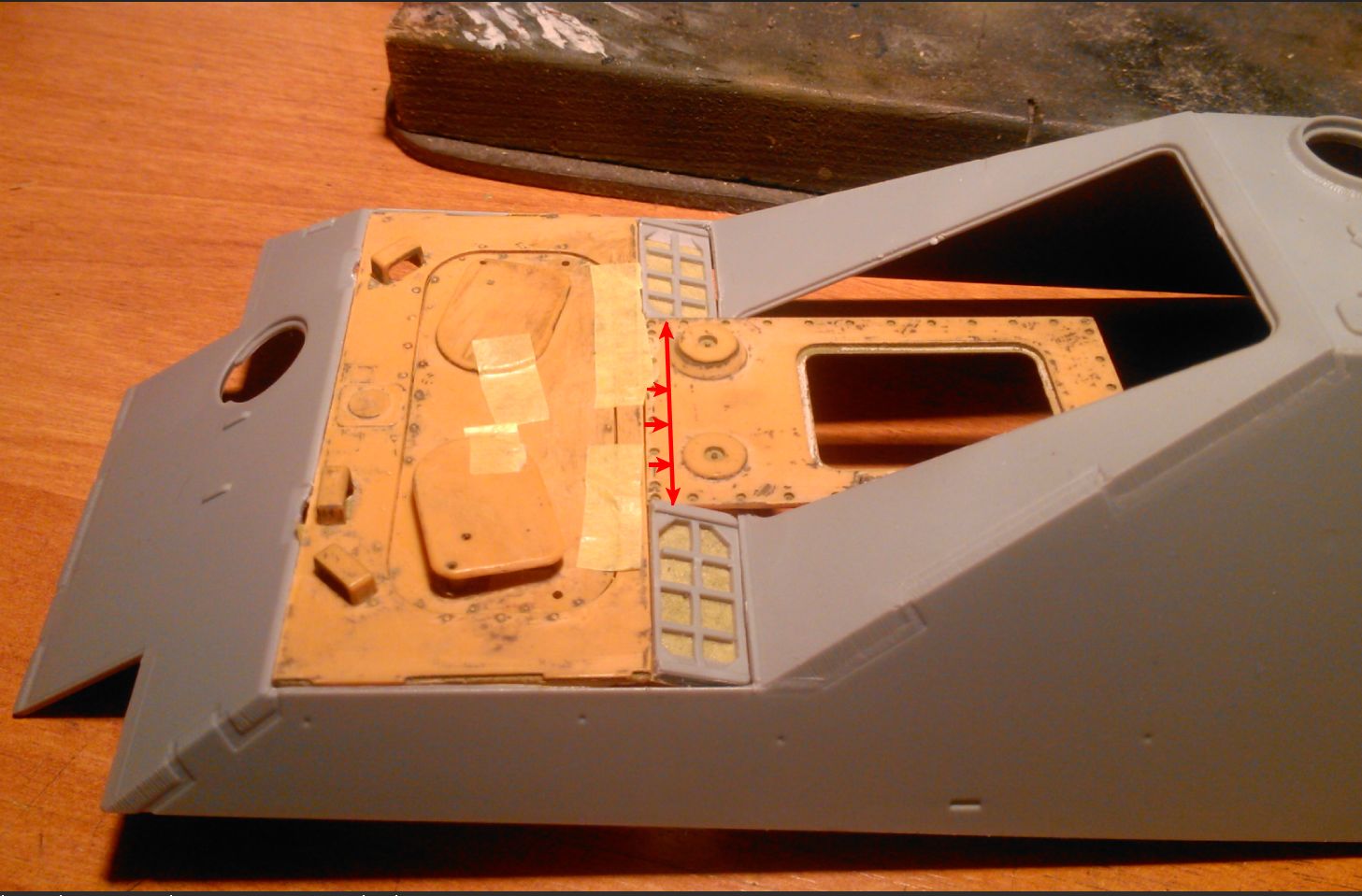 Очевидные пункты перепила - пулеметное гнездо и оптику мы пересаживаем на рубку. Вырезаем неправильную плиту МТО, заимствуем ее у донора и ставим на место.