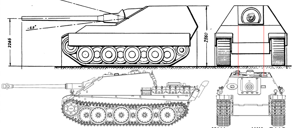 Но затем Пошалок опубликовал фрагмент реального чертежа из которого стало ясно что двигатель, в данных проектах, располагался ровно под орудием а трансмиссия использовалась серийная. Соответственно, отделение управление оставалось там же где и у оригинальной Пантеры и сохранялась оригинальная-пантеровская плита для ее демонтажа с люками мехвода и радиста.