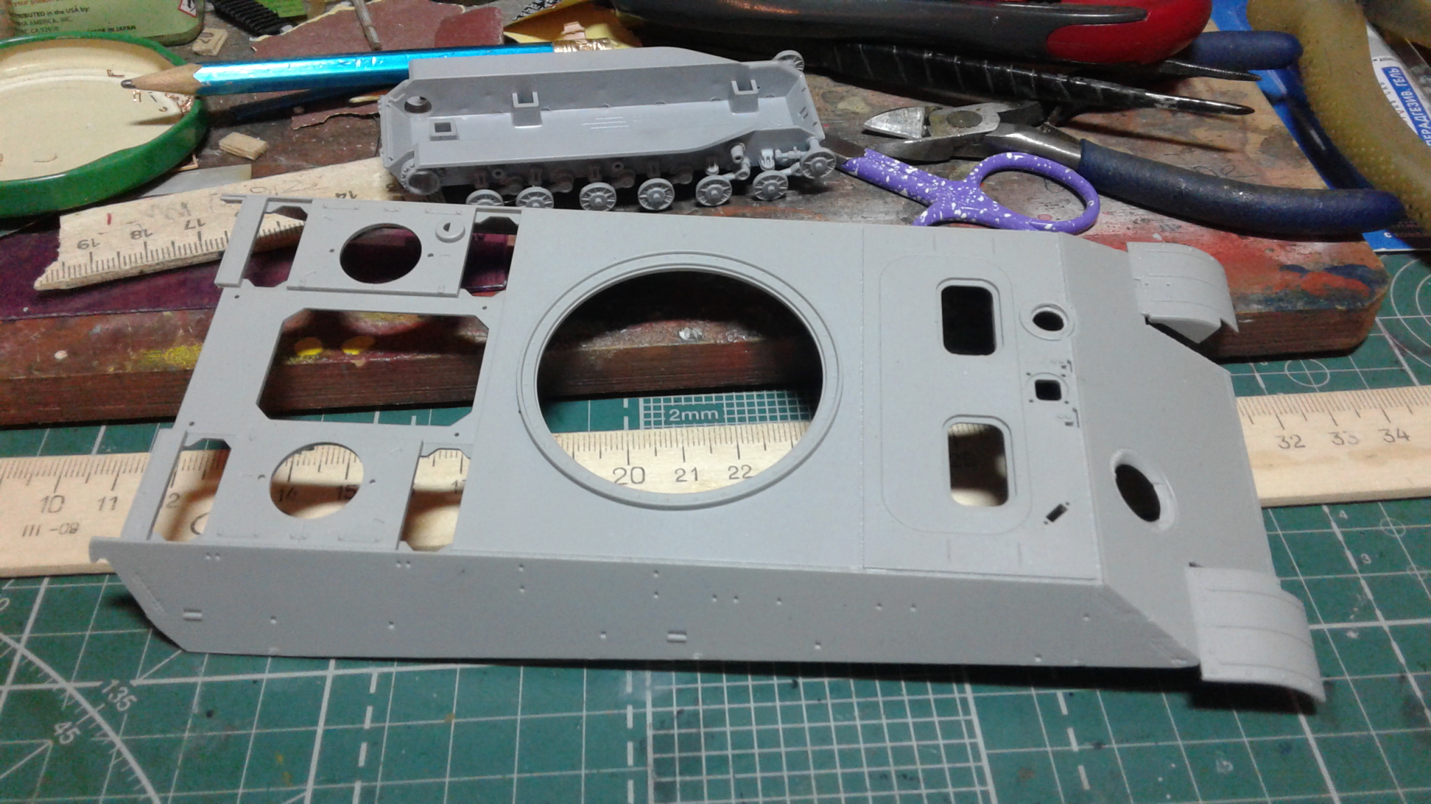 Далее, выяснил, что у китайцев и у не-китайцев(не уверен, чья именно у меня пантера - Звезда или ICM) - разные линейки. Отличается ширина корпусов у донора и у модели Амьюзингов, в сумме примерно на 0,5мм. Короче, на ширину сварных швов по бокам плиты. Придется зауживать плиту, чтобы потом поместились сварные швы по бокам.