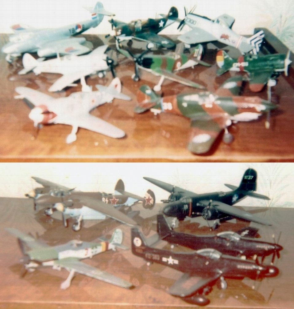 немного ностальжи не помешает надеюсь?) фото к сожалению мыльницей тогдашней( все что осталось в память о детской коллекции начала девяностых - фото: сверху Ла-7 Кожедуба в своей роли и за ним конверсированный в Ла-11 по журналу М-К, Метеор изкаробочный, Аэрокобра с самодельными ОЗ, Девуатин 520 раскрашенный по мотивам чехословацкой книжки "Боевые летадла", Р-40 кишинёвского разлива (или новороссийского "Абрау-Дюрсо" - уже не помню) с накрашенными ОЗ, Биркет с декой Эконики, Ишак конечно киевский, ниже еще две модели экс-Фрог: Твин Мустанг - самопальные деки/раскраска, и ночной перехватчик Р-70 из Бостона после статьи в Крыльях Родины (тогда это было практически наше ВСЁ!) ГДРовский Ту-2 (окрашен опять - по немецкой же книге) и Ревелл Та-152 (как оказалось тоже ФРОГ!) крайняя на тогда новейшая модель (зарубежные фирмы только появляться начали)... крашены кисточками, зубограф только освоил тогда - на минском Хеллкете, вместе с расшивкой... к сожалению закончить не успел - армия, переезды и т.д.