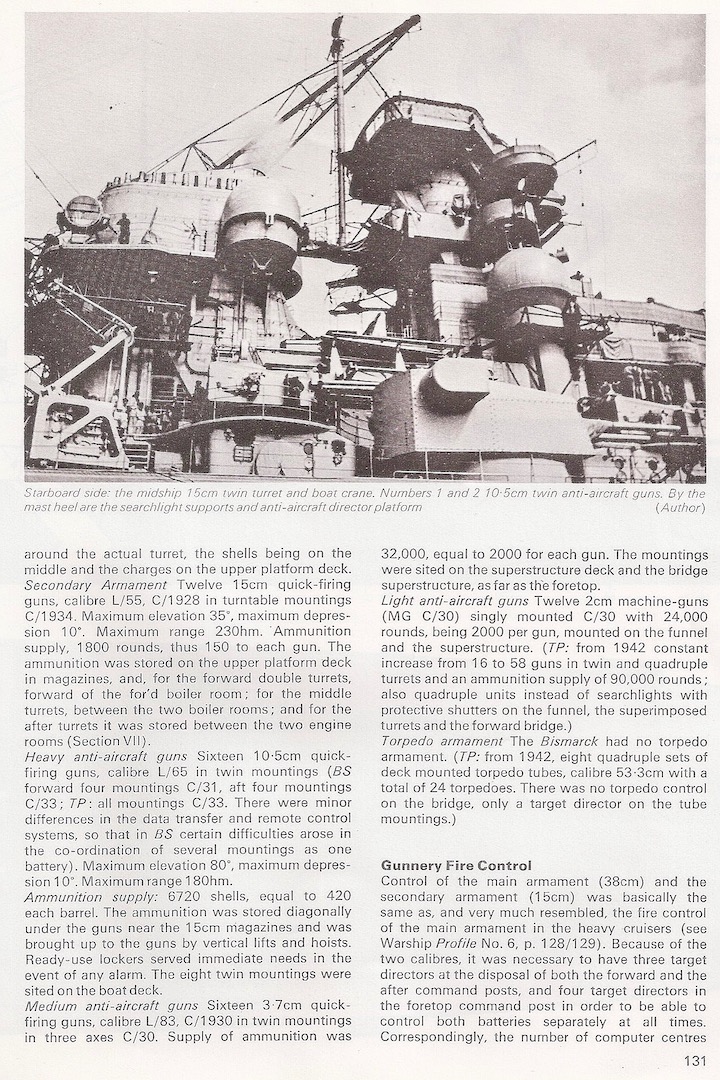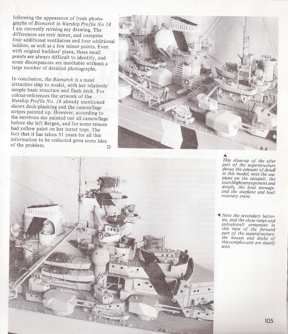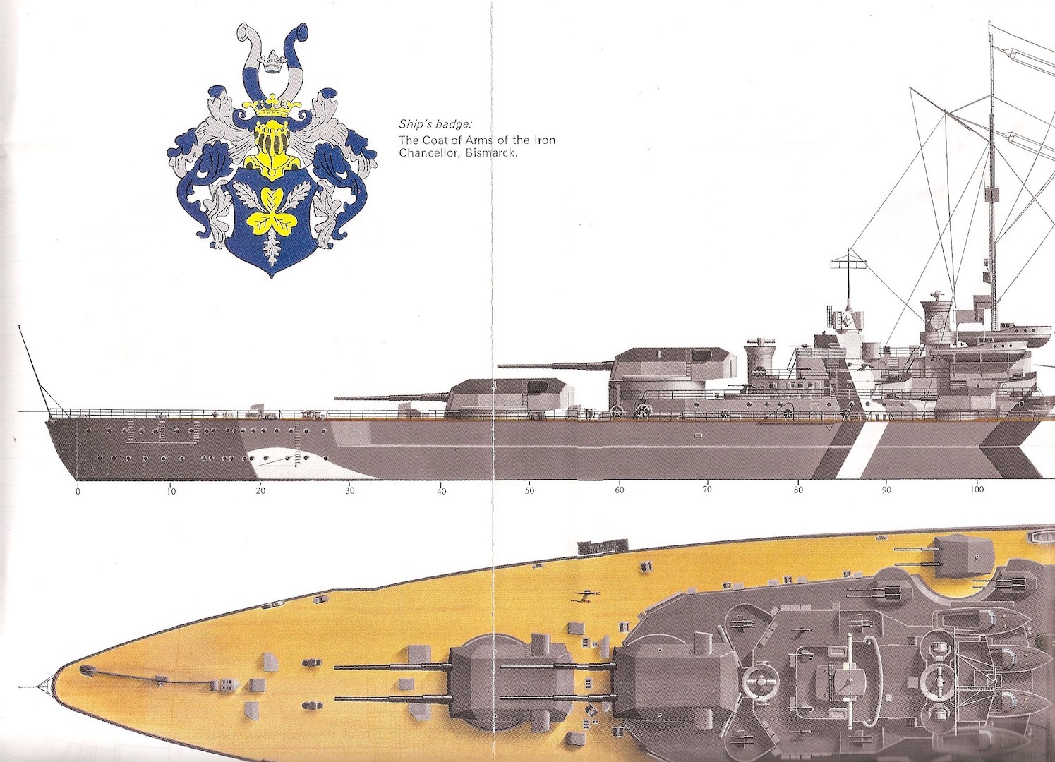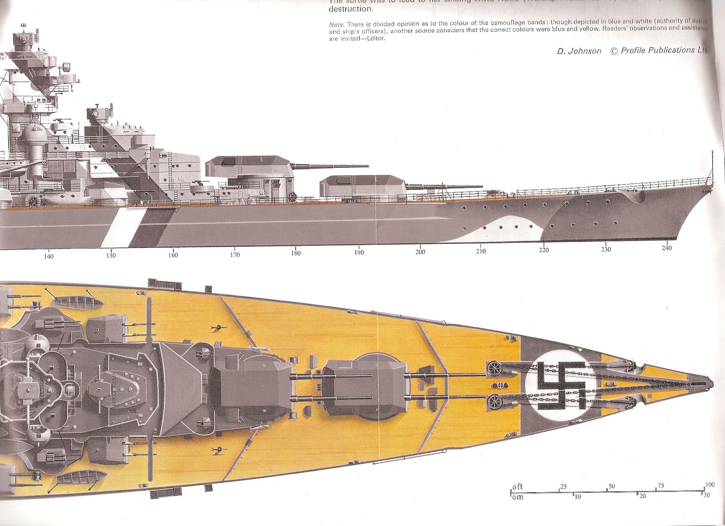 Что же касается камуфляжа линкора Бисмарк… “В упомянутом 18-м номере журнала Warship Profile затрагивается вопрос камуфляжа линкора, упомянут “настил палубы” и “камуфляжные полосы”. Однако, по свидетельствам очевидцев - выживших членов экипажа линкора - весь камуфляж был закрашен, и, по каким-то причинам, верх орудийных башен был желтого (!) цвета. Восприятие данного факта, на установление которого потребовался 31 год, выглядит несколько проблематичным,” - пишет Ситфорд в 1972-м году.