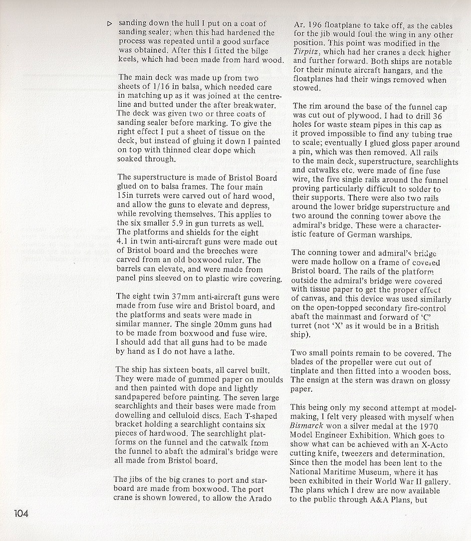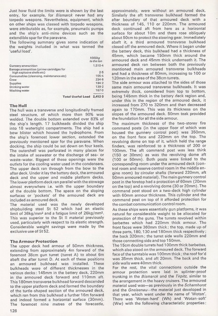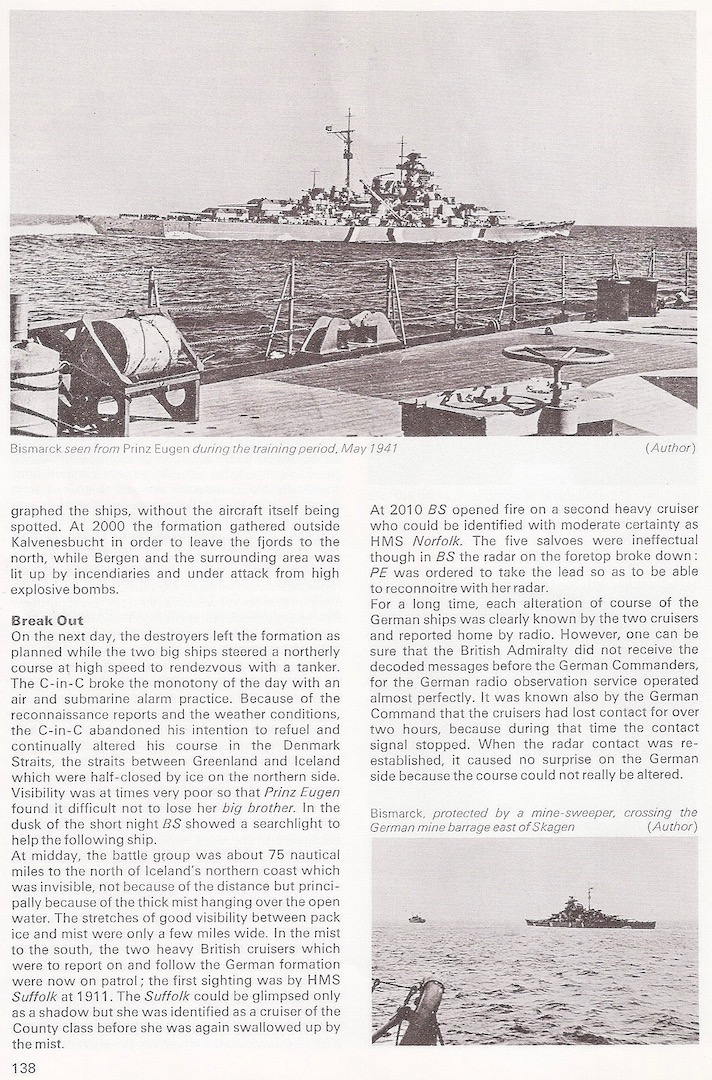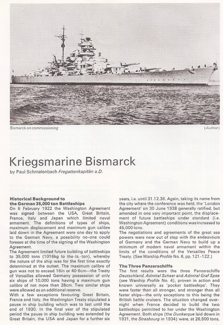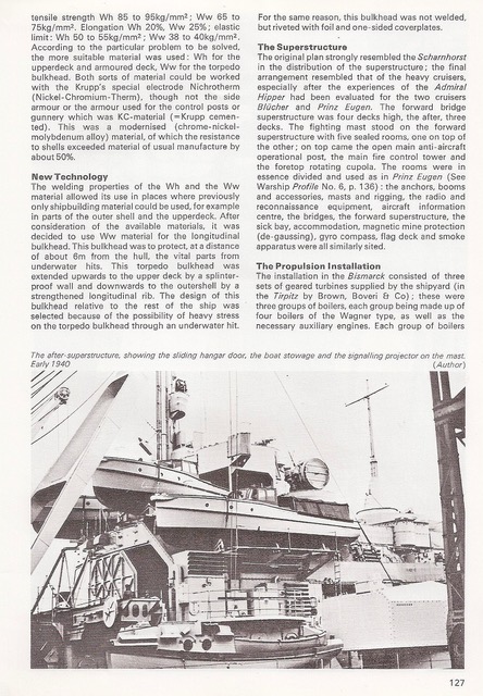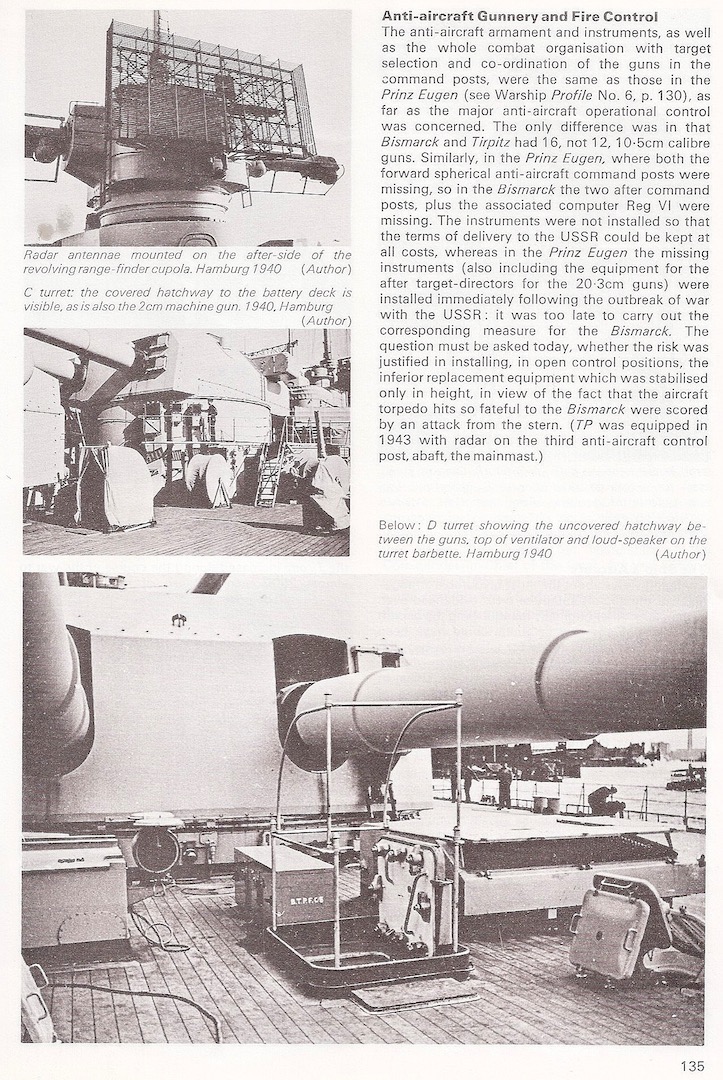 Что же касается камуфляжа линкора Бисмарк… “В упомянутом 18-м номере журнала Warship Profile затрагивается вопрос камуфляжа линкора, упомянут “настил палубы” и “камуфляжные полосы”. Однако, по свидетельствам очевидцев - выживших членов экипажа линкора - весь камуфляж был закрашен, и, по каким-то причинам, верх орудийных башен был желтого (!) цвета. Восприятие данного факта, на установление которого потребовался 31 год, выглядит несколько проблематичным,” - пишет Ситфорд в 1972-м году.