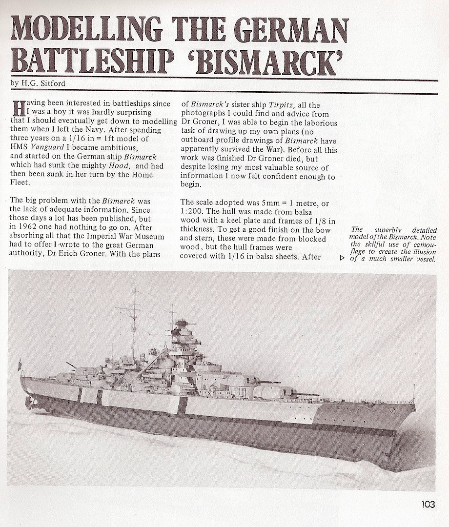 Англичанин Ситфорд (H.G.Sitford) закончил работу над моделью 1:200 линкора Бисмарк в конце 60-х гг. В 1970-м году Ситфорд получил серебрянную медаль на выставке моделей (Model Engineer Exhibition, проводится с 1907 года и по сей день). После этого, по соглашению с автором, Национальный морской музей в Лондоне разместил его линкор в галерее Второй мировой войны.