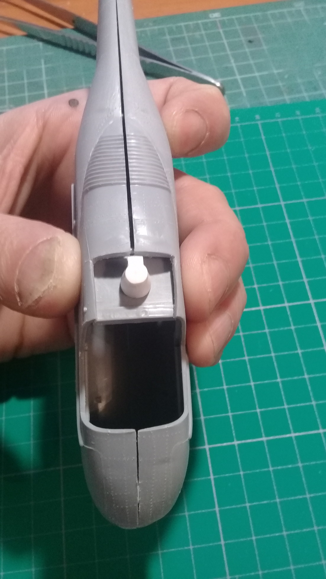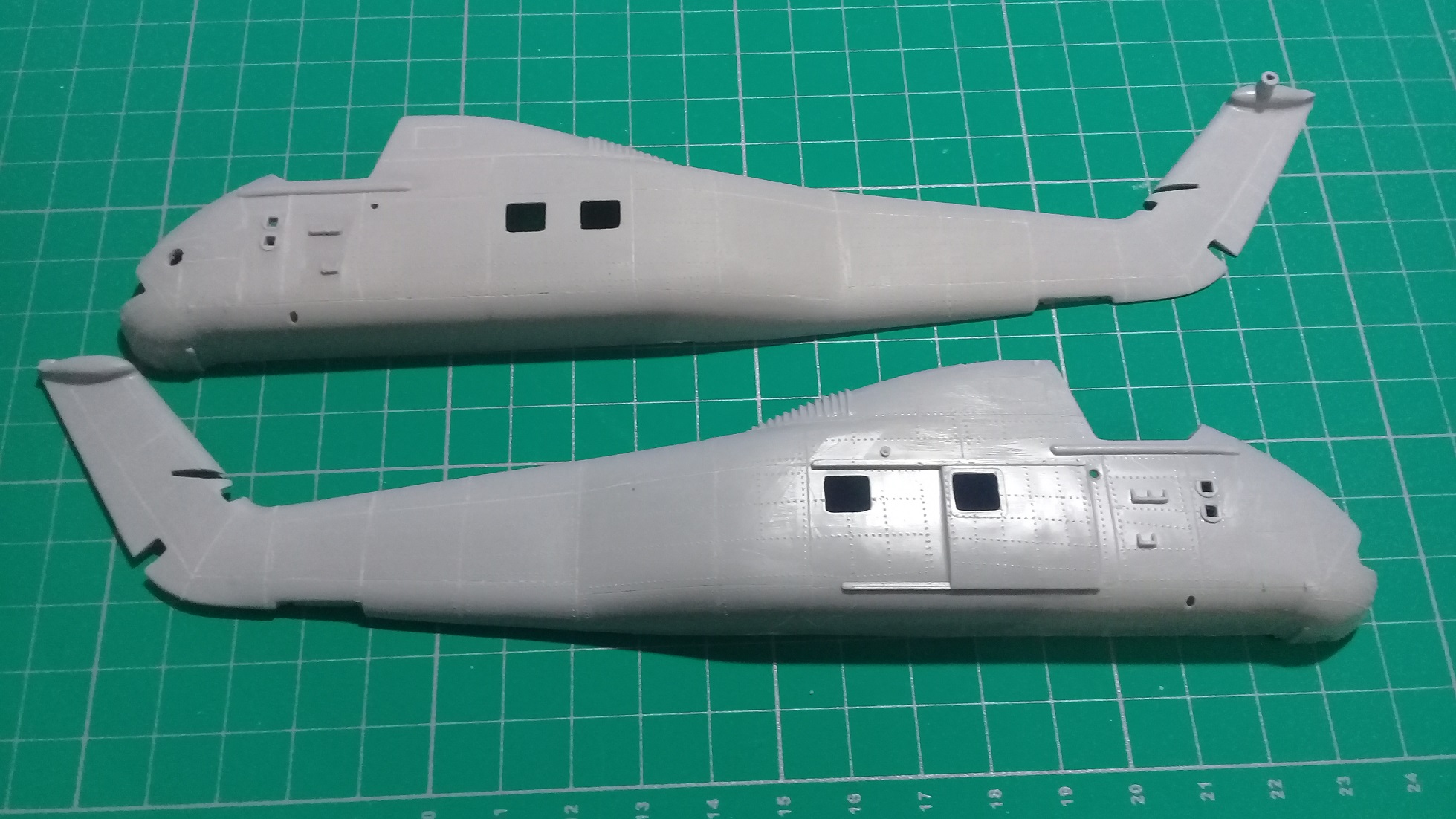 Немного хирургии с фюзеляжем.... кривовато получилось-опыта нет. Прорезал расшиву, нанес клеп. Срезал верх под редуктор. Заготовка редуктора с площадкой. Наклеял заготовку верхнего пульта на стекло. Заготовка перегородки с огнетушителем и аптечкой...