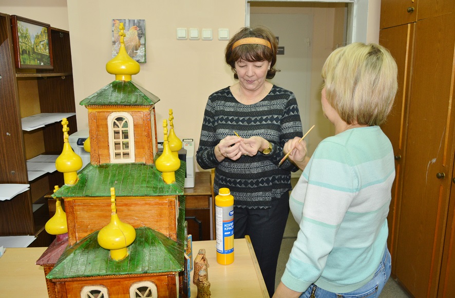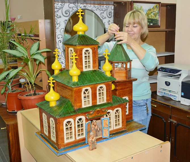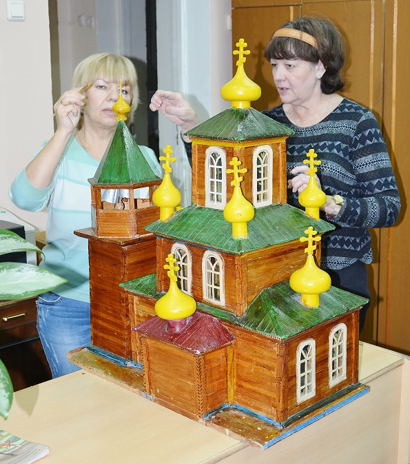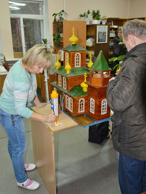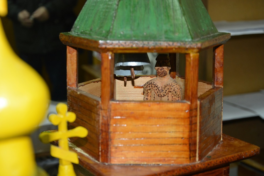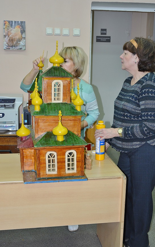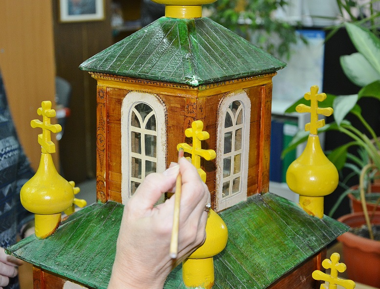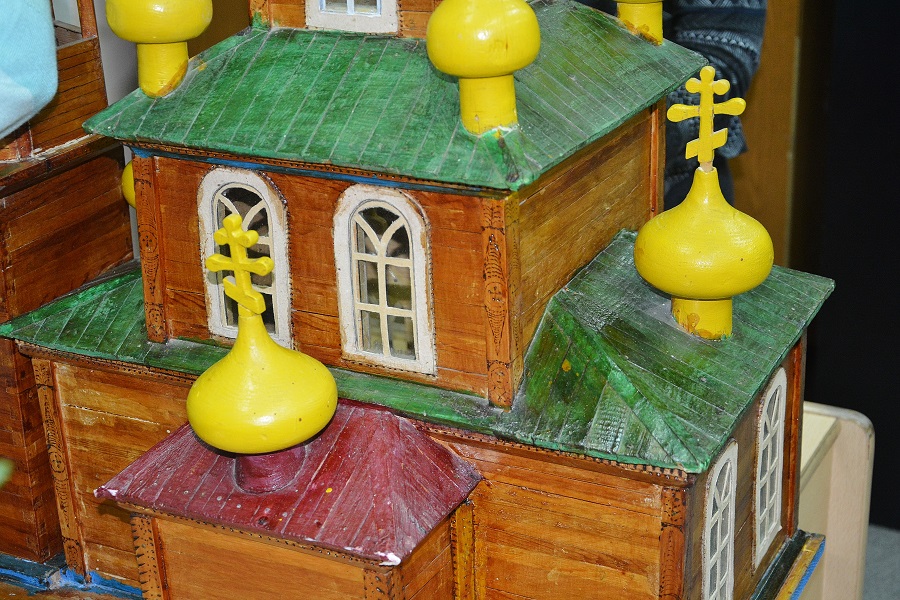 Да я ничего и не переделывал и не добавлял. Просто собрал то, что было отломано. Все "луковки" и крестики валялись отдельно, колокольня была раздавлена, окошки некоторые выпали и т.д. Конечно оставим именно в таком виде, это ж все таки музейный экспонат. Девушки наши лишь кое где подкрасили сколы да пятна от древнего почерневшего клея. На колокольне крестик отсутствовал, ушел в анал истории. :-( Пока воткнули зубочистку, типа - шпиль. :-)