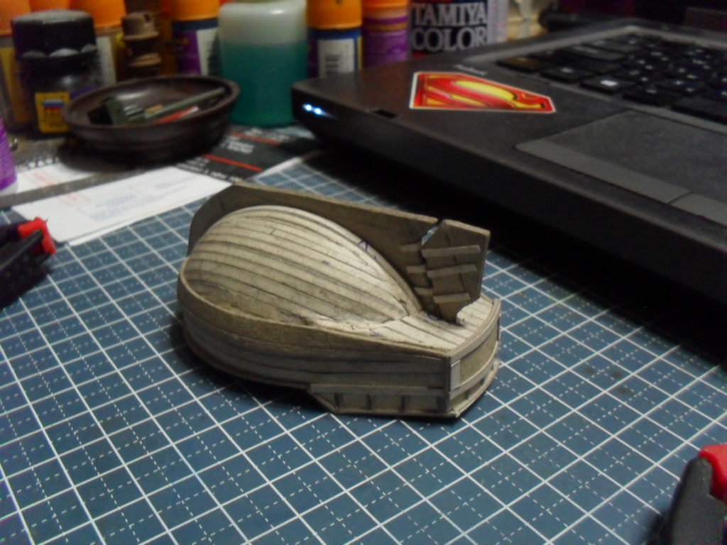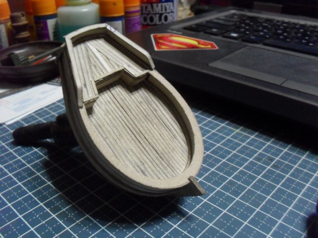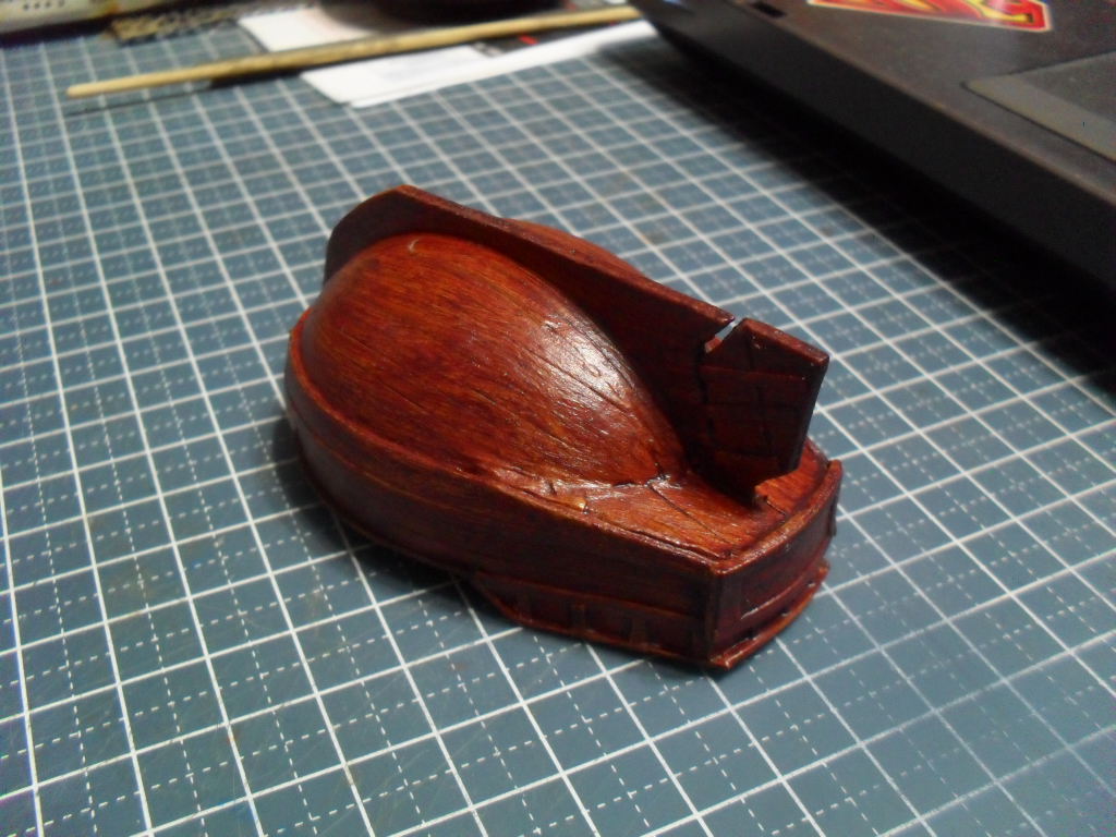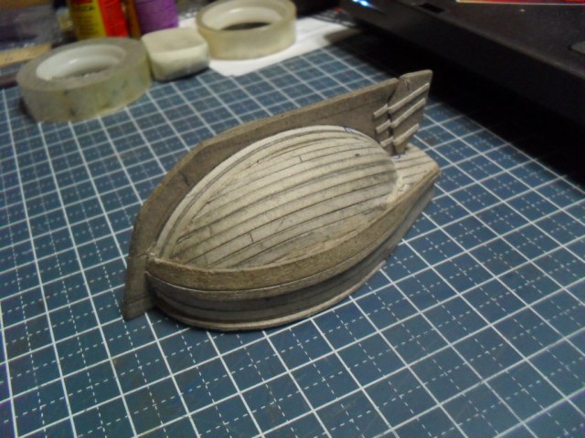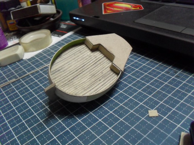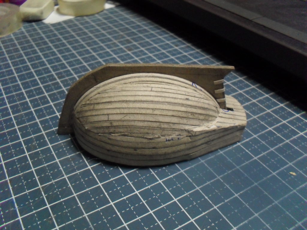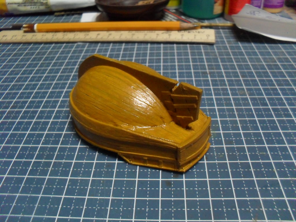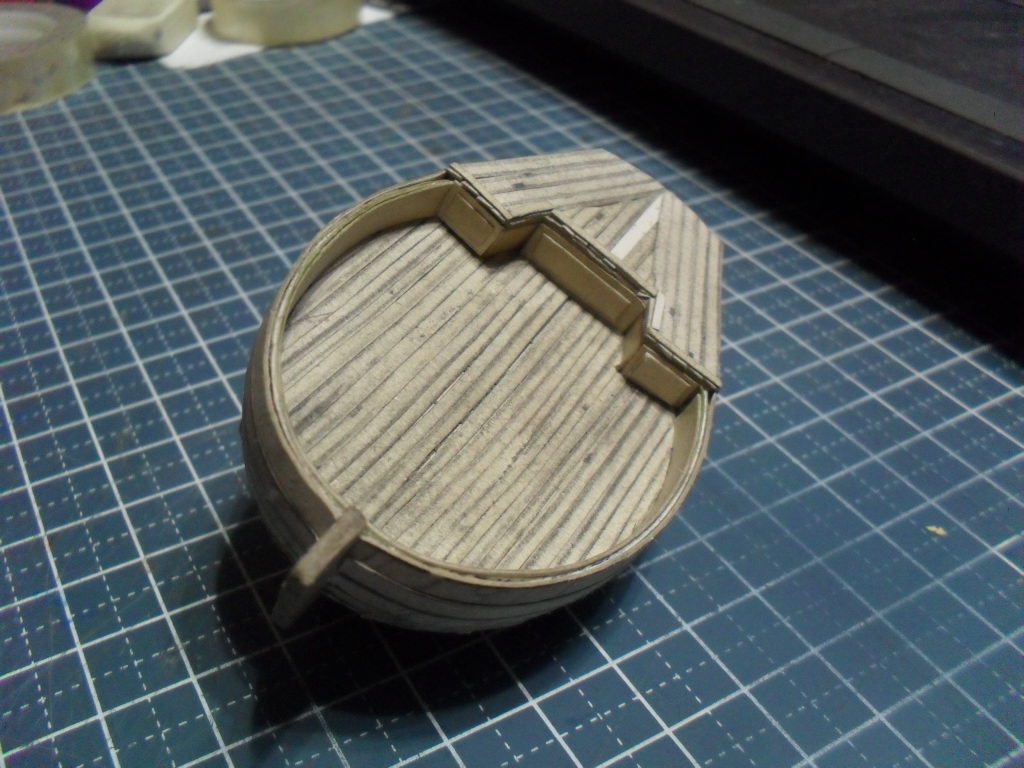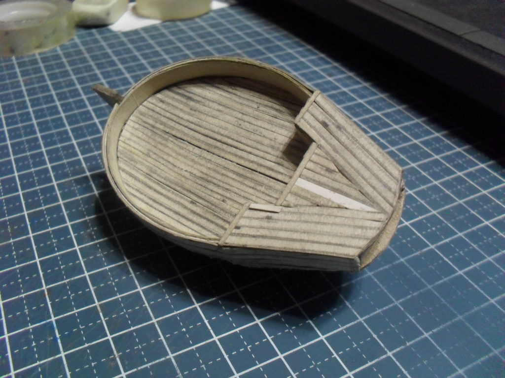 Распилил, смыл газету, заполнил заготовку баластом, наклеил палубу.