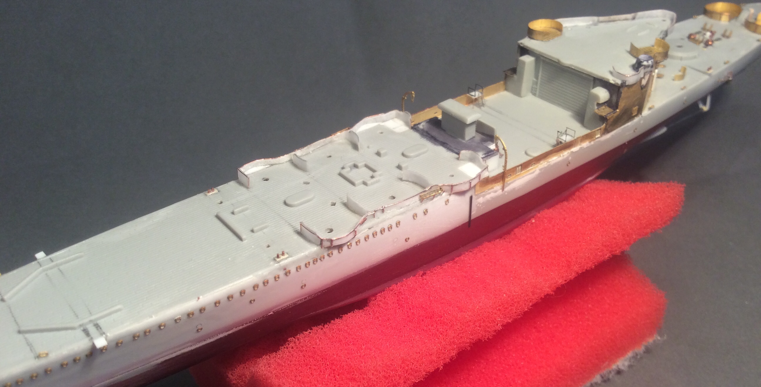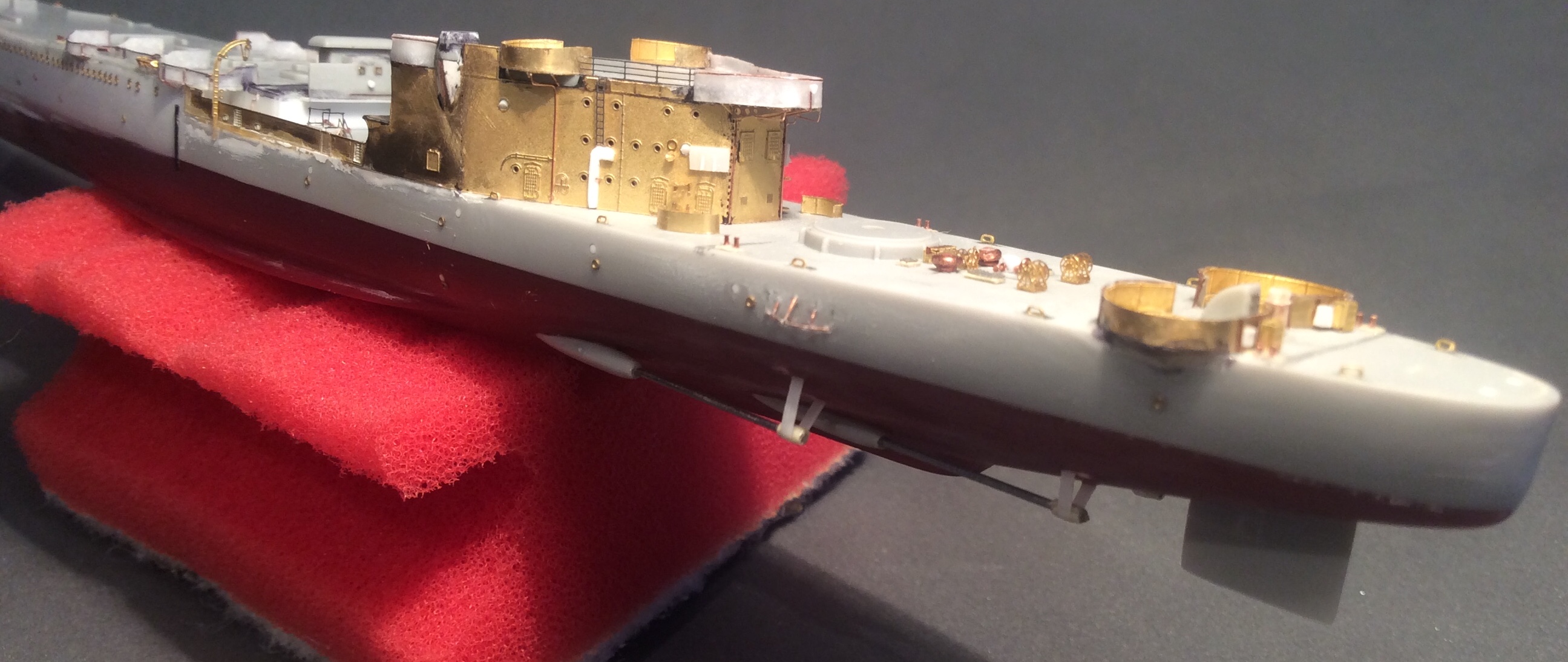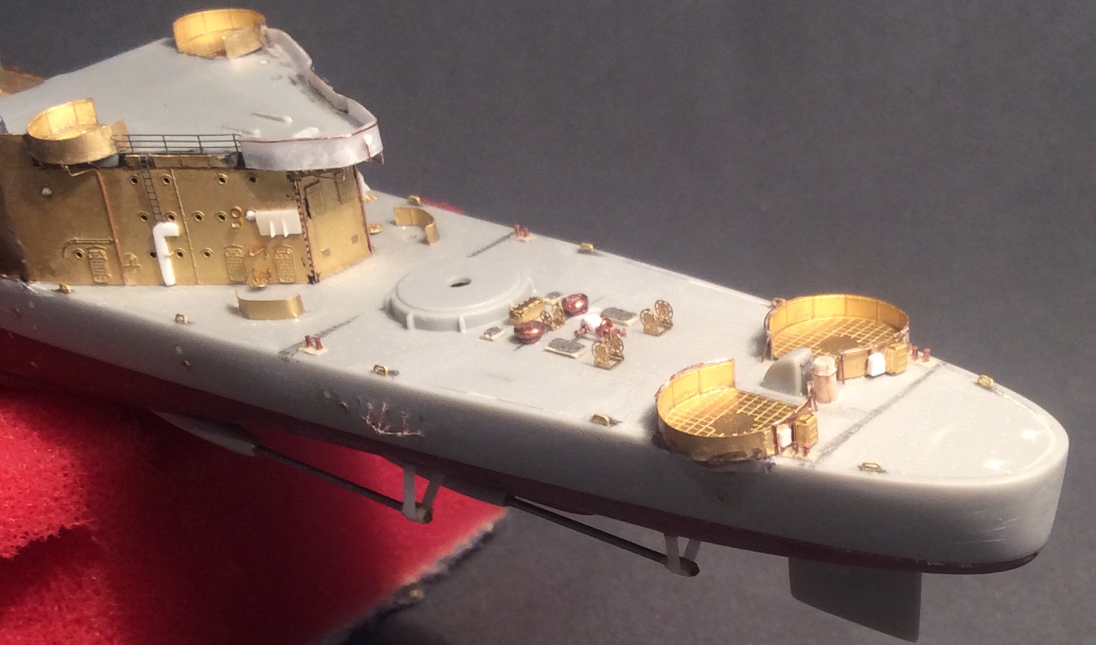 Пока прогресс небольшой. Заделаны те недоразумения,которые производитель пытался выдать за иллюминаторы и наклеены травленые. Сделаны ограждения винтов из проволочки. Срезал с палубы все лишние элементы и начал восстанавливать мелочевку на баке. Сделаны новые якорные клюзы и срезан уродливый броневой пояс. «Вживил» фототравление вместо пластикового фальшборта перед кормовой надстройкой и установил основу кормовой надстройки.
