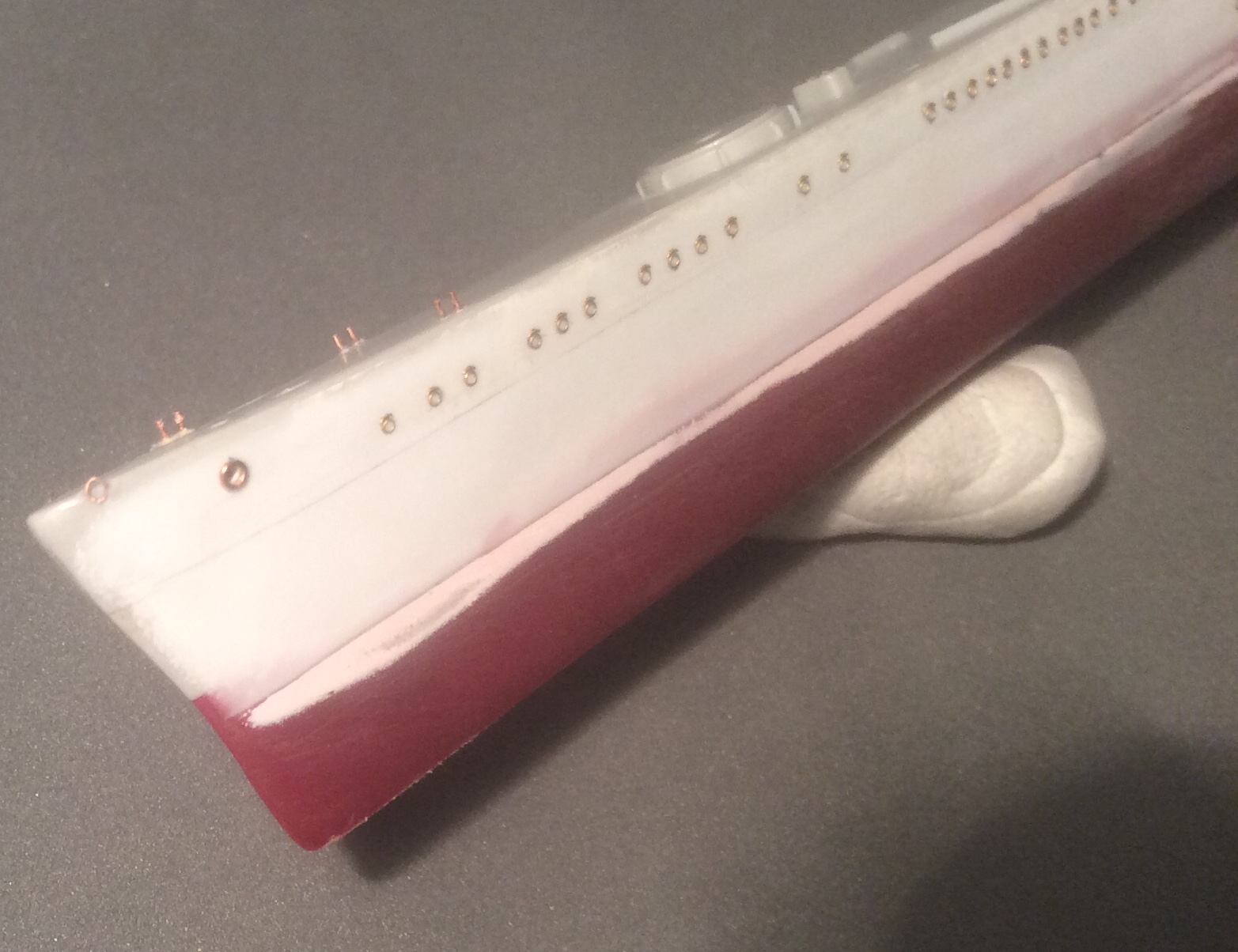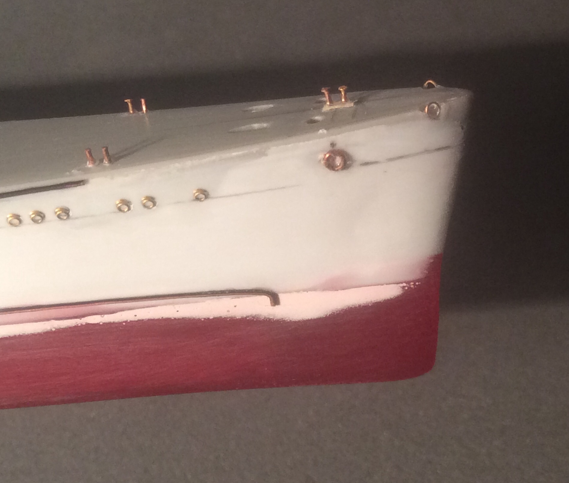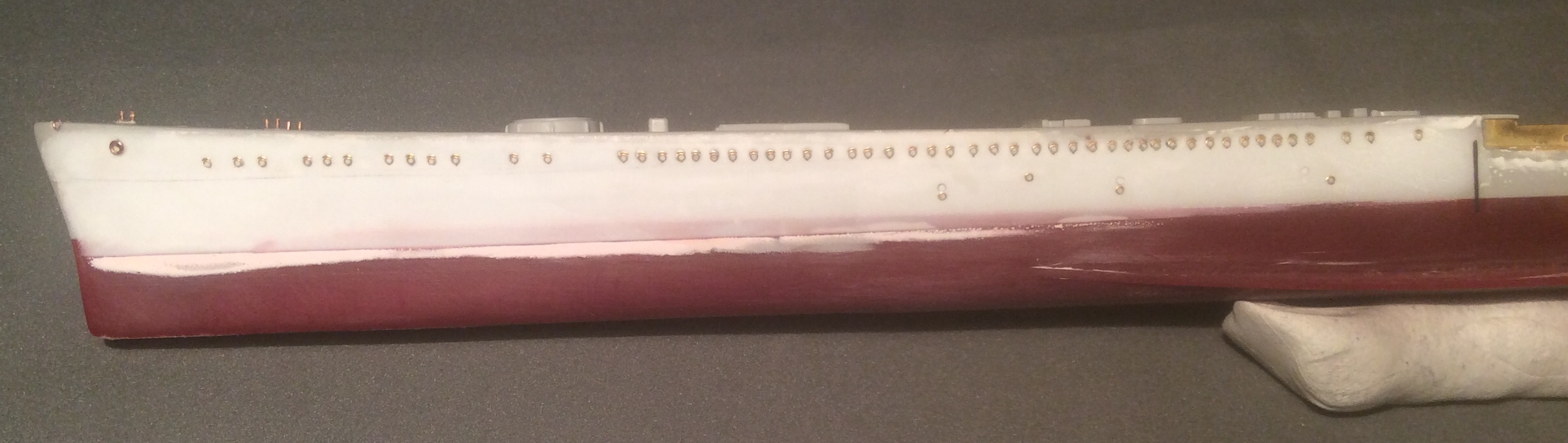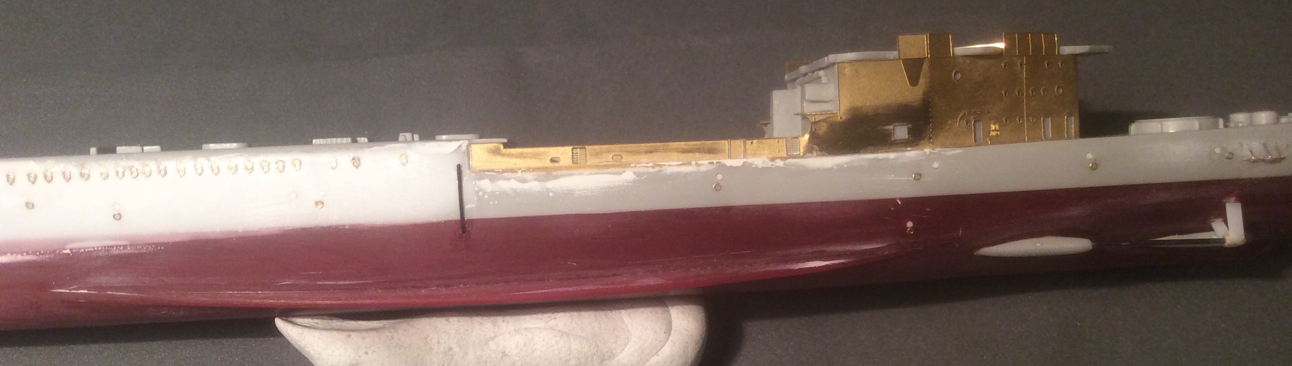 Пока прогресс небольшой. Заделаны те недоразумения,которые производитель пытался выдать за иллюминаторы и наклеены травленые. Сделаны ограждения винтов из проволочки. Срезал с палубы все лишние элементы и начал восстанавливать мелочевку на баке. Сделаны новые якорные клюзы и срезан уродливый броневой пояс. «Вживил» фототравление вместо пластикового фальшборта перед кормовой надстройкой и установил основу кормовой надстройки.