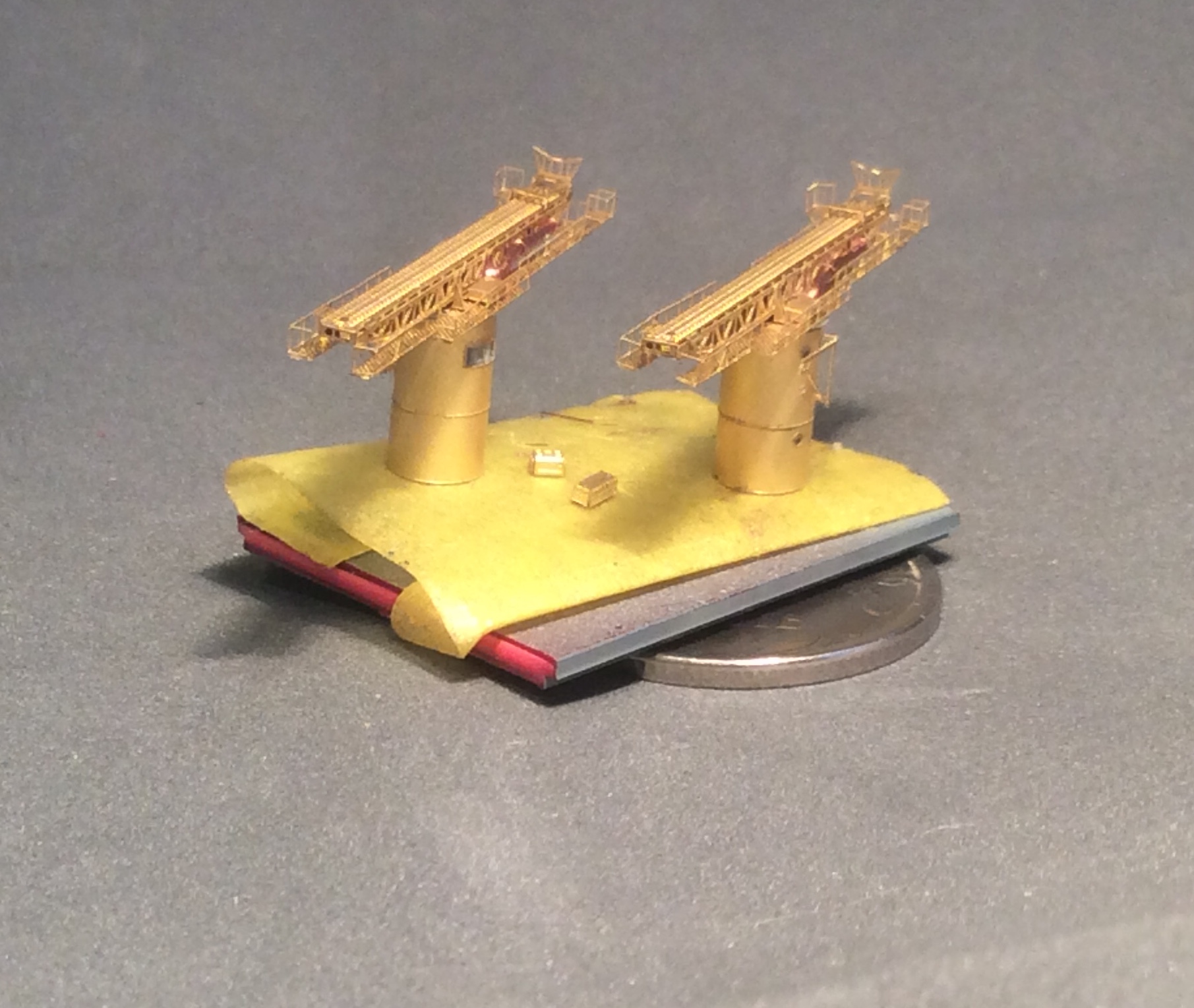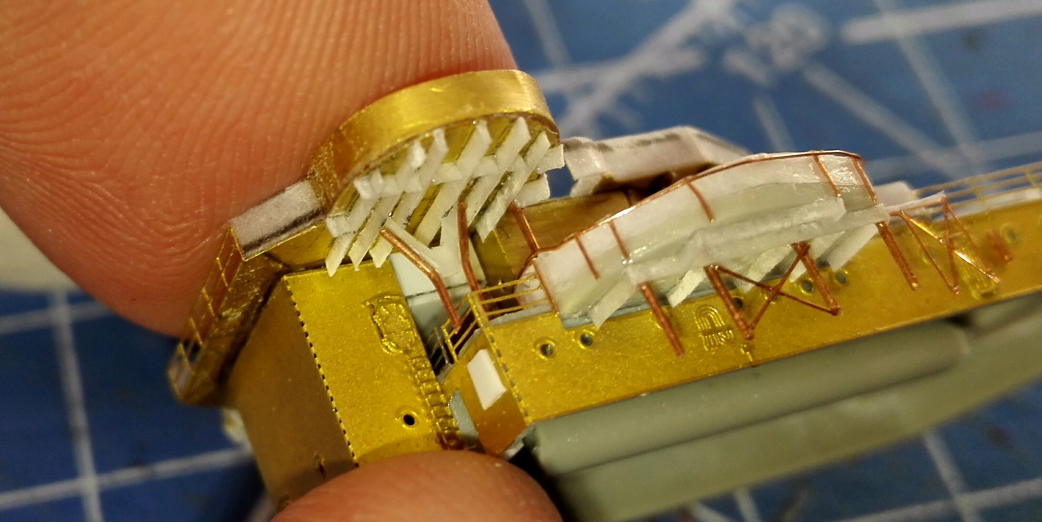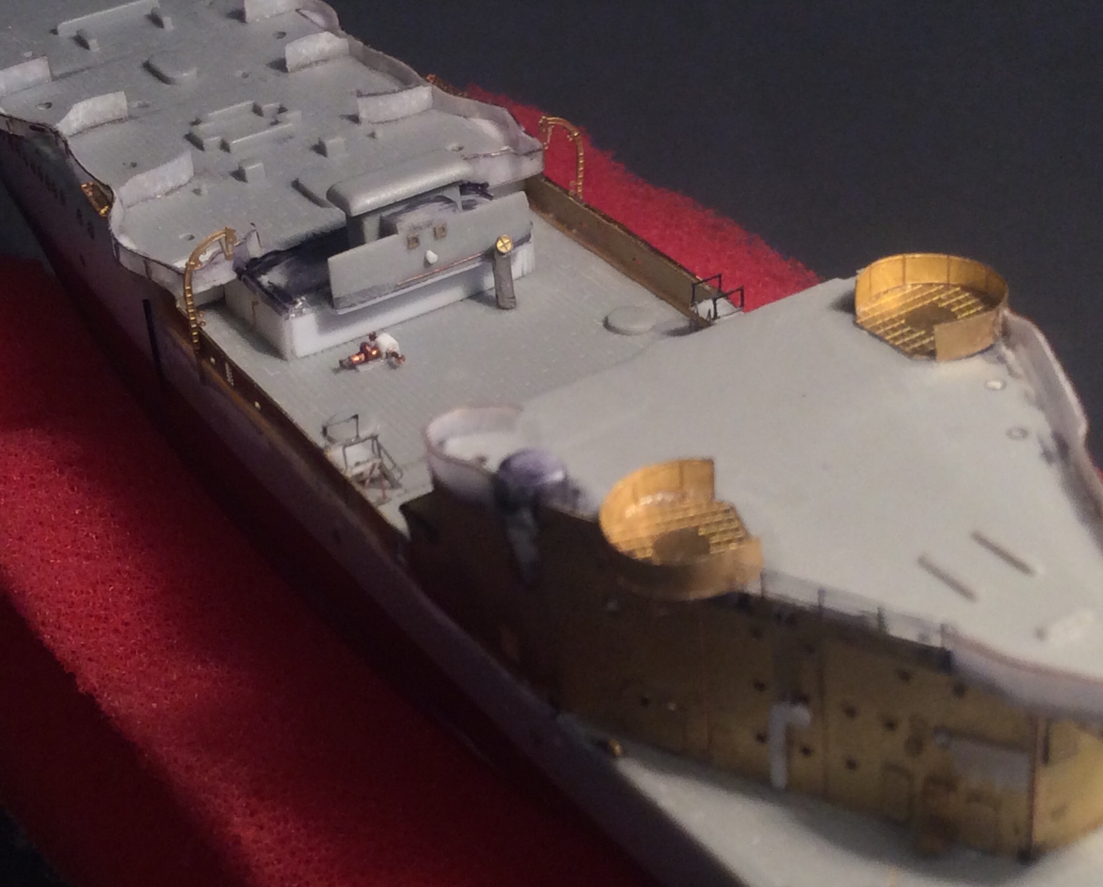 Установил площадки счетверненных бофорсов (которые правда больше подходят под спаренные,но это начал постигать слишком поздно),сделал новое ограждение из пропитанной суперклеем бумаги. По фотографиям прототипа навесил всякой мелочевки на стенки надстройки. Установил по фотографиям и по бумажной модели две лебёдки(одна на корме и одна перед катапультами),сделал сами катапульты,немного доработал их и сделал постаменты. Так же сымитировал всякую мелочевку в носовой частях,на корме.