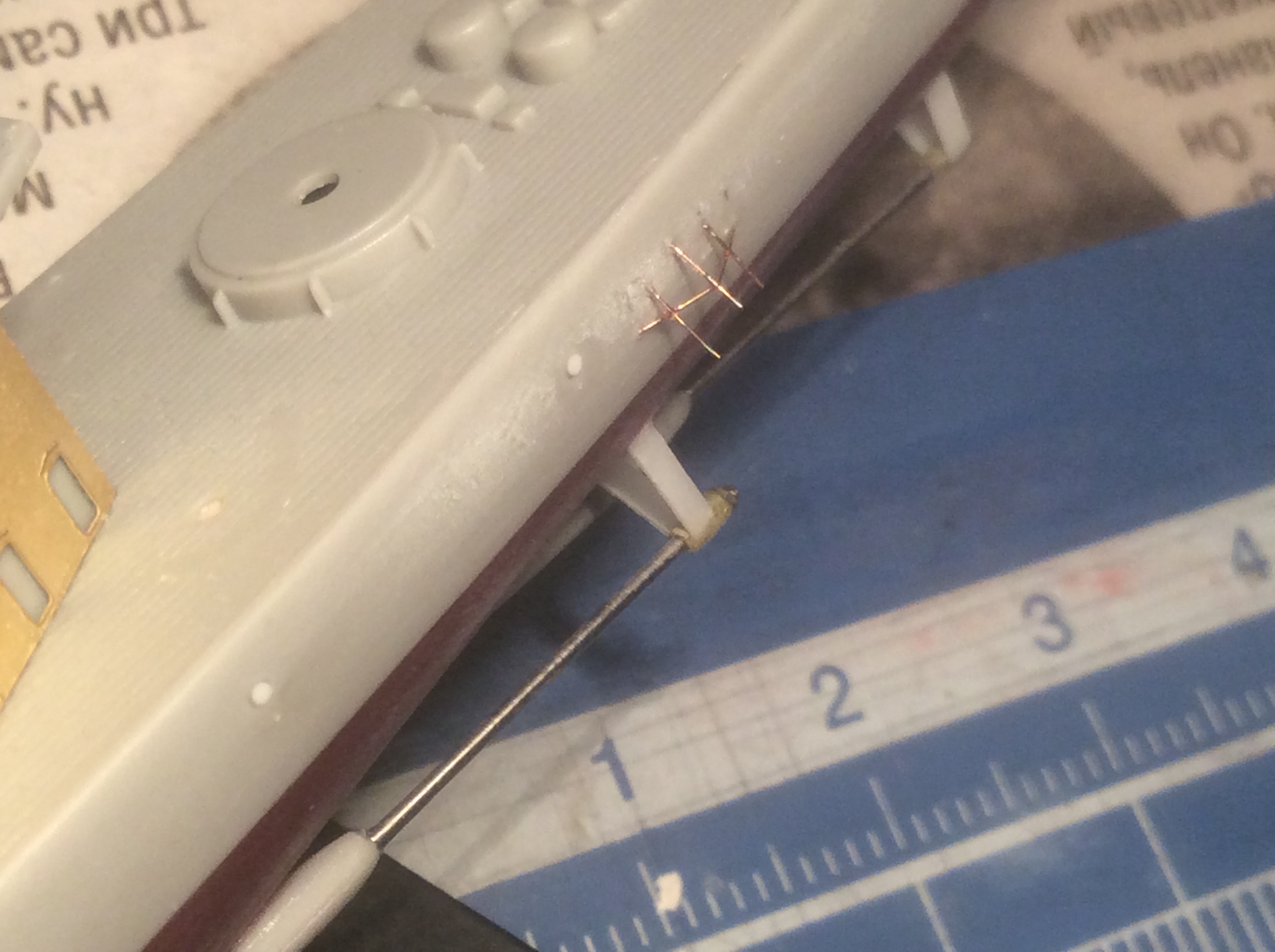 Первой подверглась переделка надстройка кормовая. Кусачками откусил и зашлифовал алмазным надфилем то,что производитель пытается выдать за ограждение. В действительности ограждение было не таким,плюс на участке,на котором Five star даёт сплошное ограждение должно быть леерное. Сместил опору крана для подъема самолётов к левому борту на самый срез и сымитировал характерную конусовидную опору (?). На правом борту постарался зашлифовать имитацию подобной опоры,данную производителем травла.