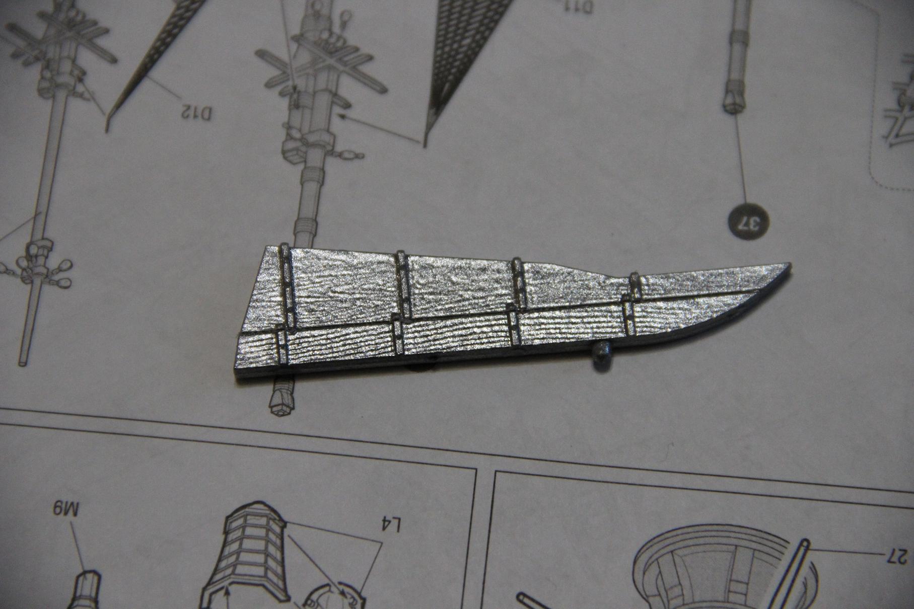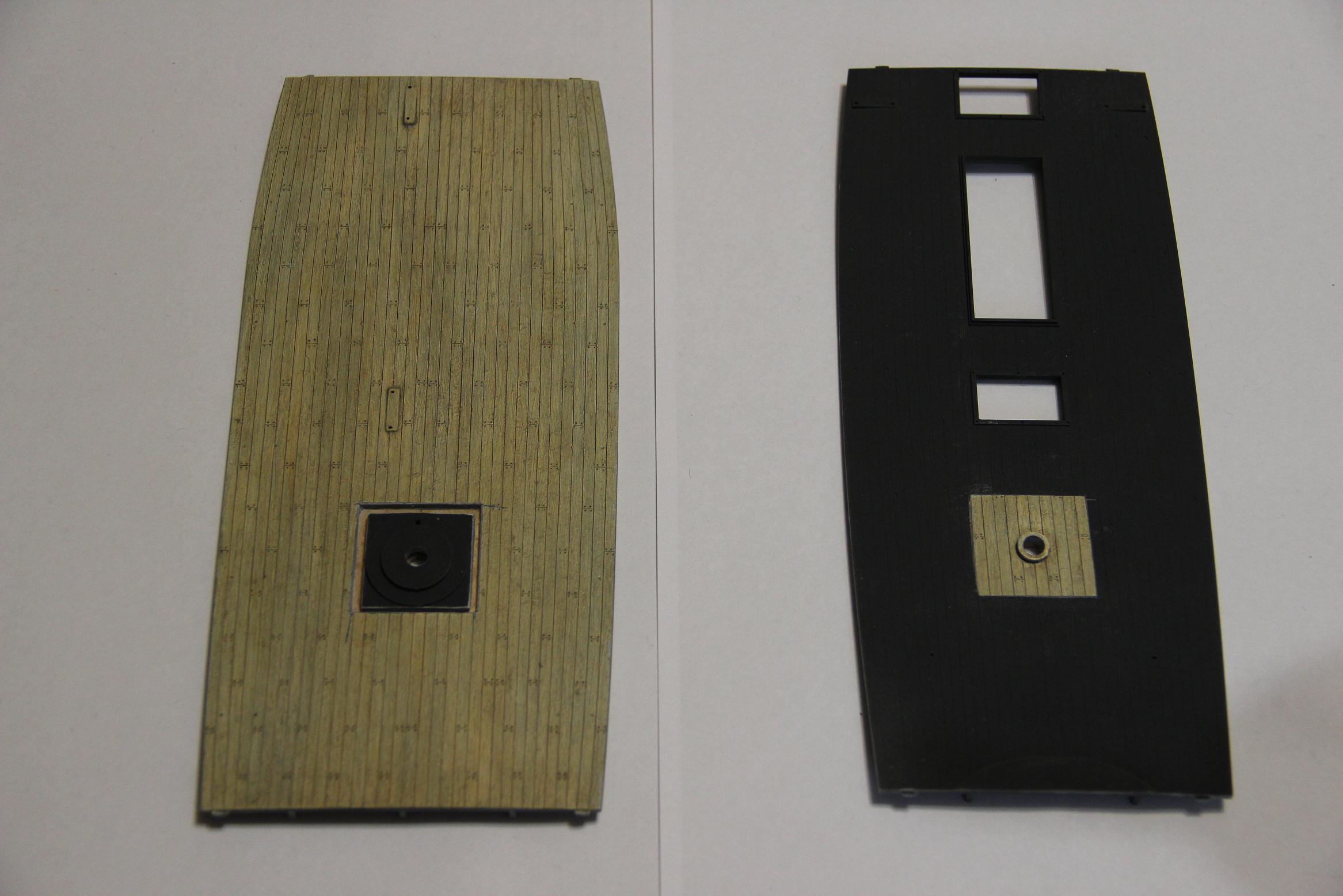 - с верхней палубы это безобразие убрать (вырезать) и вклеить с нижней, там нету этих ступней под шпиль, а на нижнюю вклеить с верхней (даже по рисунку укладки палубных досок должно подойти).