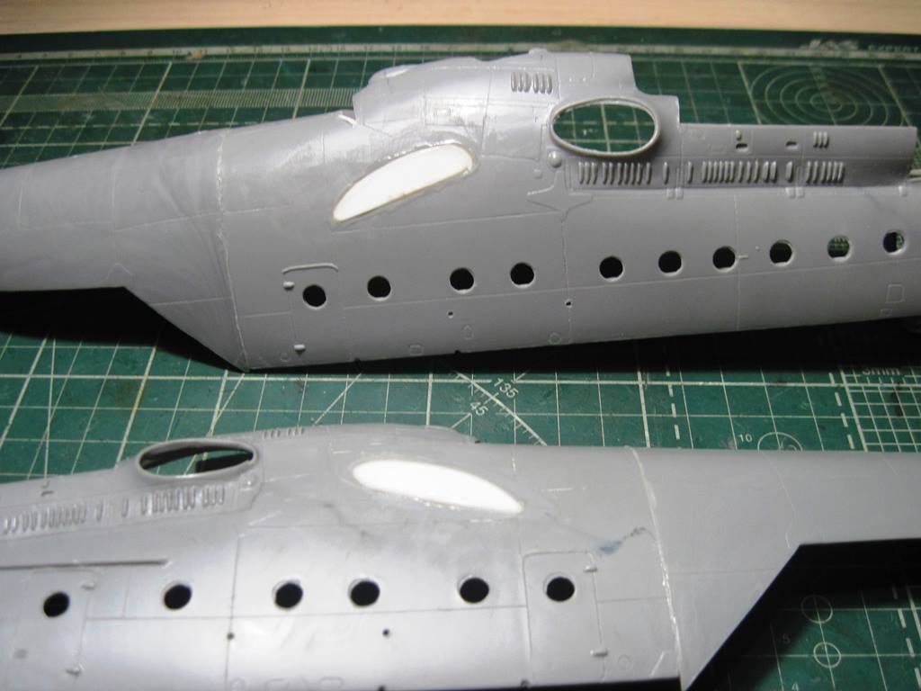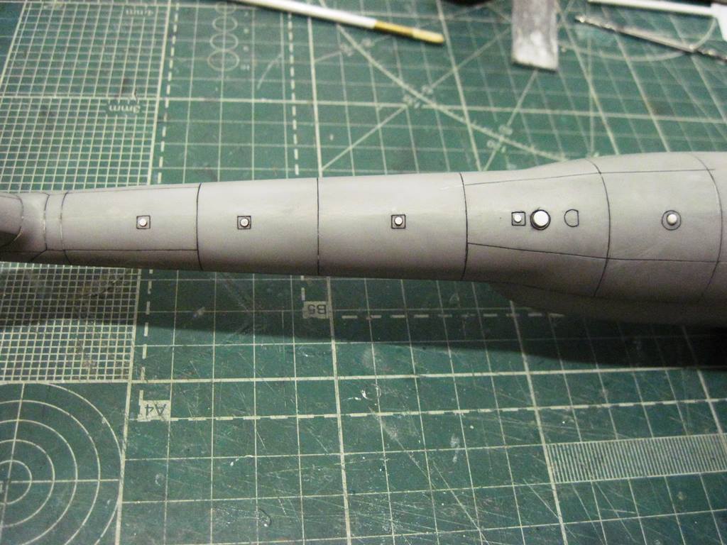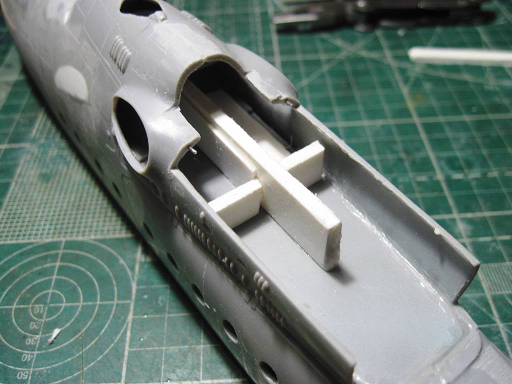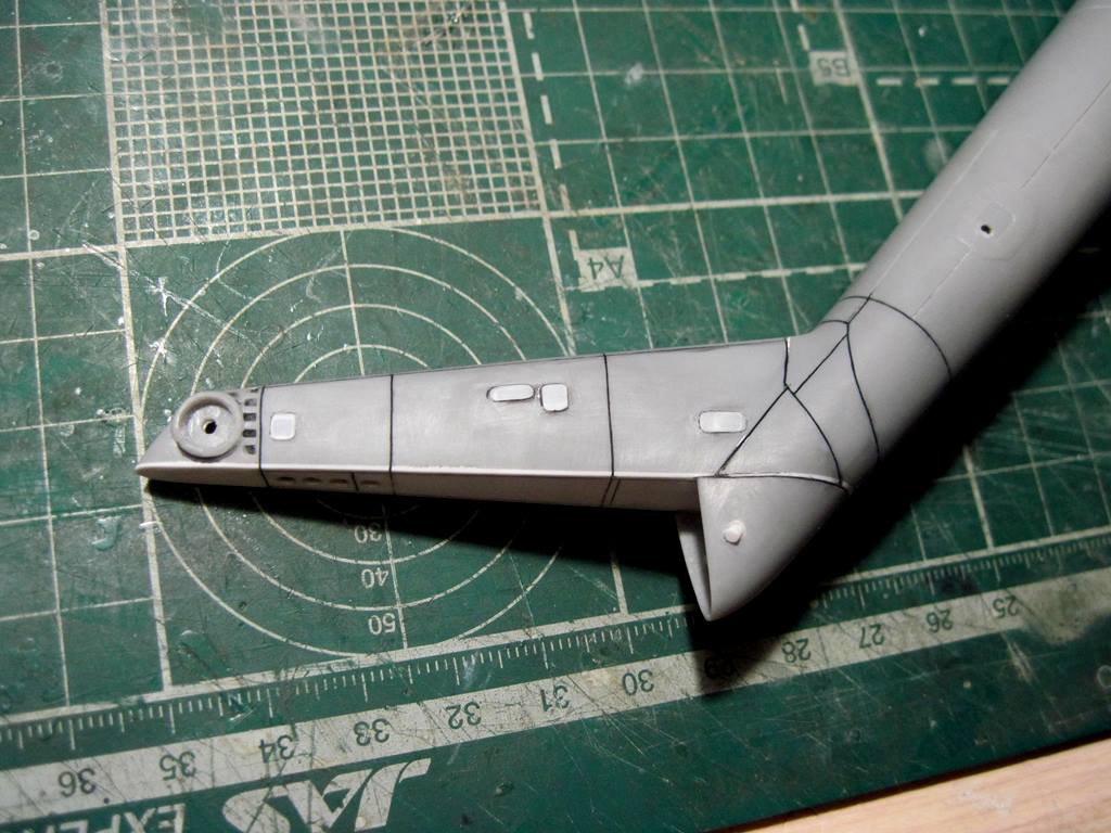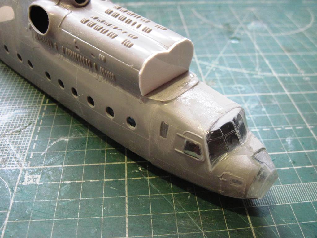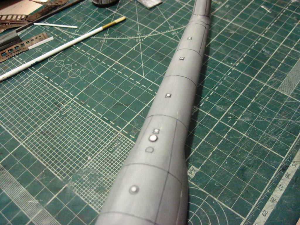 На хвостовой балке сверху прутками имитировал основание под проблесковый маяк, люк подхода к датчику курса ДАК-Б и технологические окна контроля опор хвостового вала.