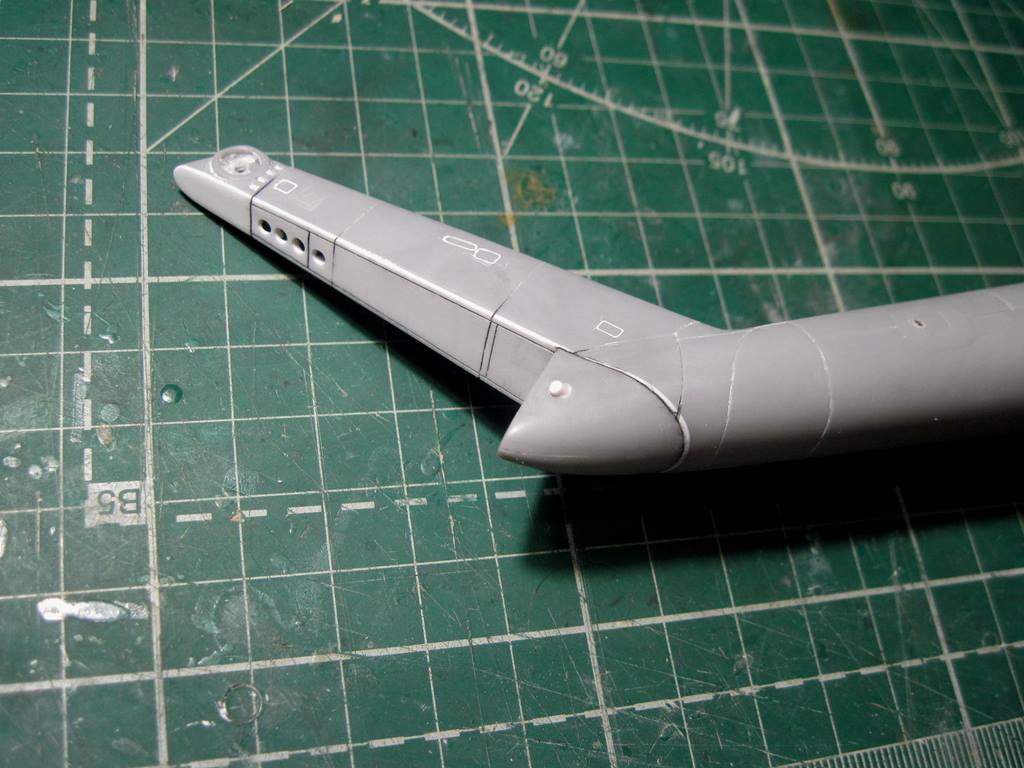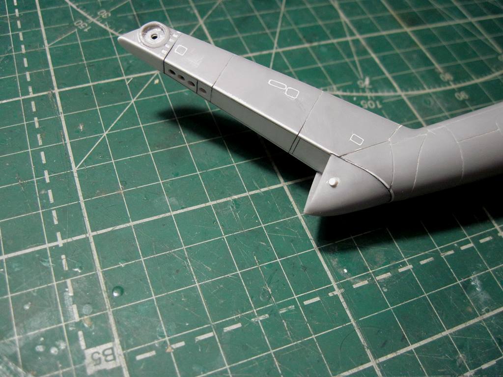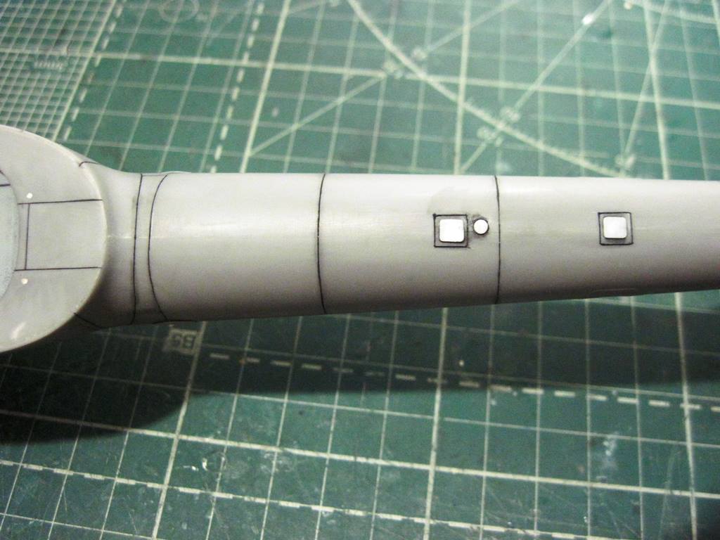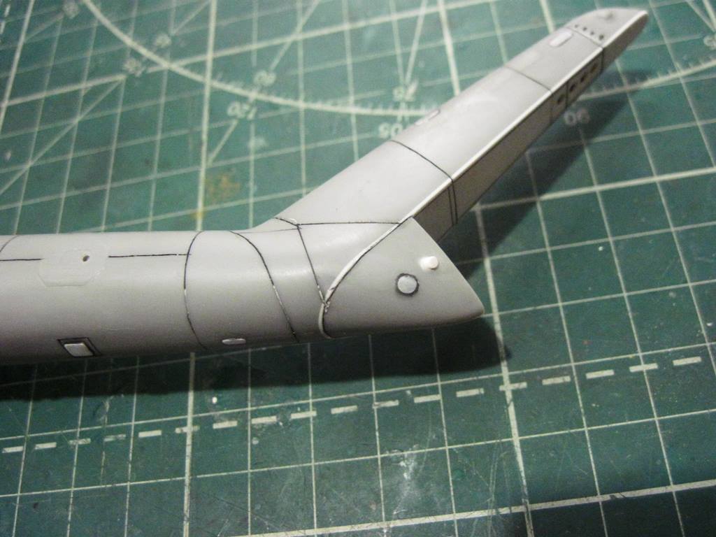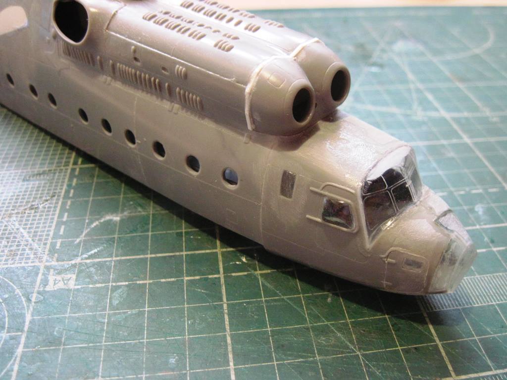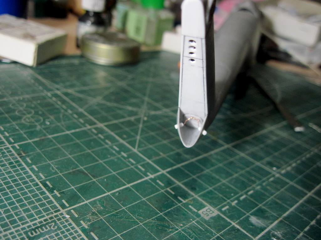 На хвостовой балке сверху прутками имитировал основание под проблесковый маяк, люк подхода к датчику курса ДАК-Б и технологические окна контроля опор хвостового вала.