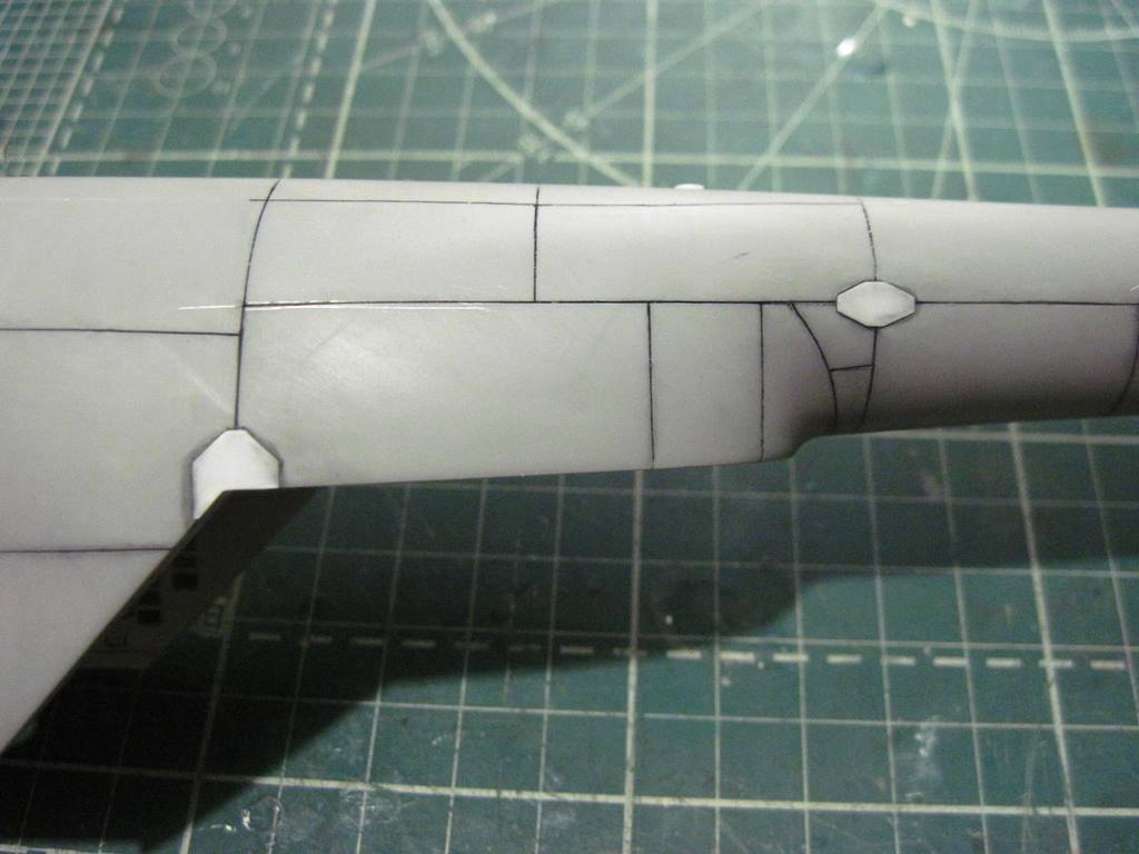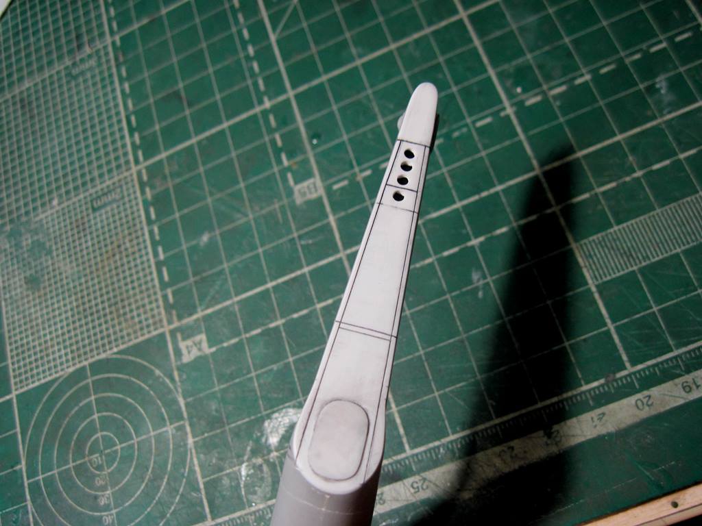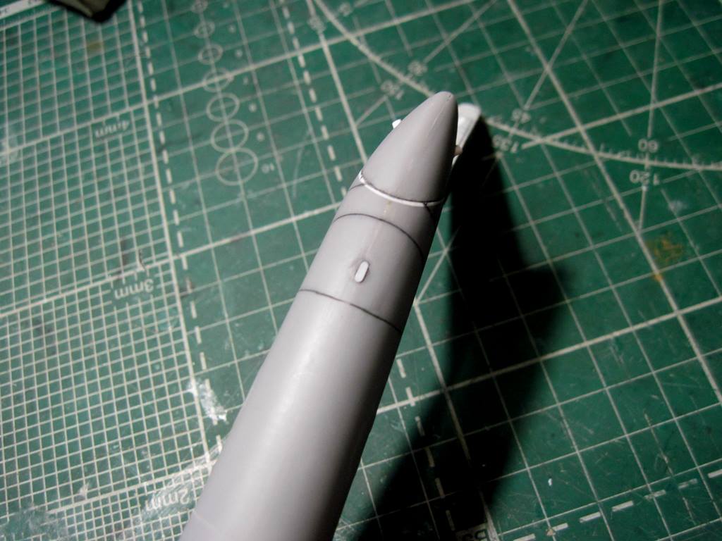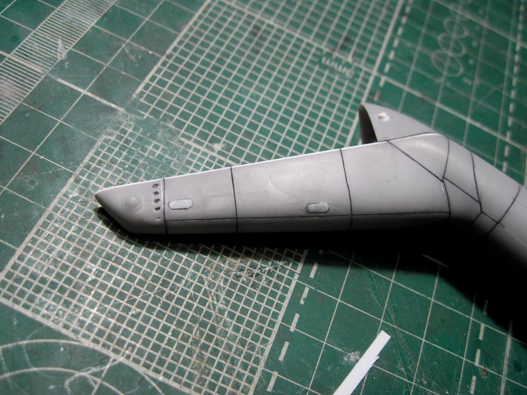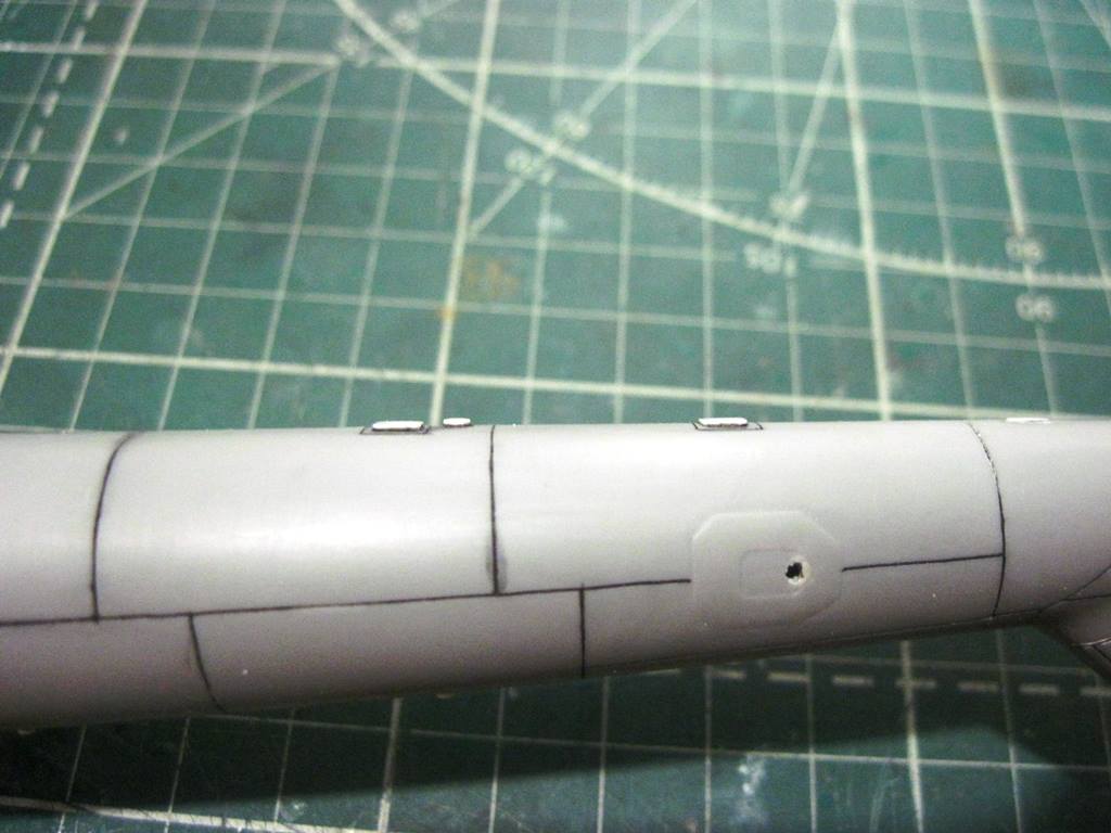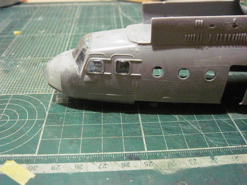На хвостовой балке сверху прутками имитировал основание под проблесковый маяк, люк подхода к датчику курса ДАК-Б и технологические окна контроля опор хвостового вала.