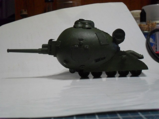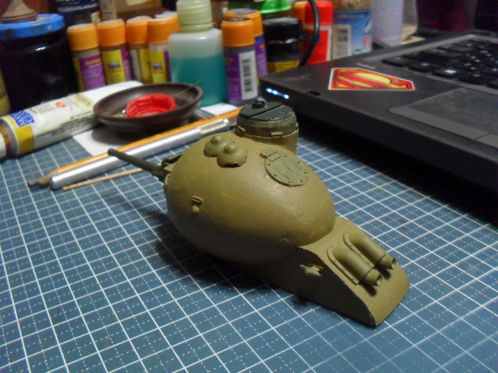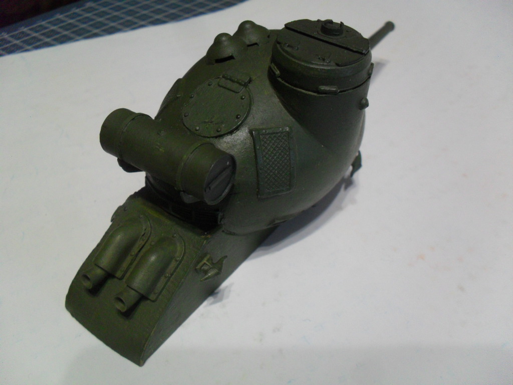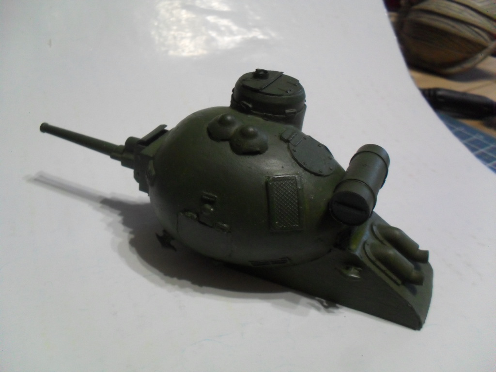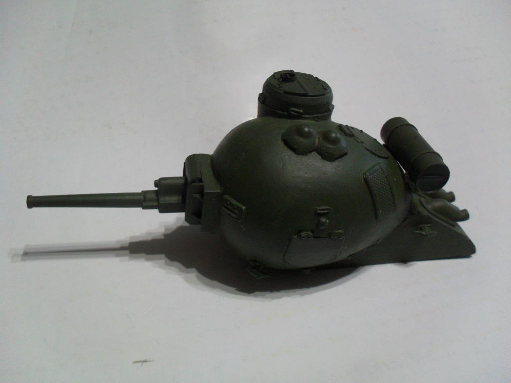 Тоже с одной гусеницей по шву вдоль яйца,а на боковинах сделать каплевидные башенки со стволами,на вроде как у танка Марк-V