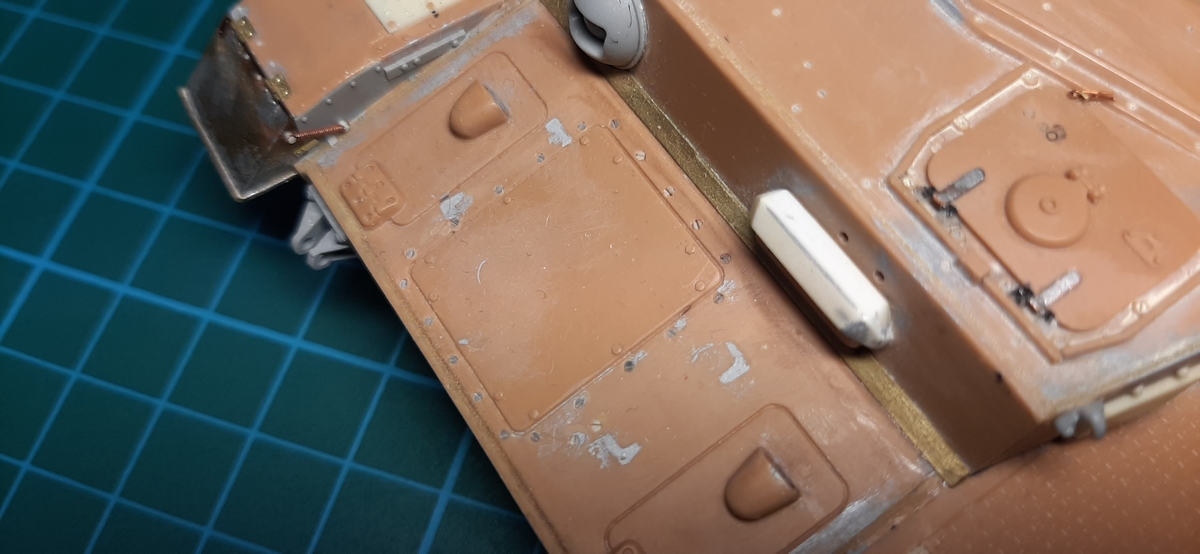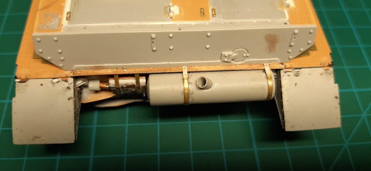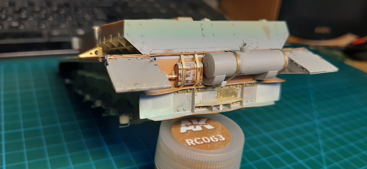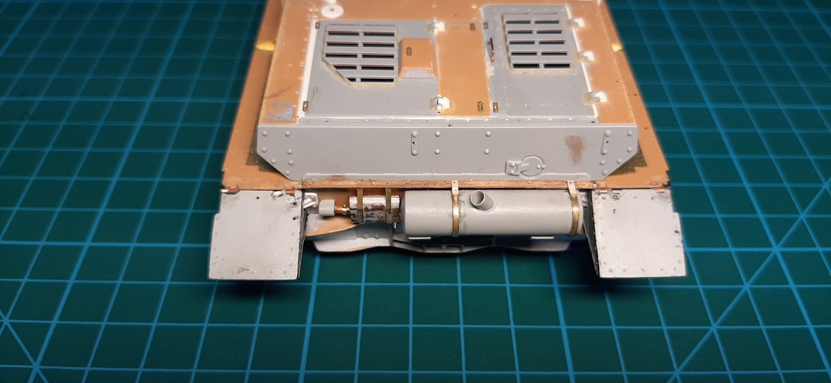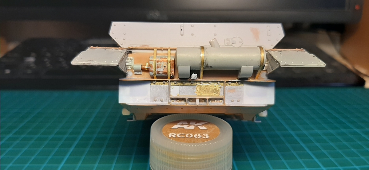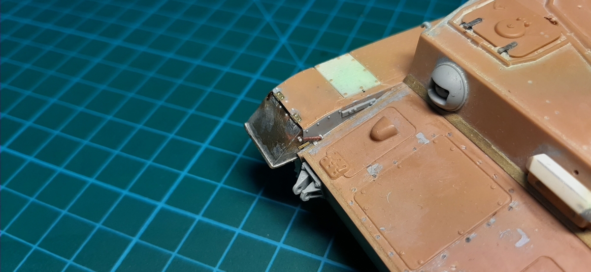 Отдельная песня с задней бронеплитой. ТУда пришлось в изобилии вклеивать головки болтов из фототравления Абер всех размеров и метизы от Мастерклуб. Ведь все что бы там не крепилось( а крепится там много всего) привинчивалось на эти самые болты и нужно было показать помимо гловки болта еще с обратной стороны и гайку и кусок болта. Вобщем весело