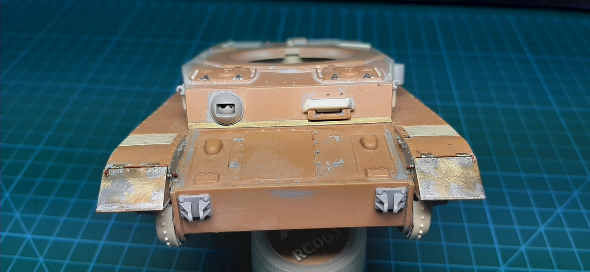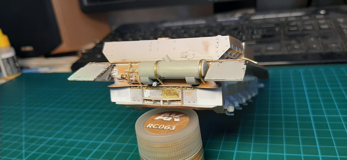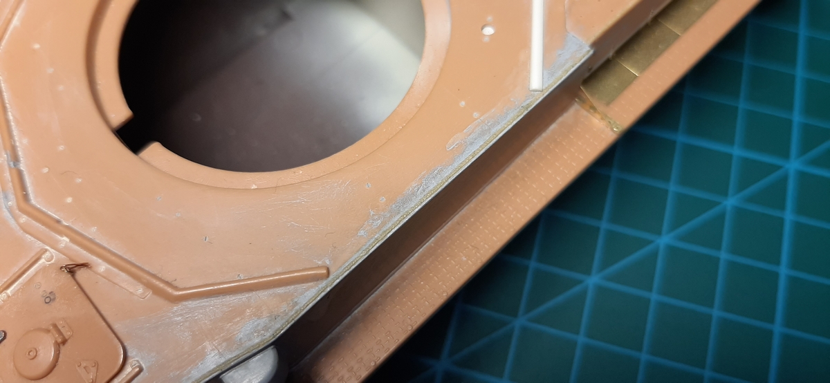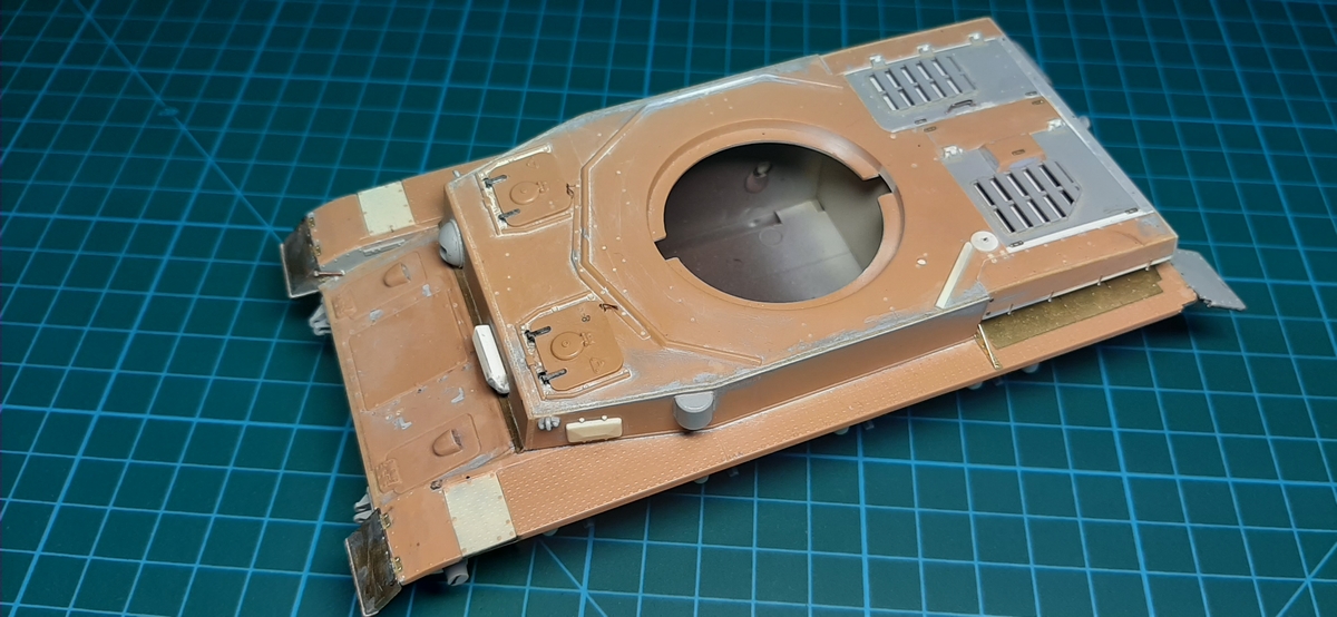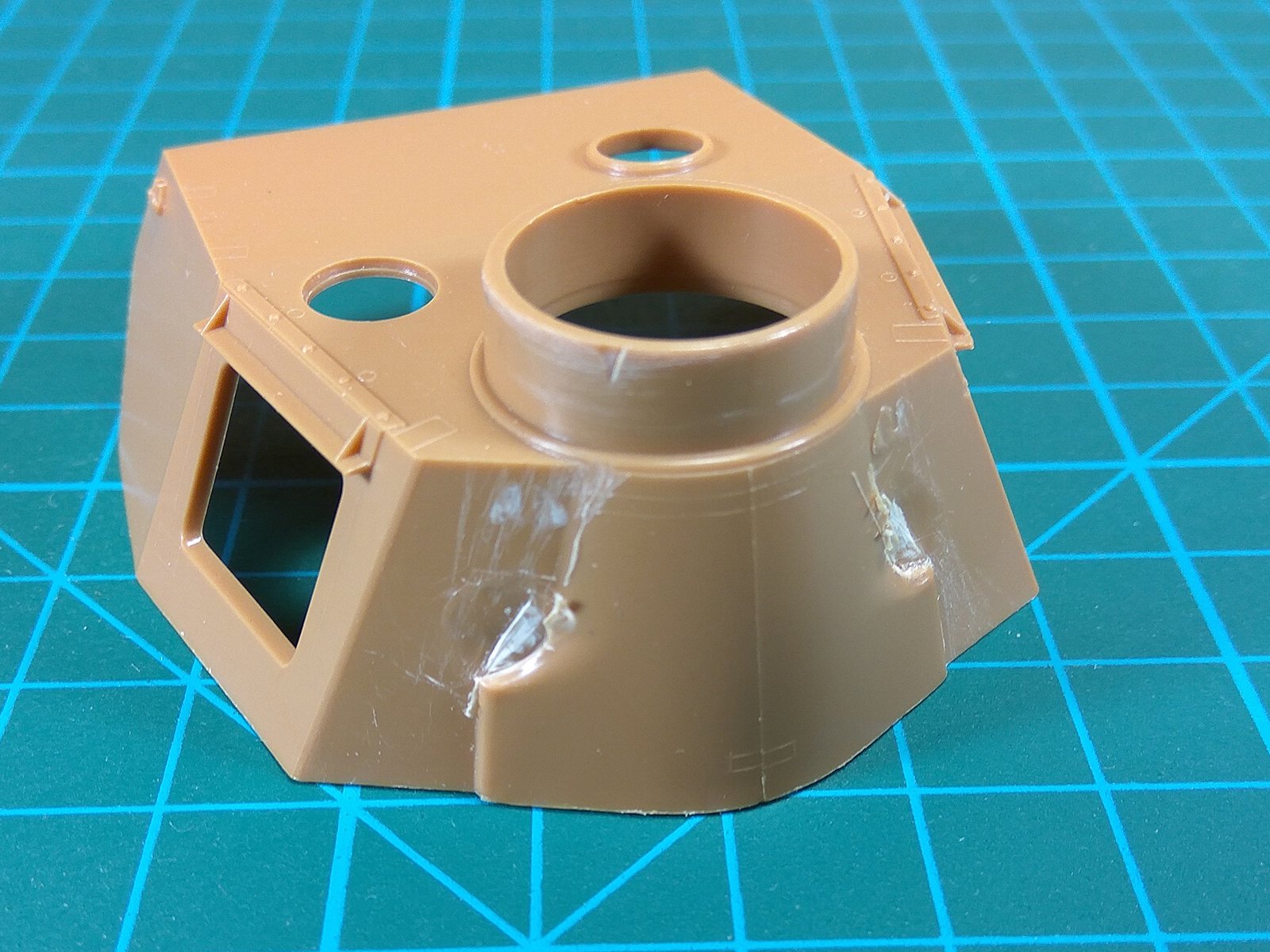 Странный выступ на заднем бронелисте башни долепил двухкомпоненткой - так выглядит похоже на реальный прототип, от простого спиливания отказался - нарушит и без того неважную геометрию модели.